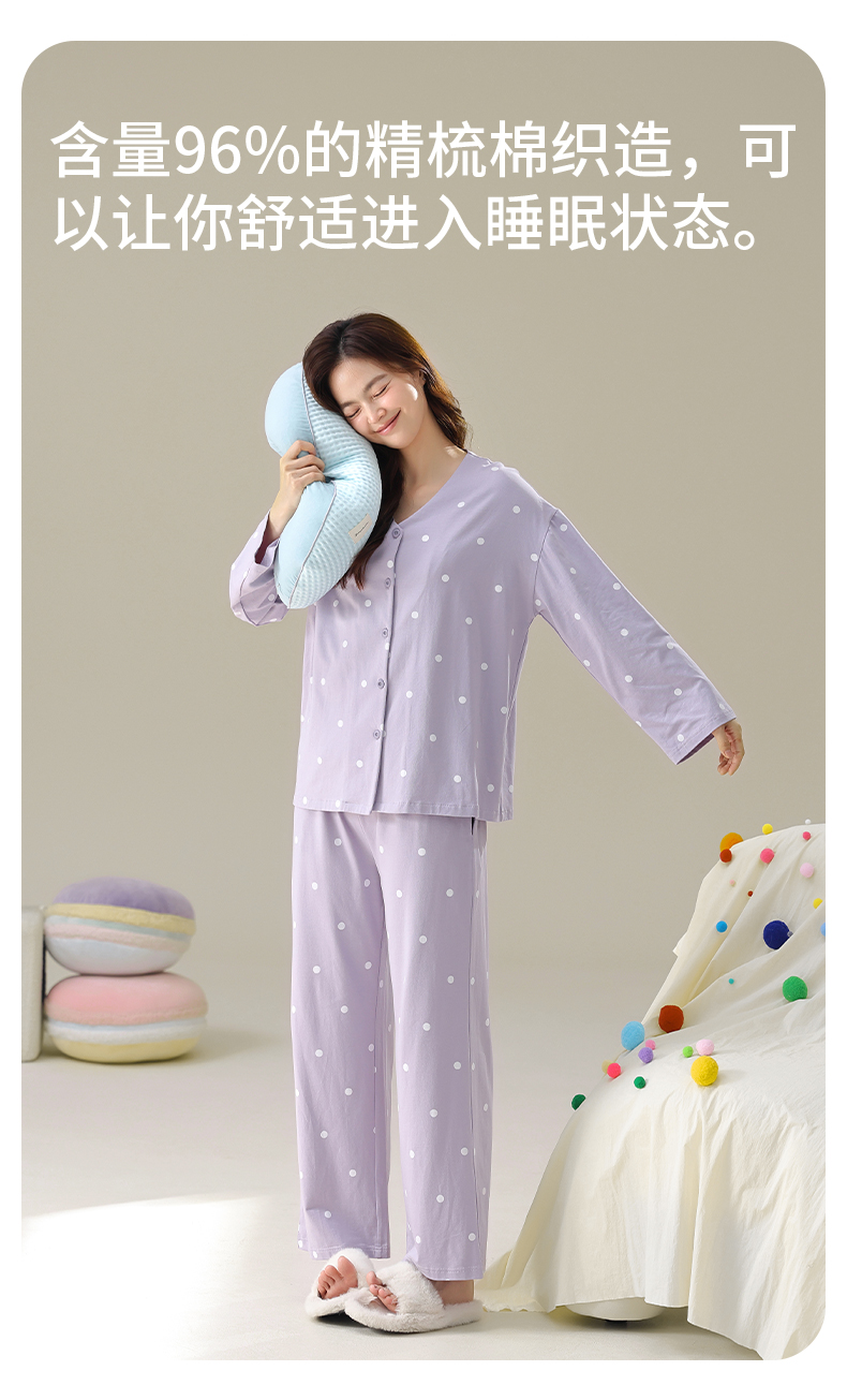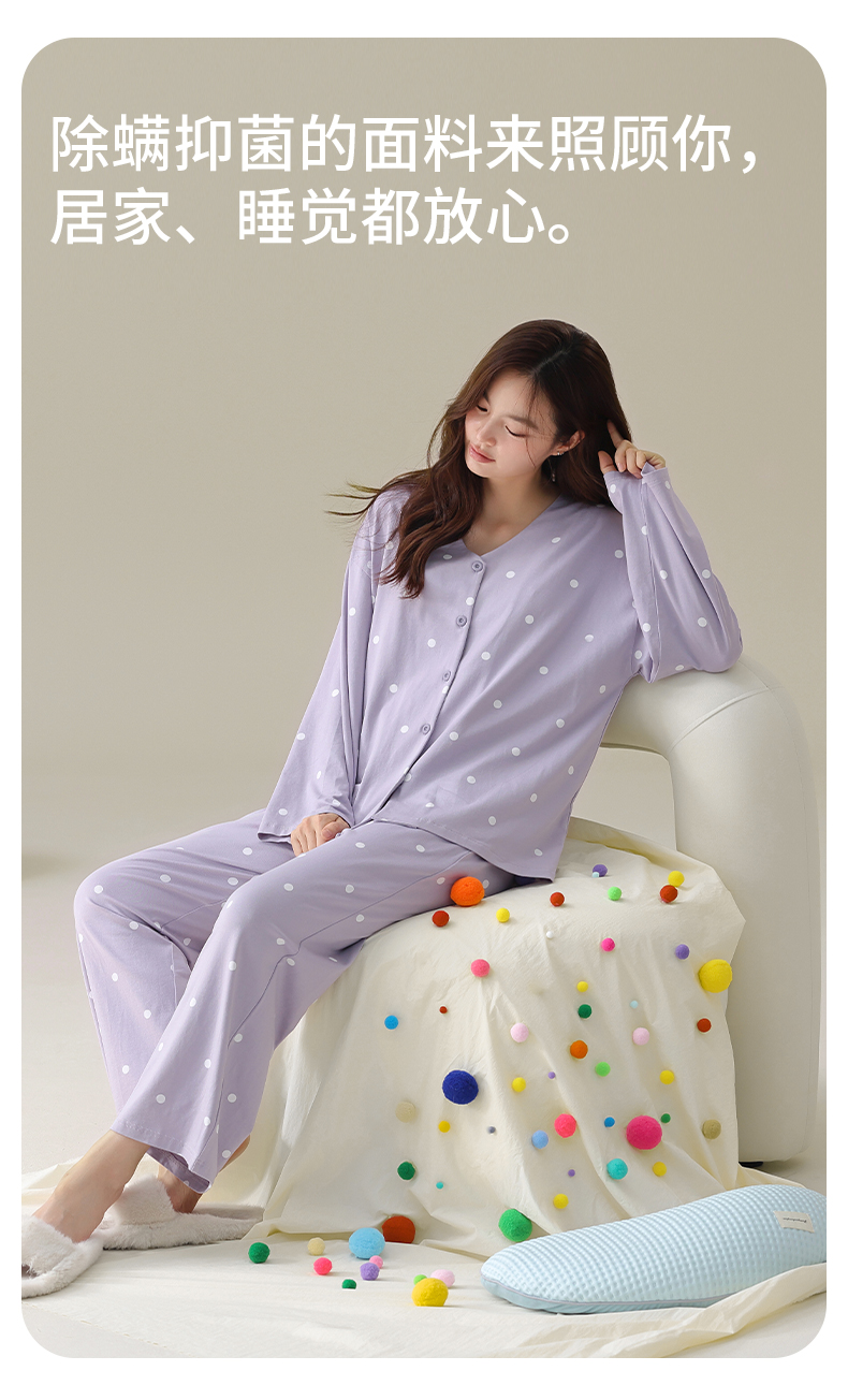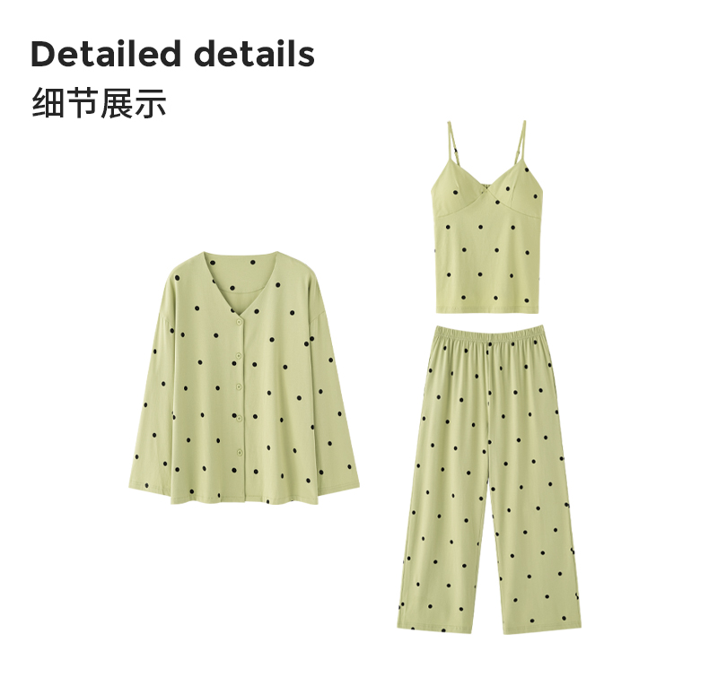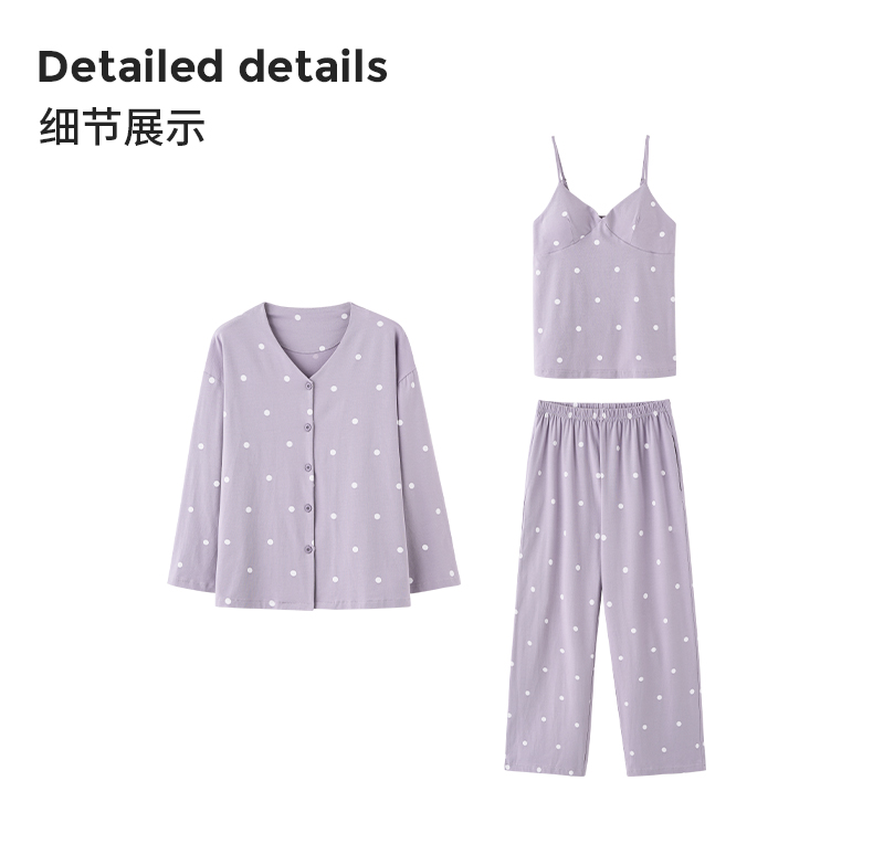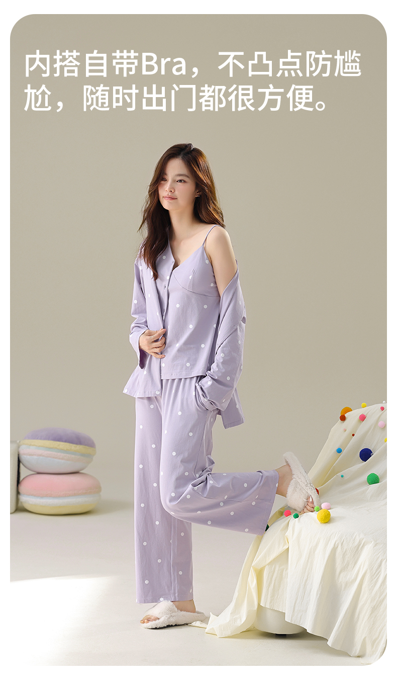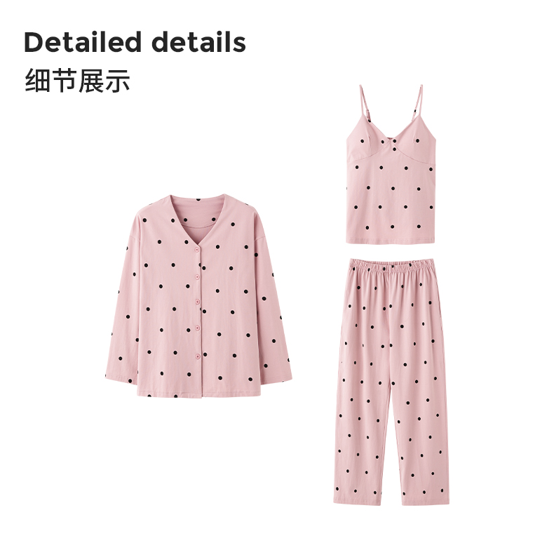 自然醒「雪泥甜心」带胸垫三件套睡衣女春秋季7A抗菌纯棉波点长袖家居服套装JLM