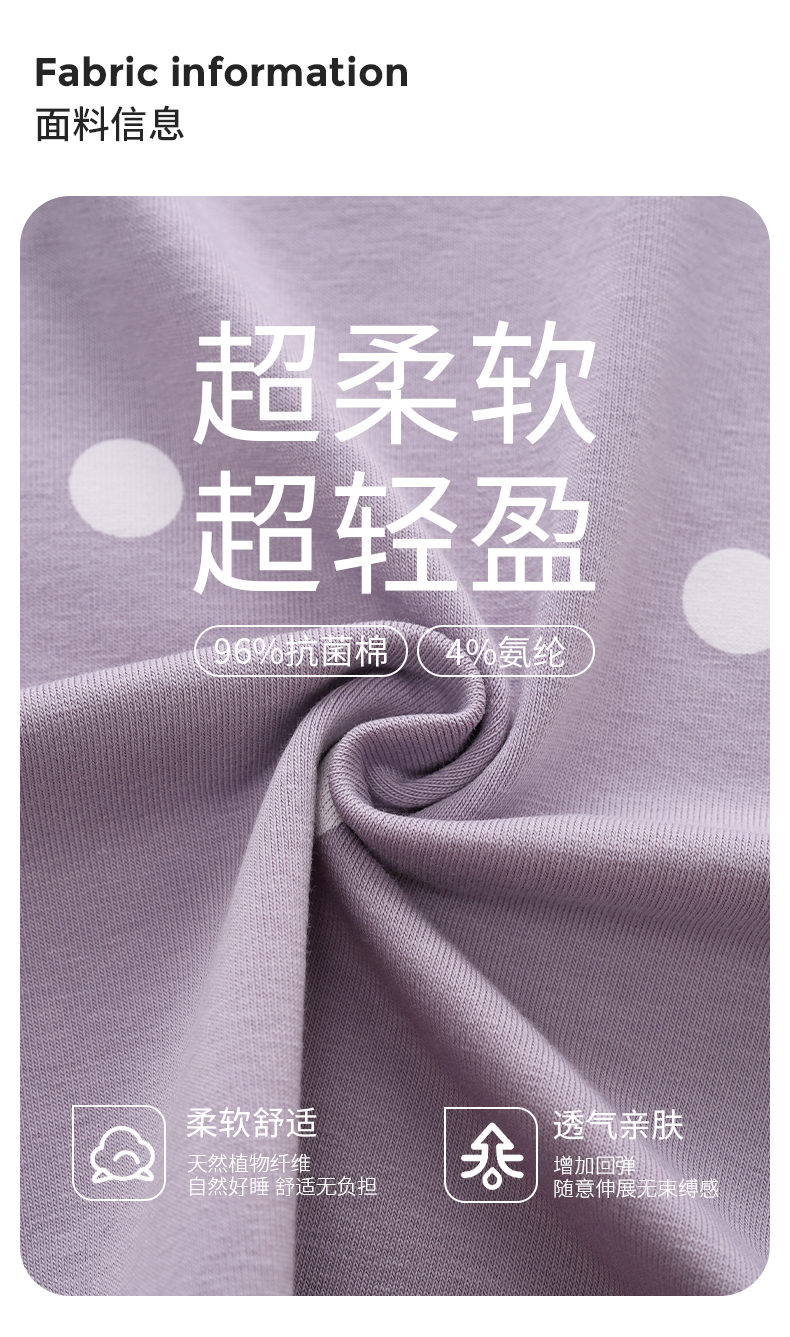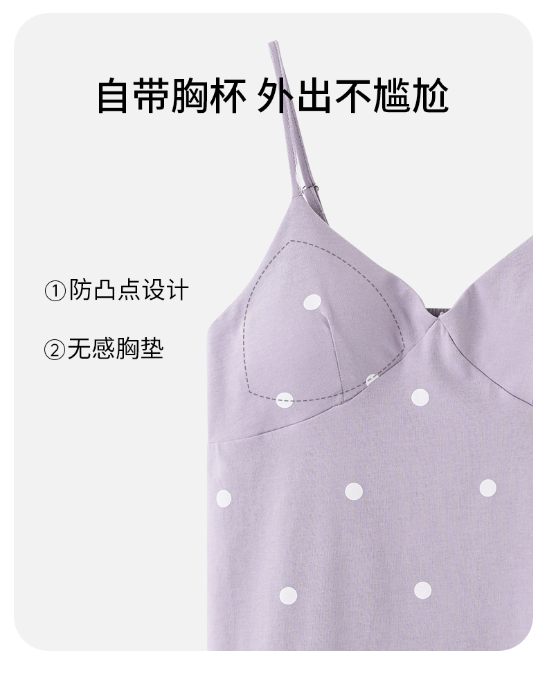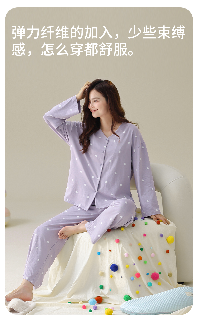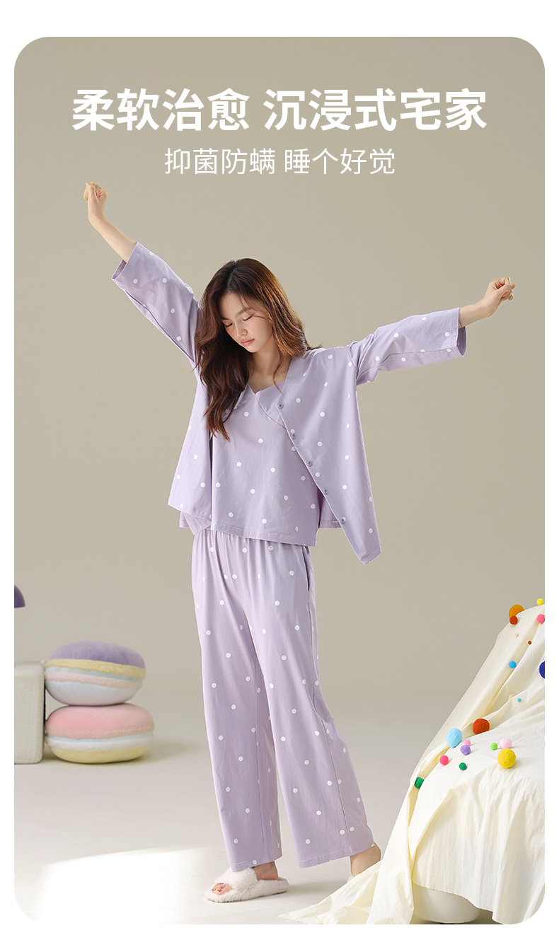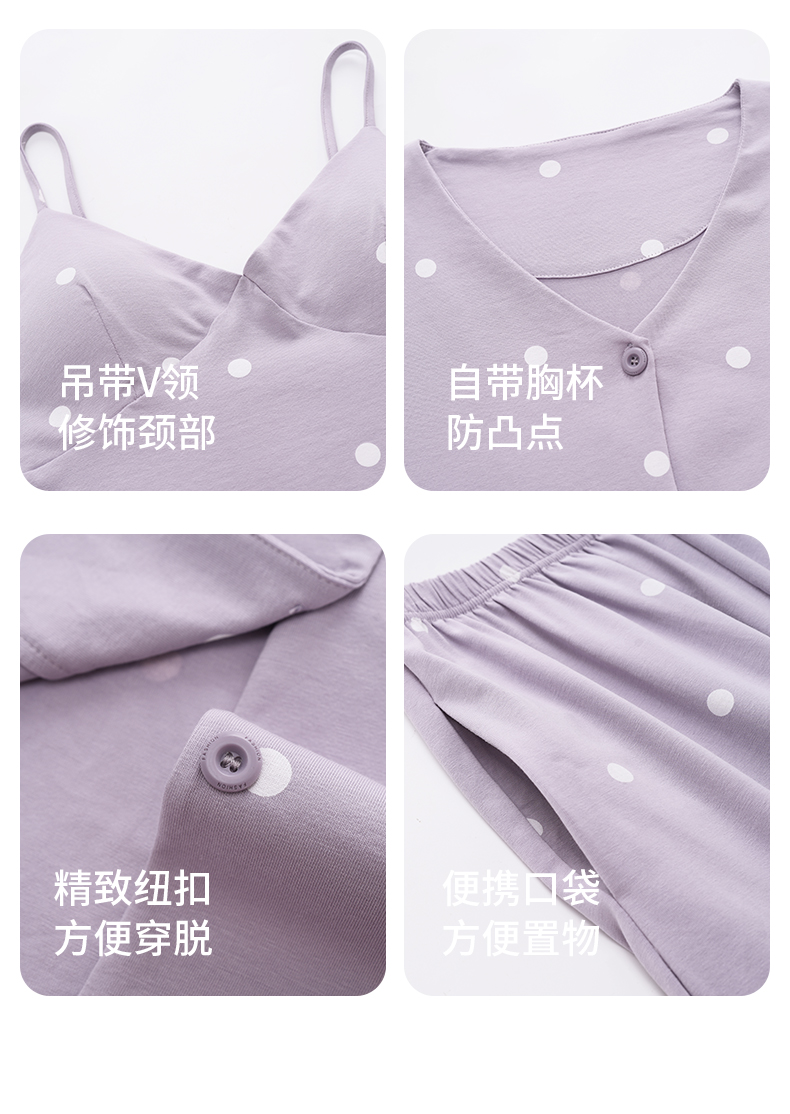 自然醒「雪泥甜心」带胸垫三件套睡衣女春秋季7A抗菌纯棉波点长袖家居服套装JLM