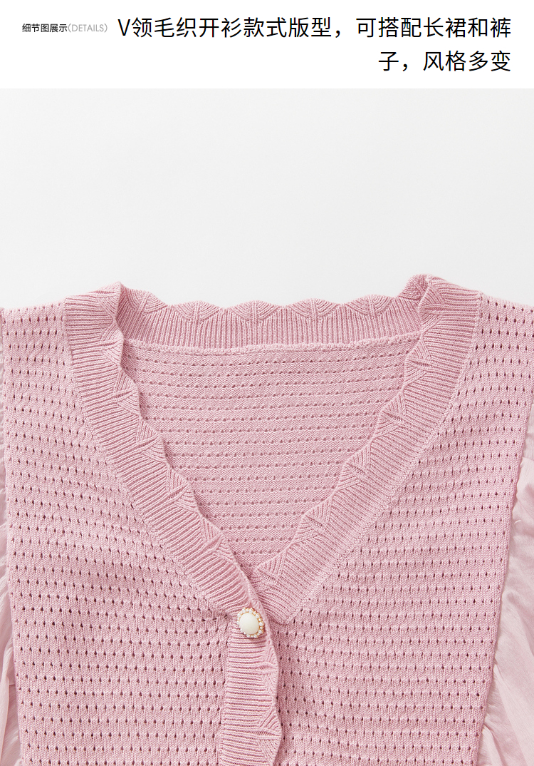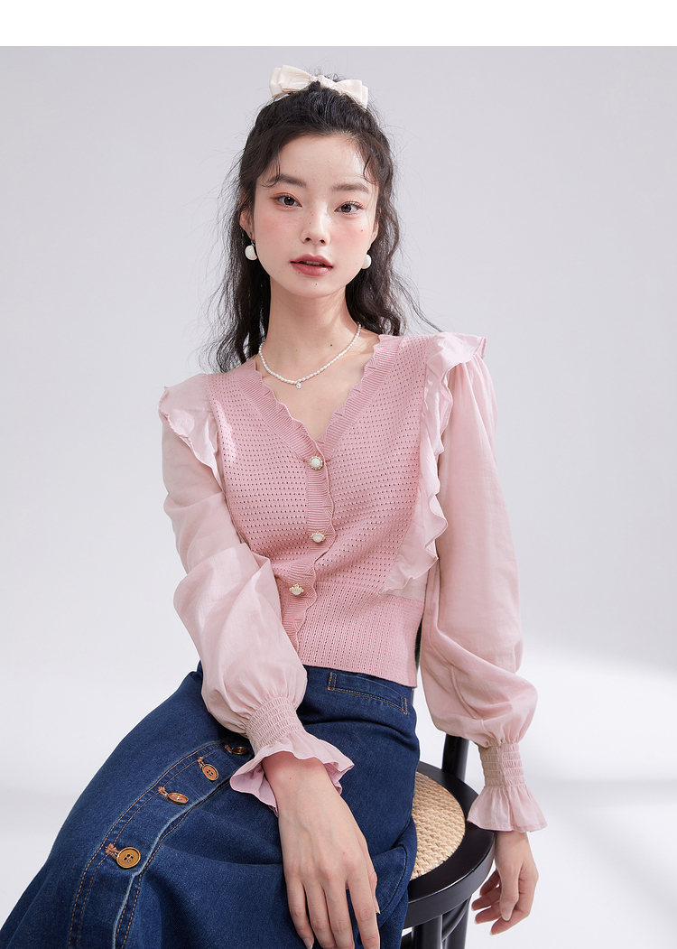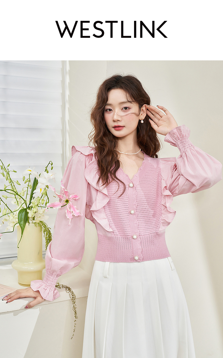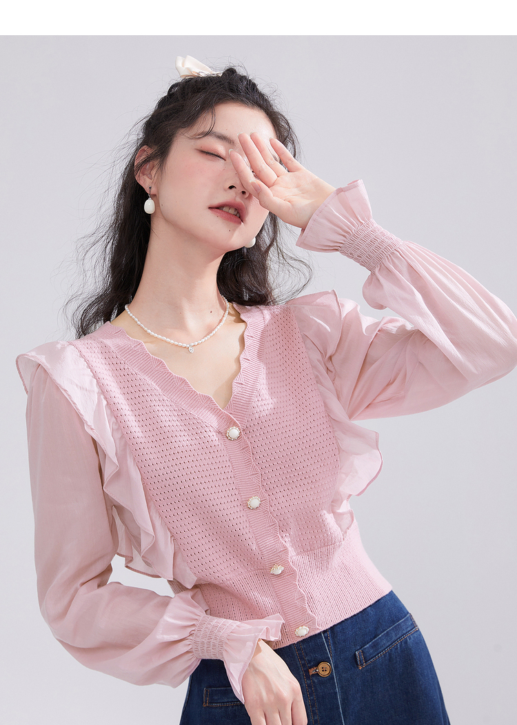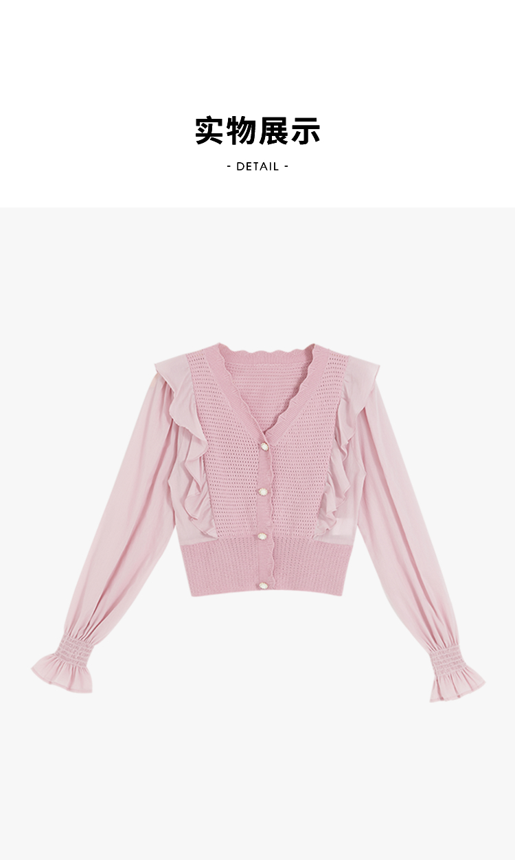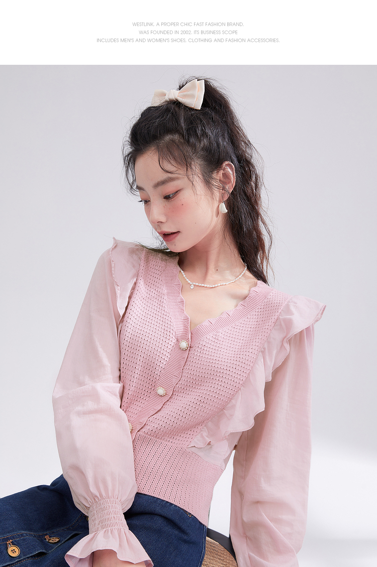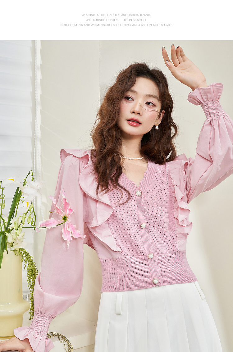 西遇V领针织开衫女早新款甜美法式拼接荷叶边长袖短上衣11521189