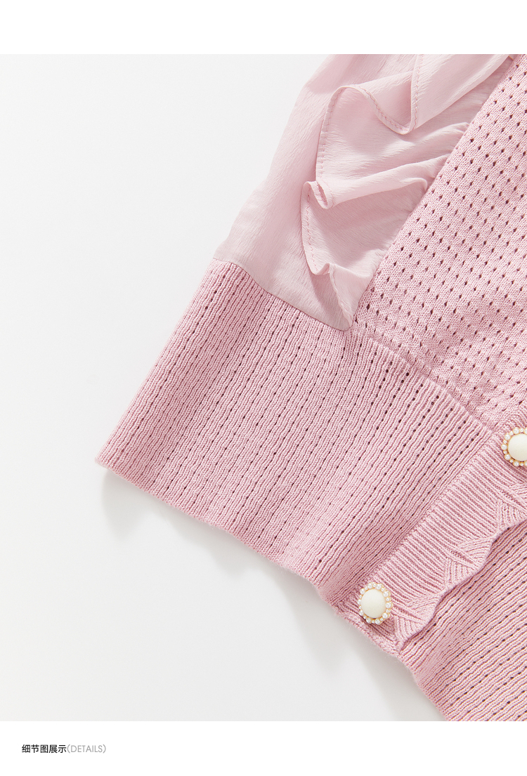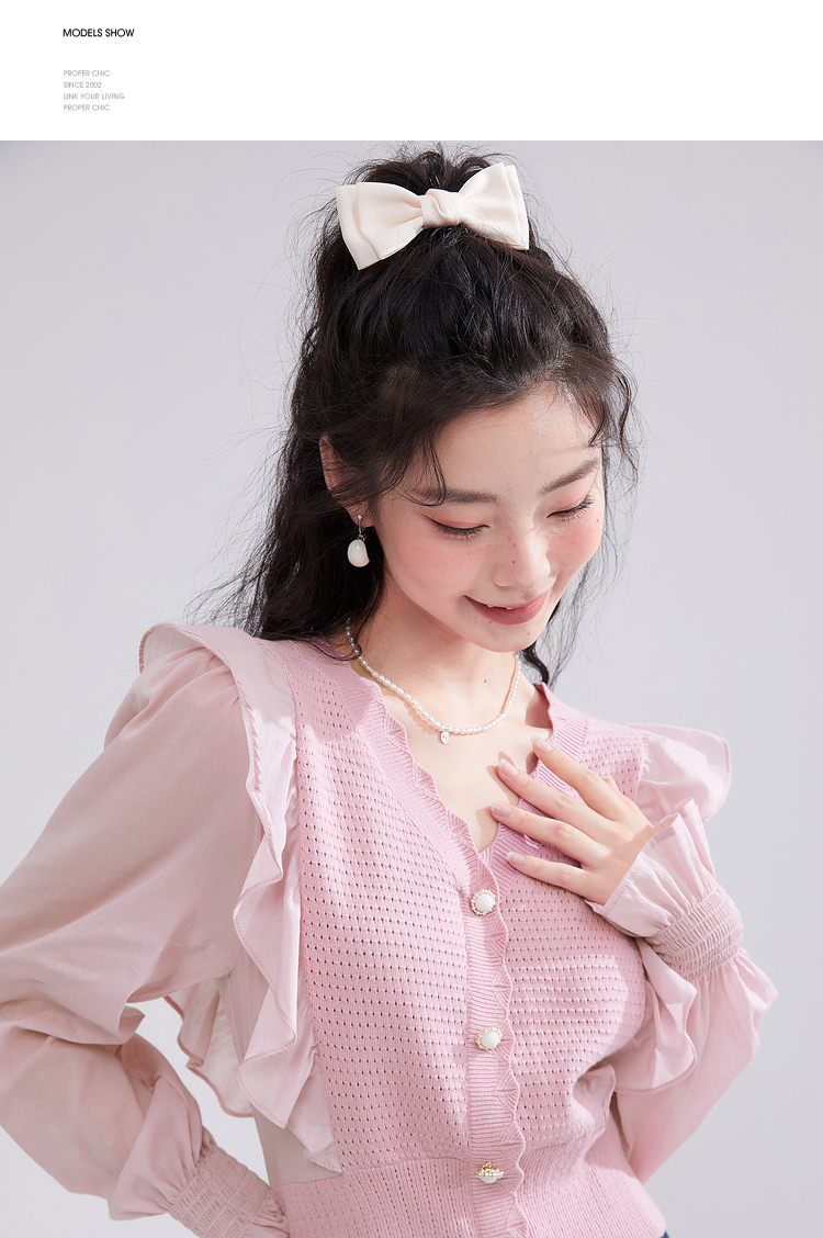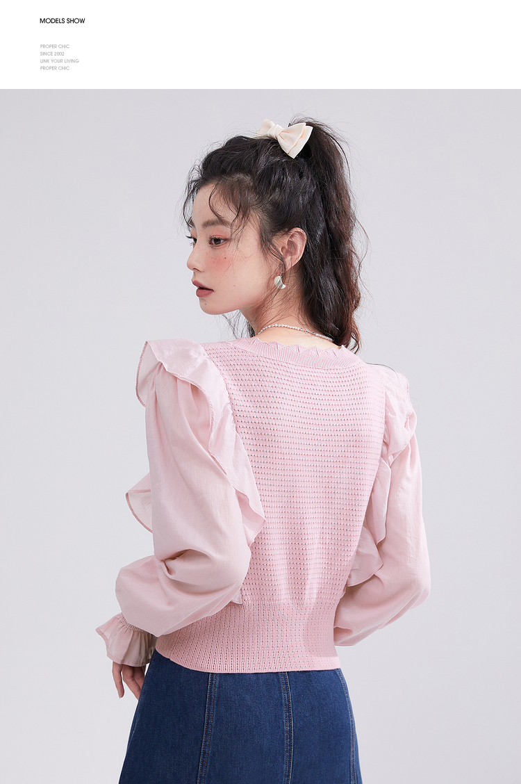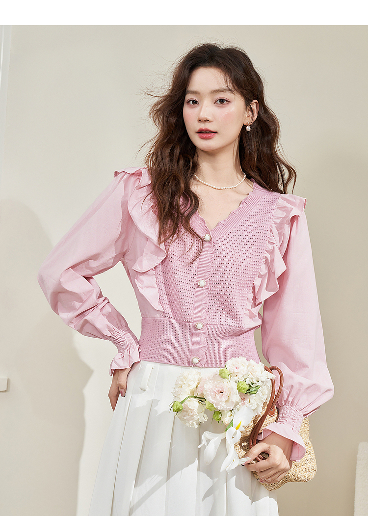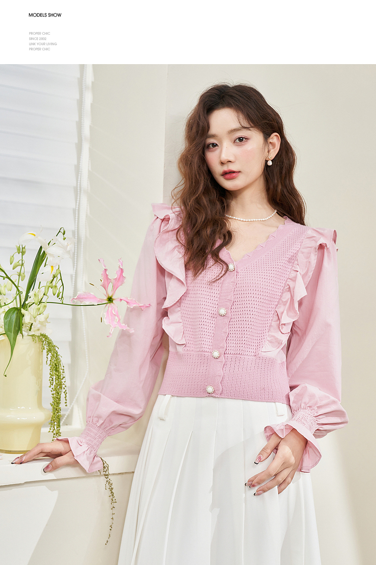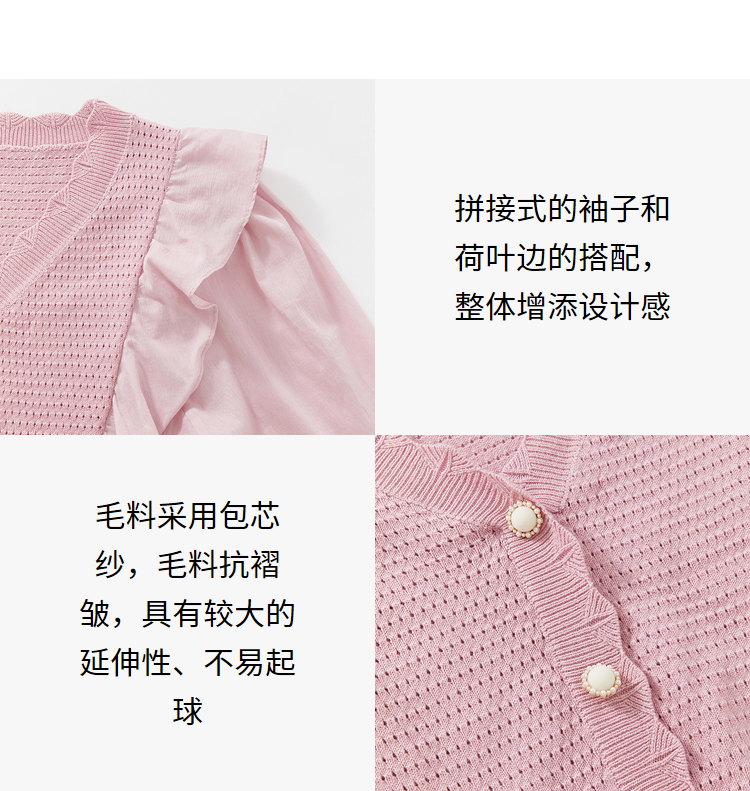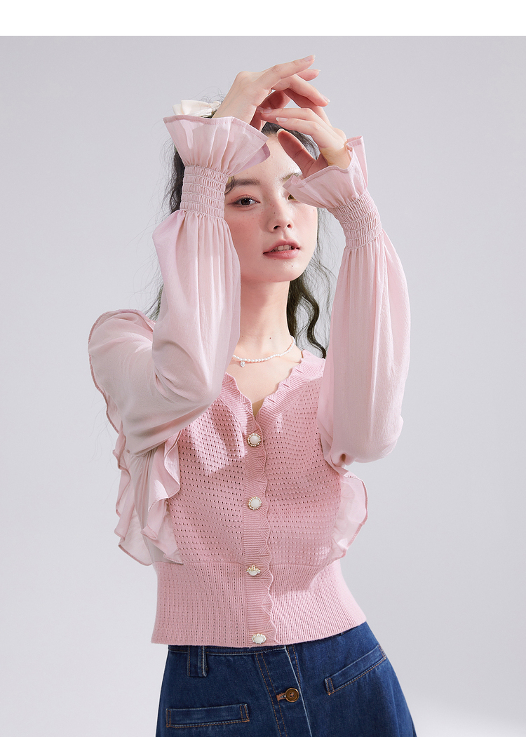 西遇V领针织开衫女早新款甜美法式拼接荷叶边长袖短上衣11521189