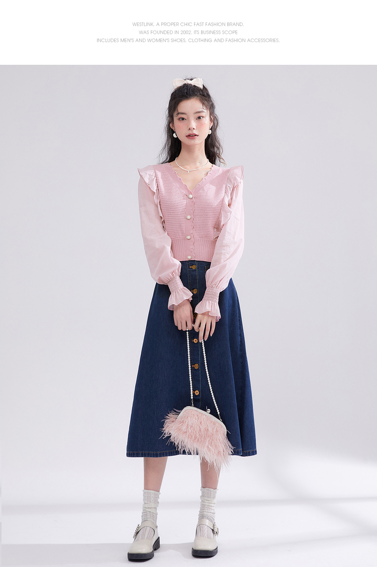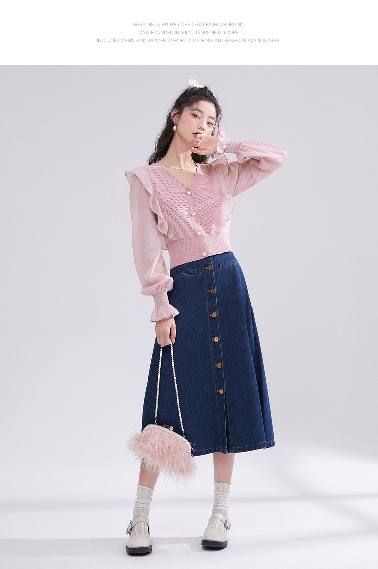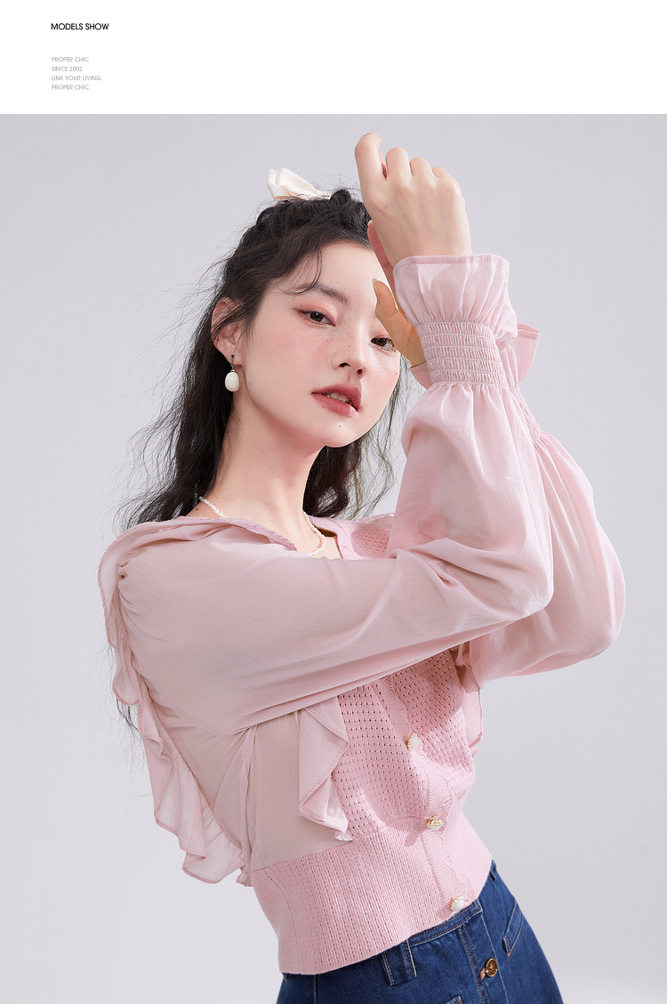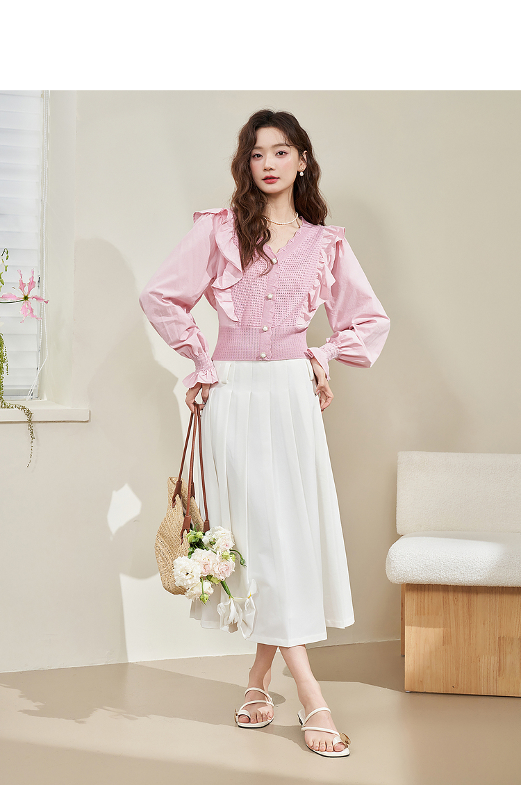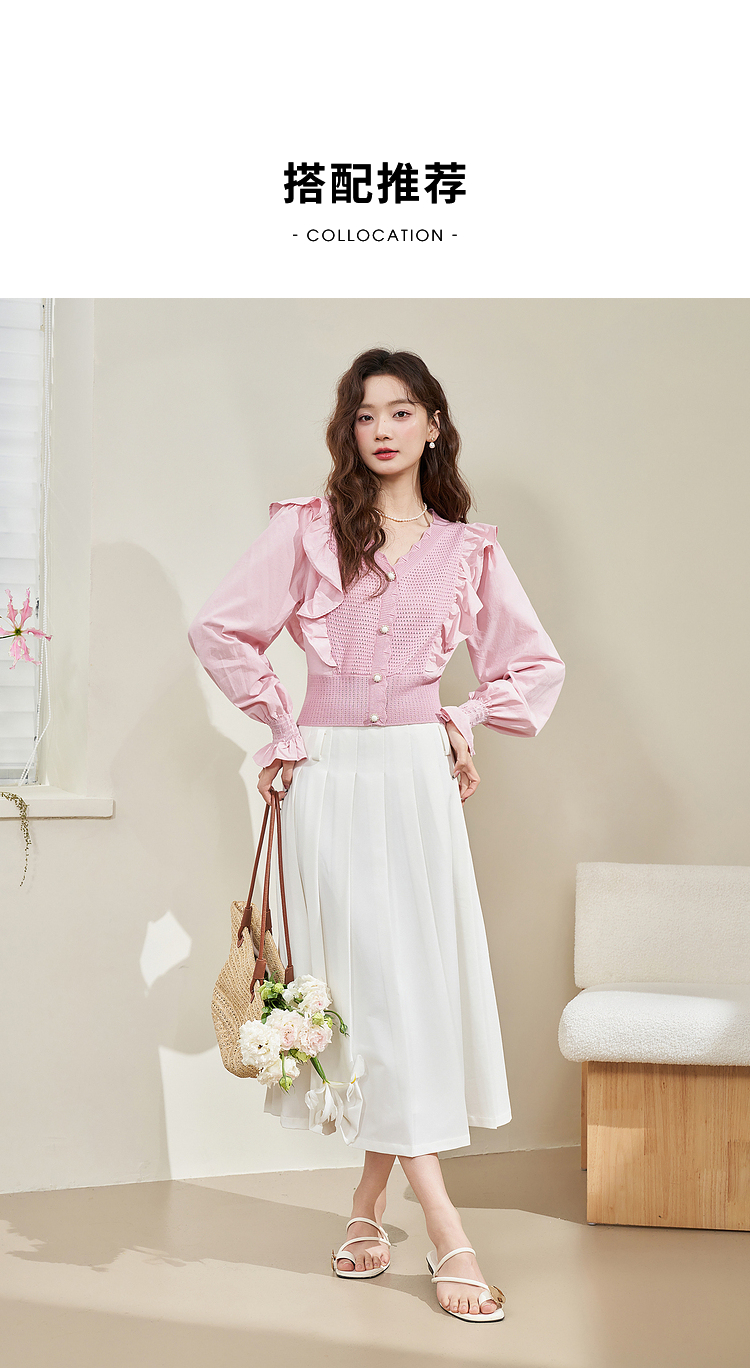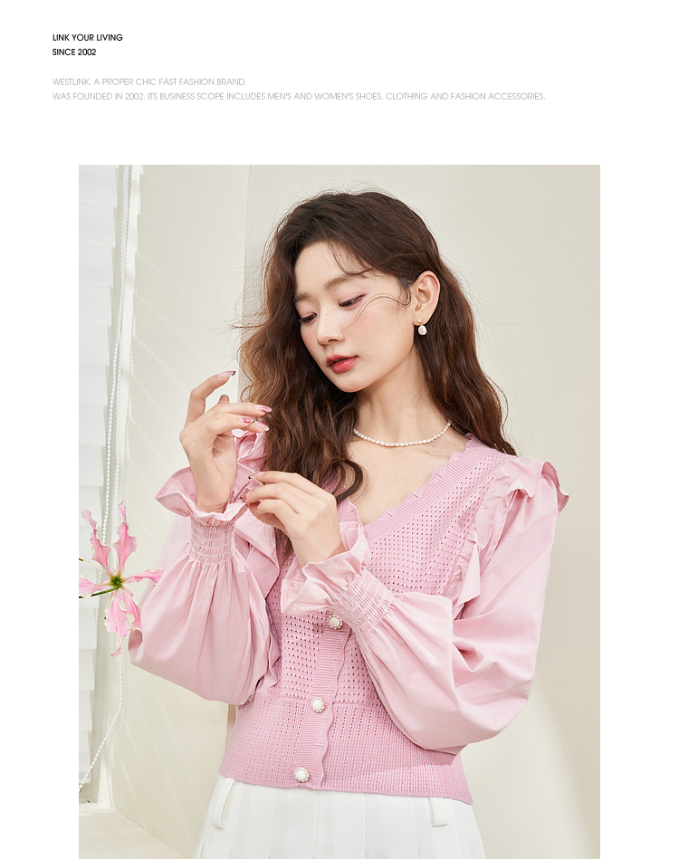 西遇V领针织开衫女早新款甜美法式拼接荷叶边长袖短上衣11521189
