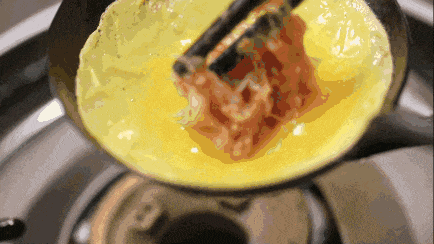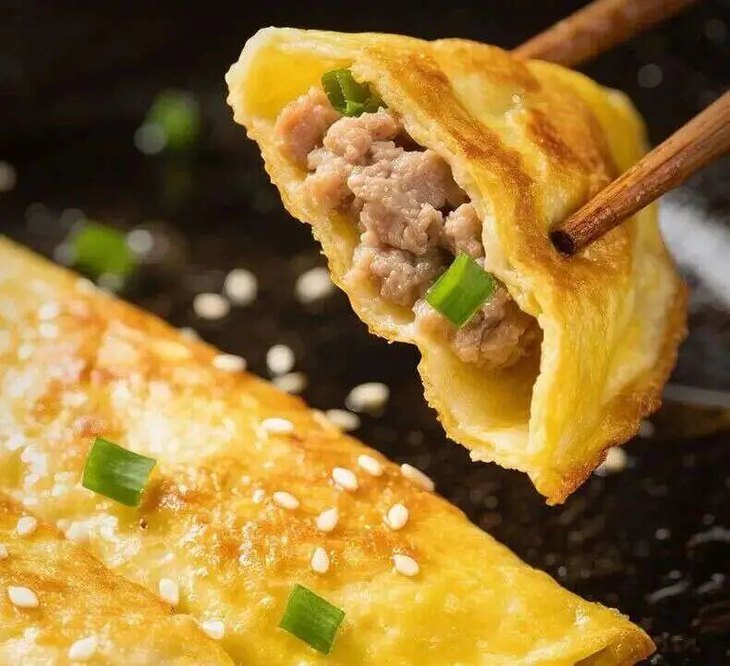 也能煎炸吃,微脆的蛋皮焦香四溢,被油温激化的肉馅散发着油脂的醇香。