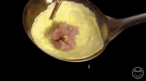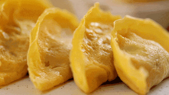 待成型后放入一小勺肉馅,蛋皮边缘略翘起后用筷子夹起蛋皮盖住肉馅,形成饺子状。