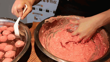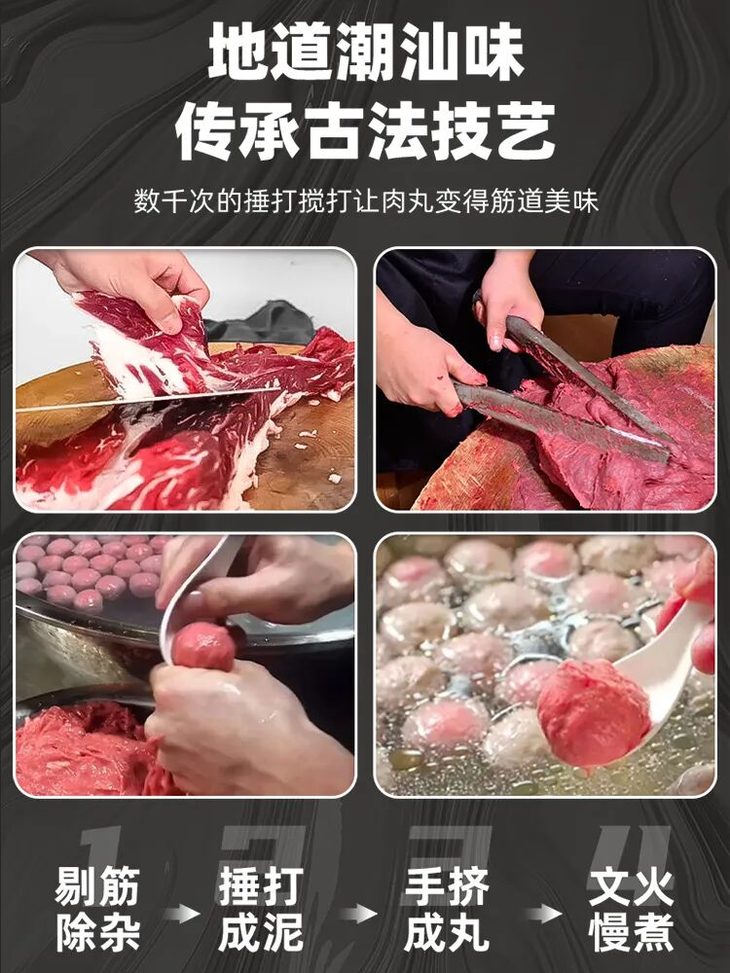 牛肉经过上千次搅打直至肉浆出胶,保持肉质纤维再用手工挤出牛肉丸,在坚持传统的模式下,每一颗牛肉丸都是有灵魂的。