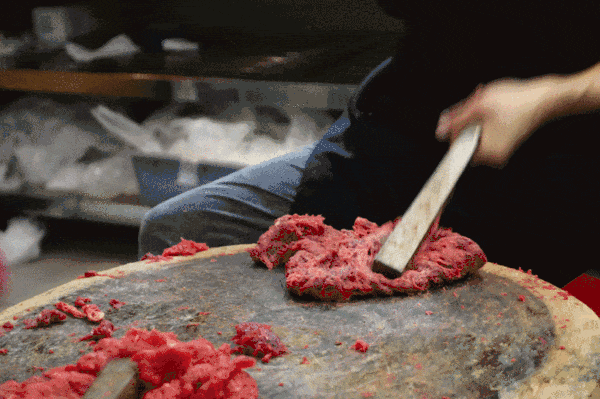 制作时,只选用当天现宰的黄牛后腿肉,色泽鲜红,肉质细腻柔嫩,大理石纹明显,尤为鲜美。