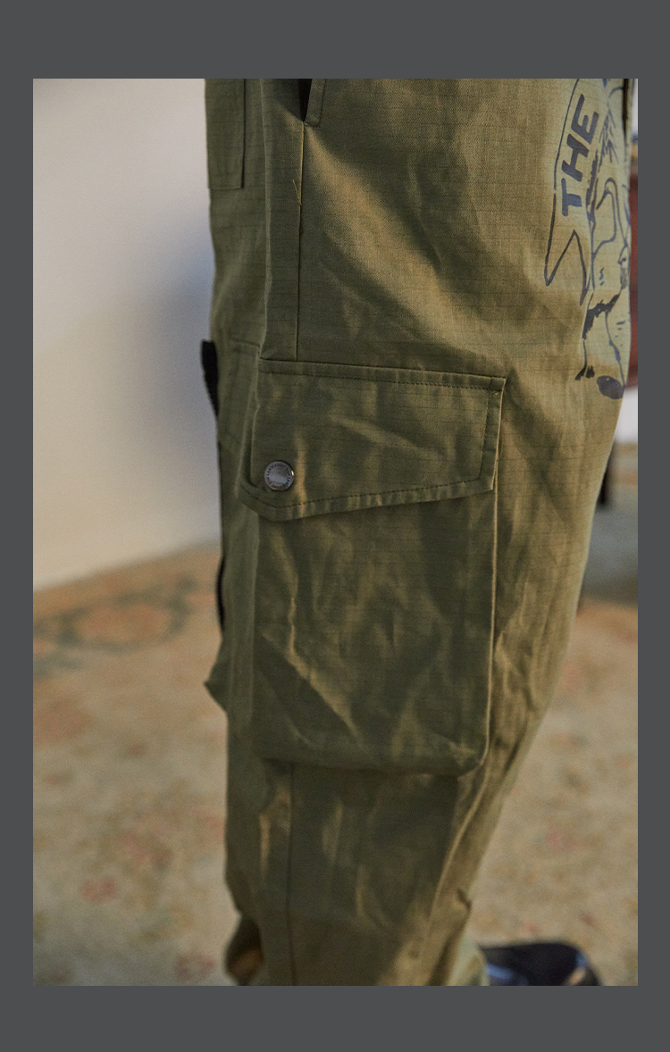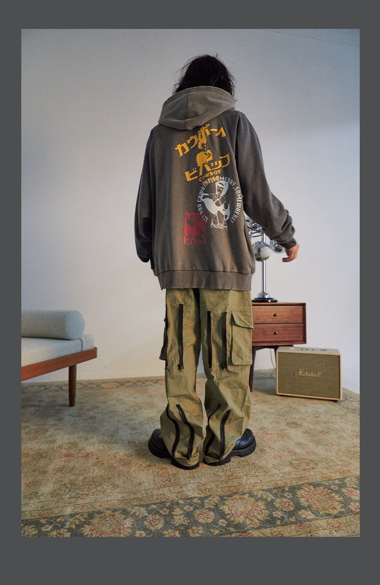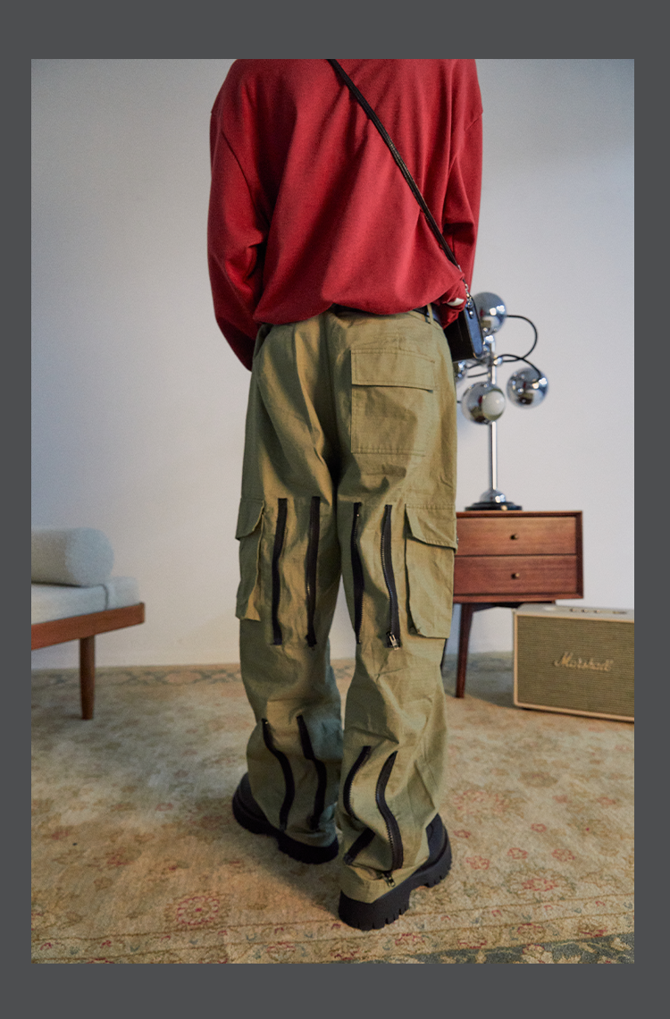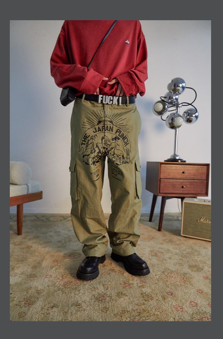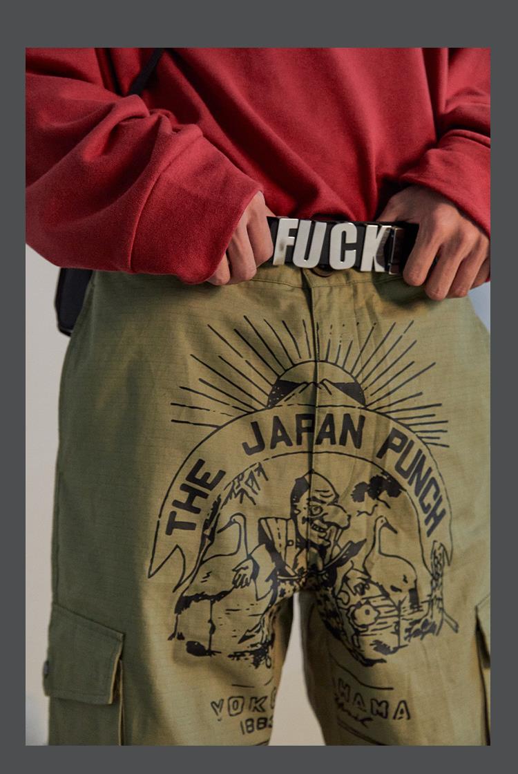 POH 讽刺漫画主题工装直筒裤子印花宽松军绿色拉链阔腿休闲长裤男