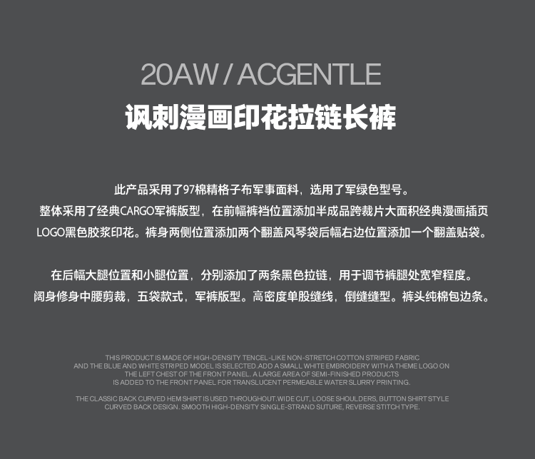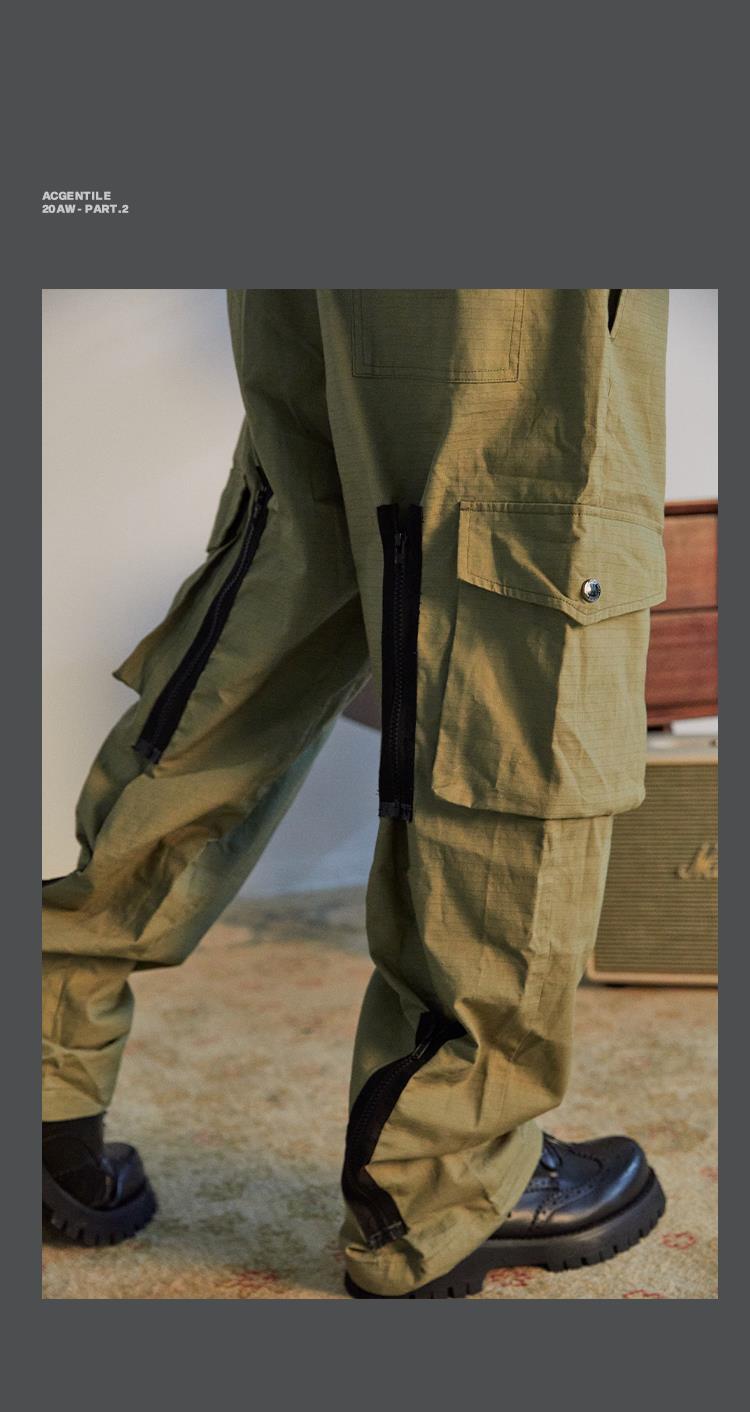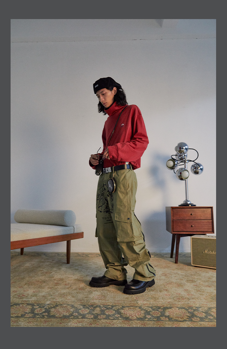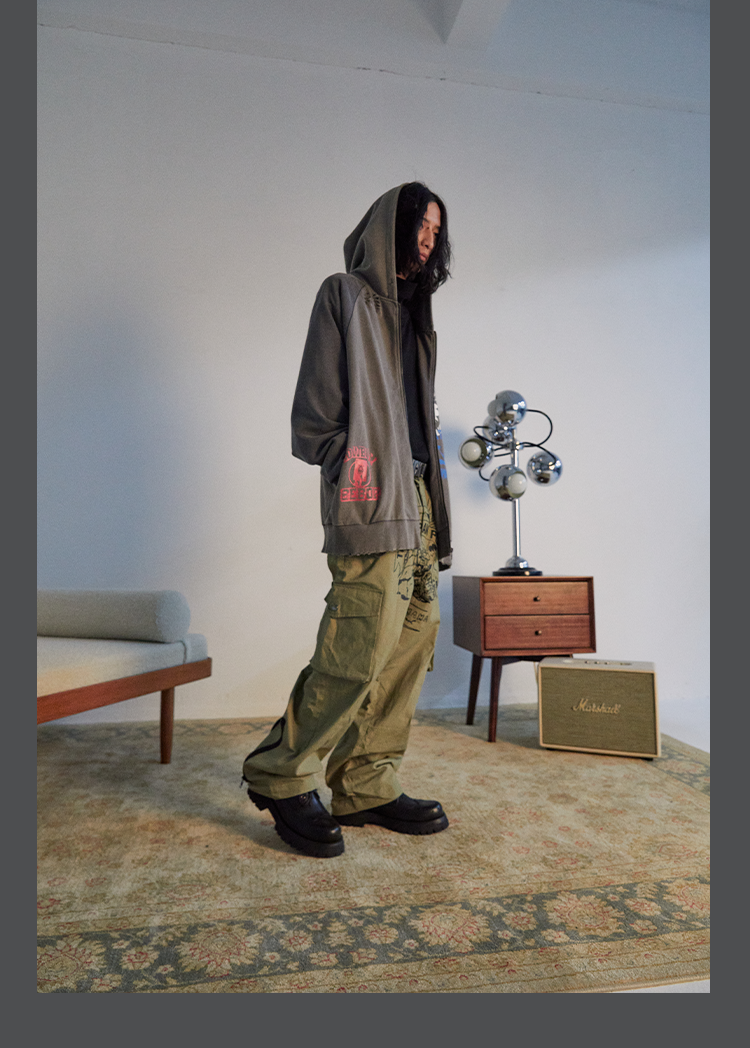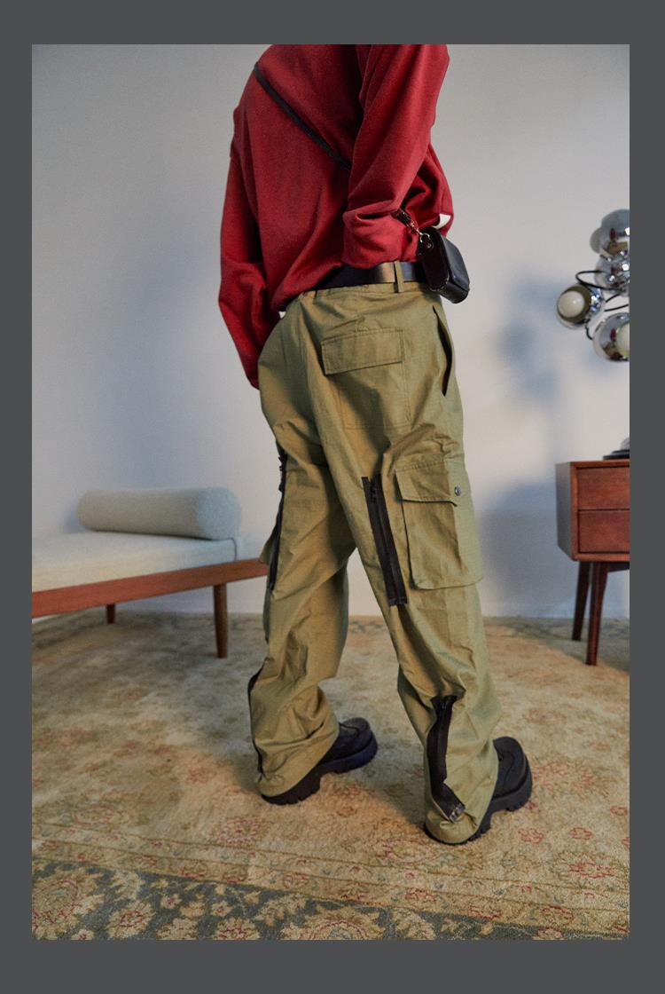 POH 讽刺漫画主题工装直筒裤子印花宽松军绿色拉链阔腿休闲长裤男