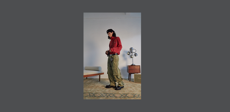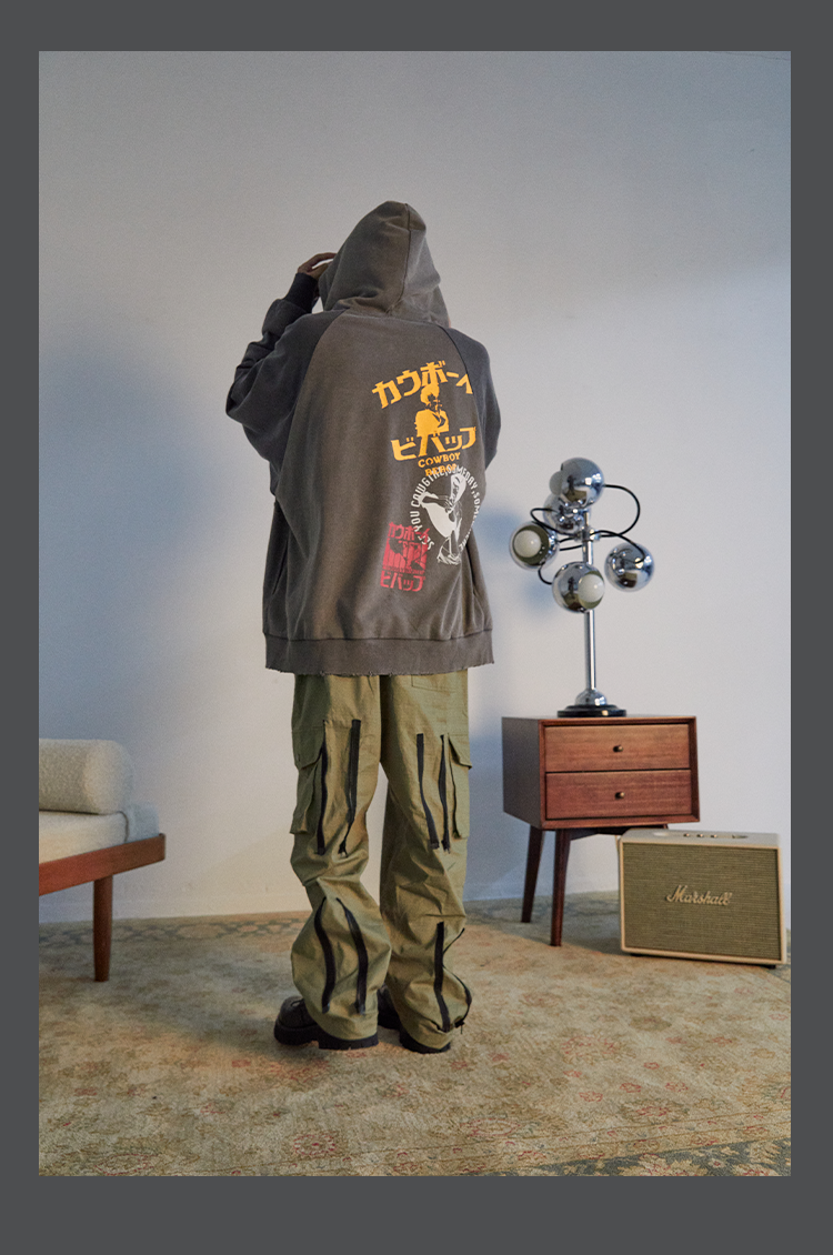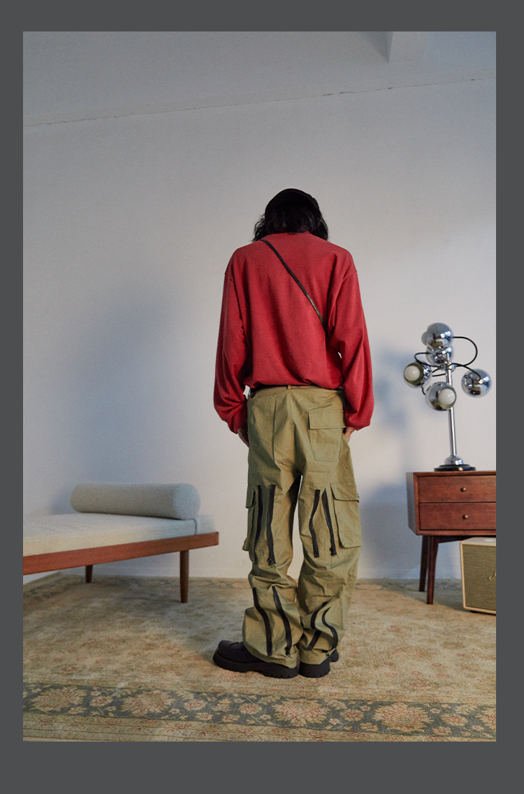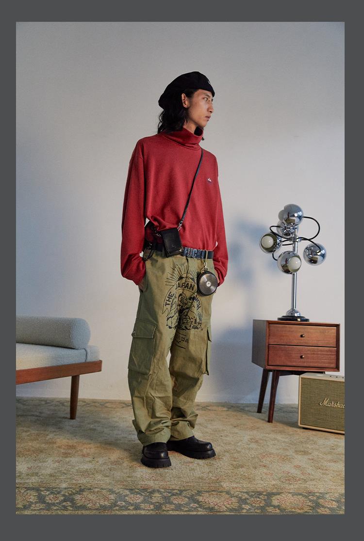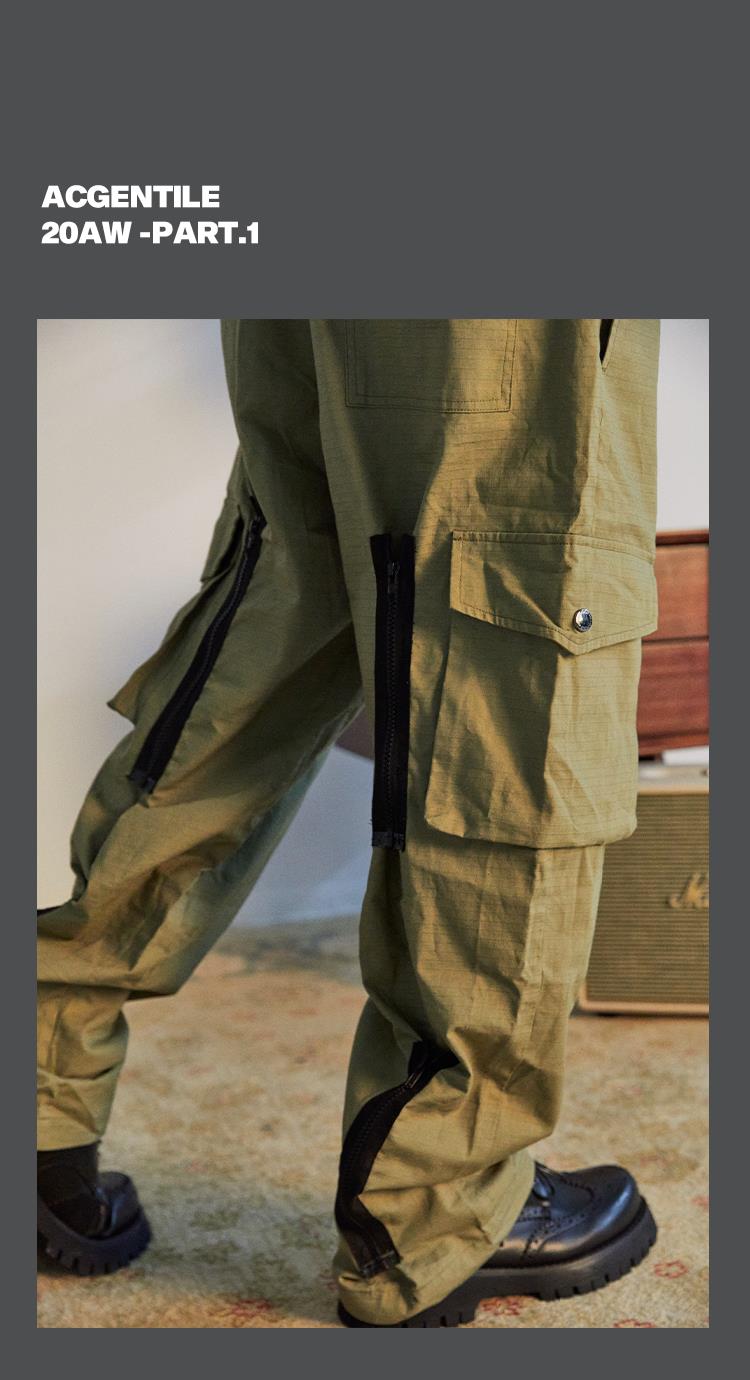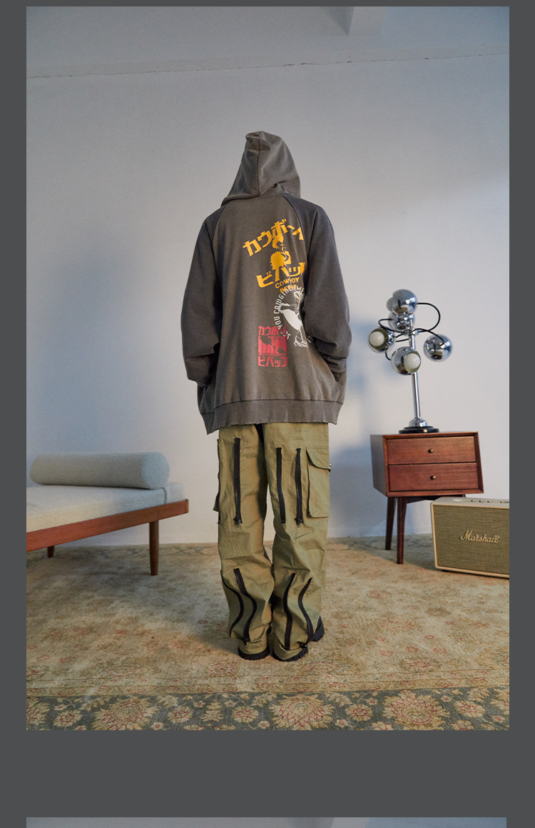 POH 讽刺漫画主题工装直筒裤子印花宽松军绿色拉链阔腿休闲长裤男