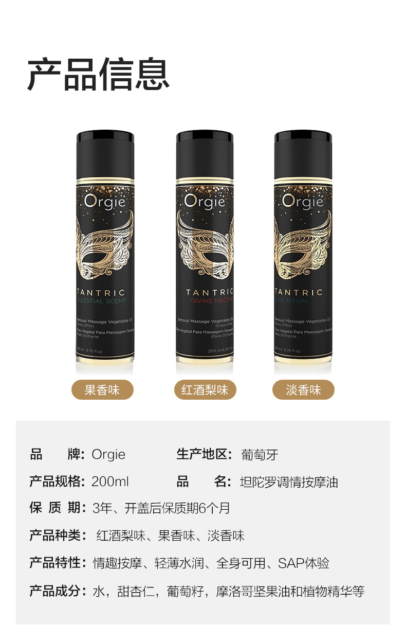 葡萄牙原装Orgie 坦陀罗SPA按摩精油200ml