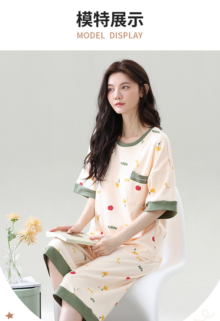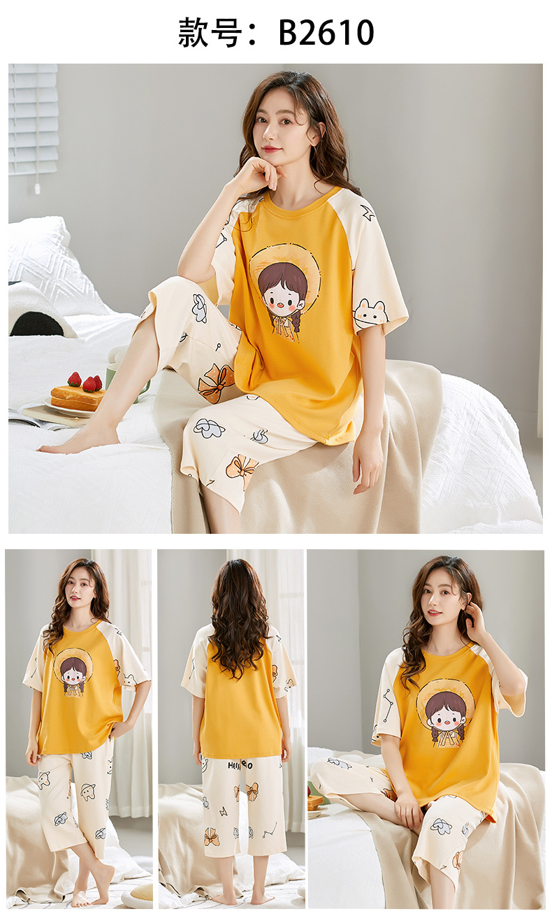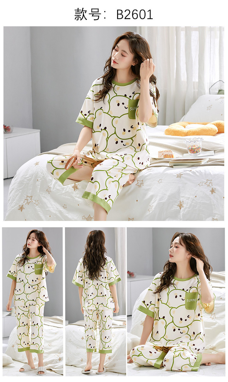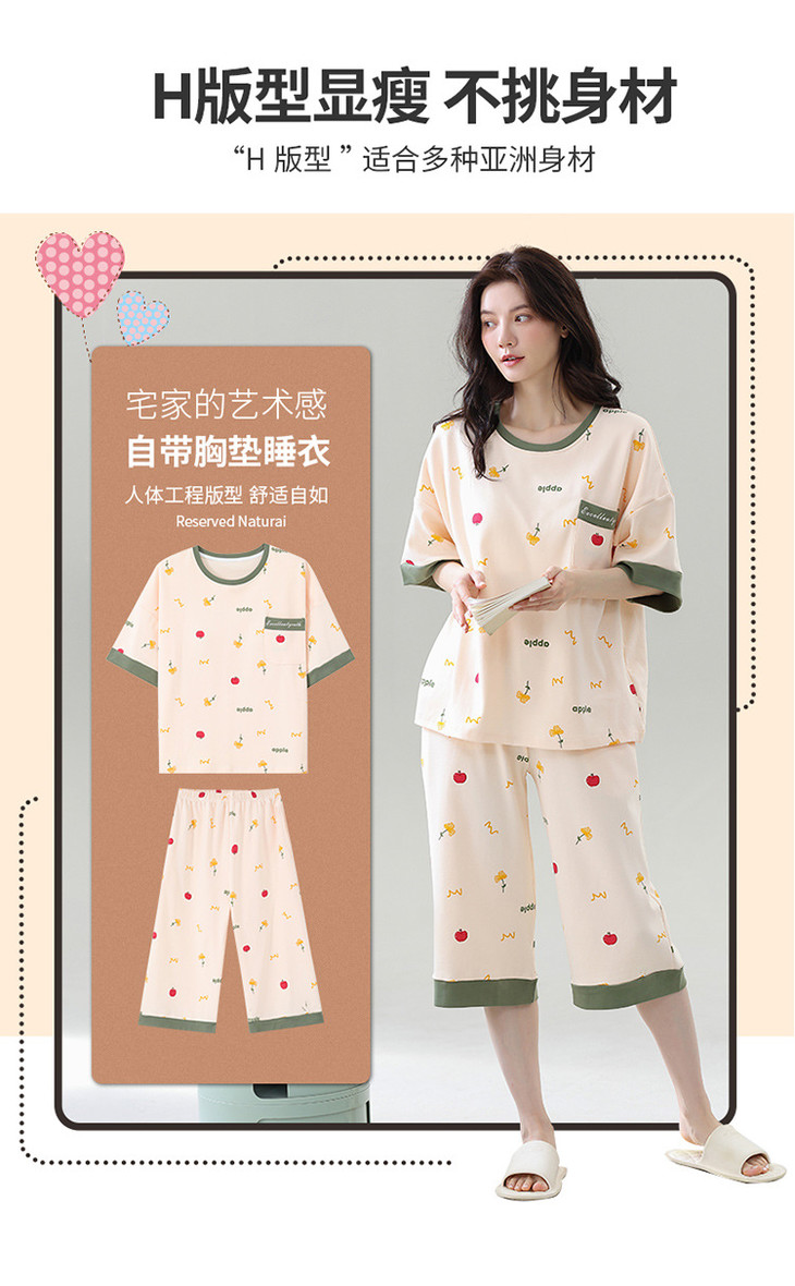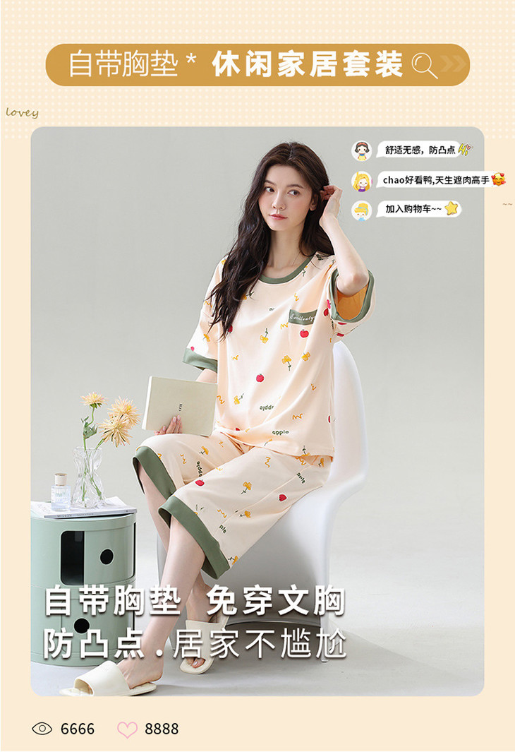 夏季短袖七分裤睡衣女卡通薄款可爱带胸垫家居服可外穿套装