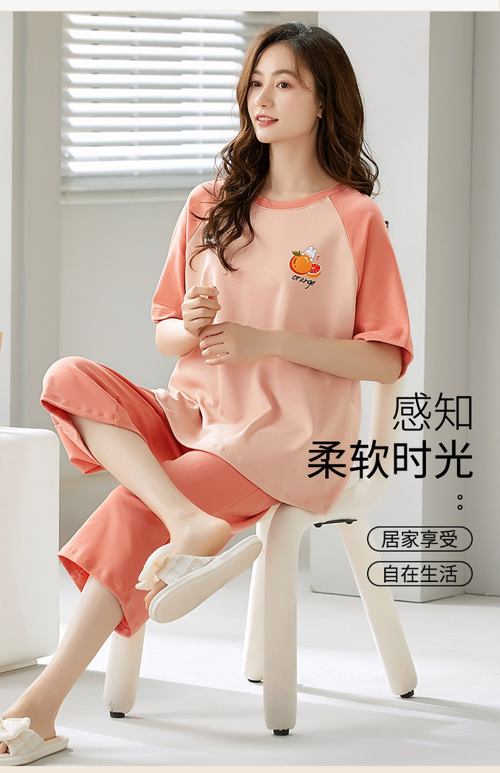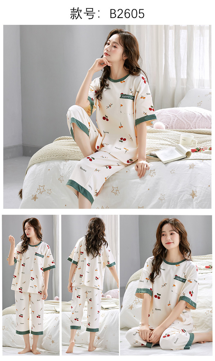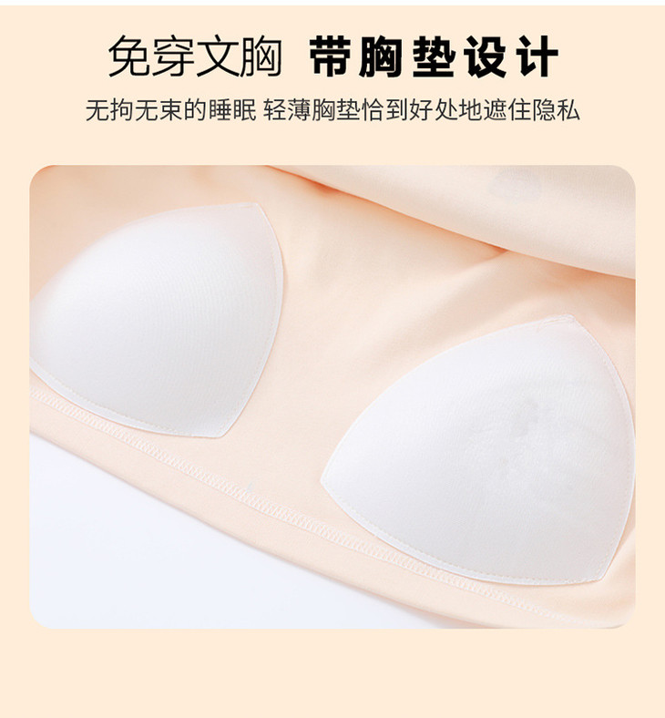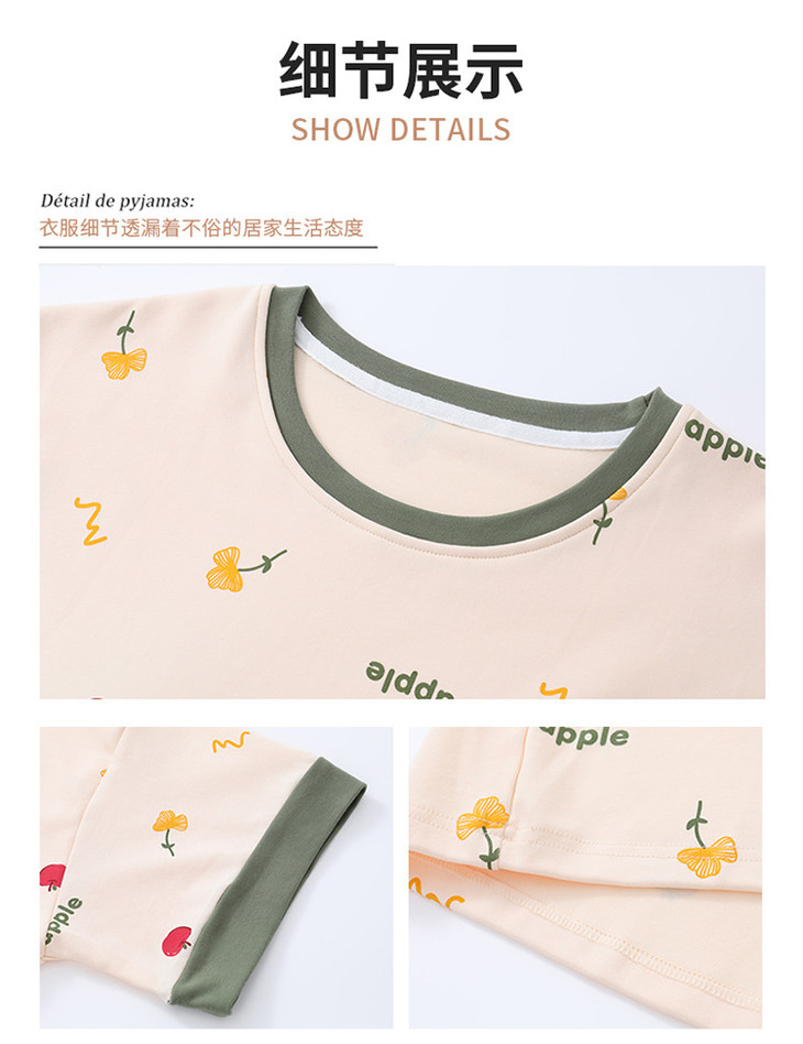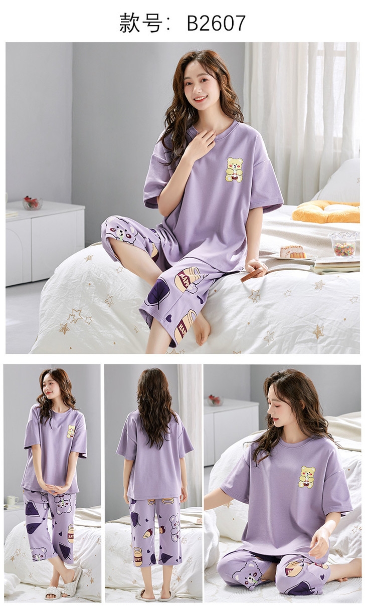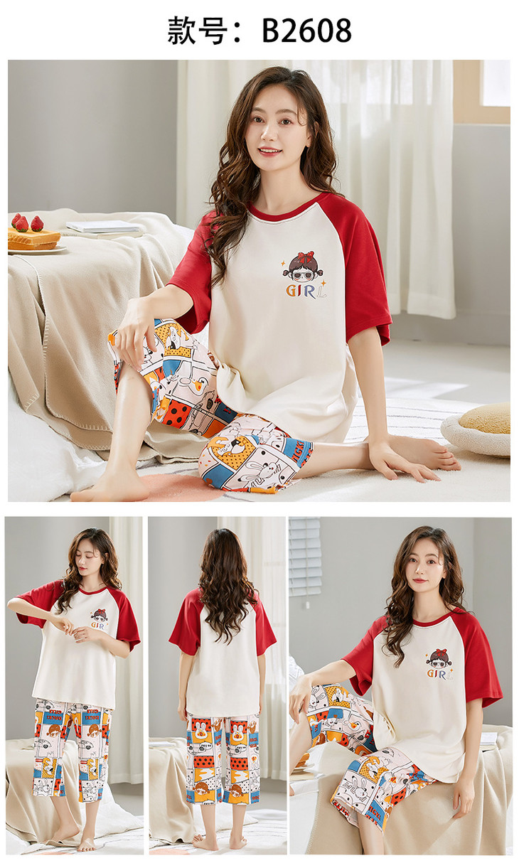 夏季短袖七分裤睡衣女卡通薄款可爱带胸垫家居服可外穿套装