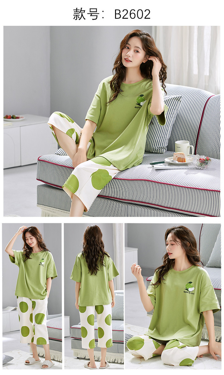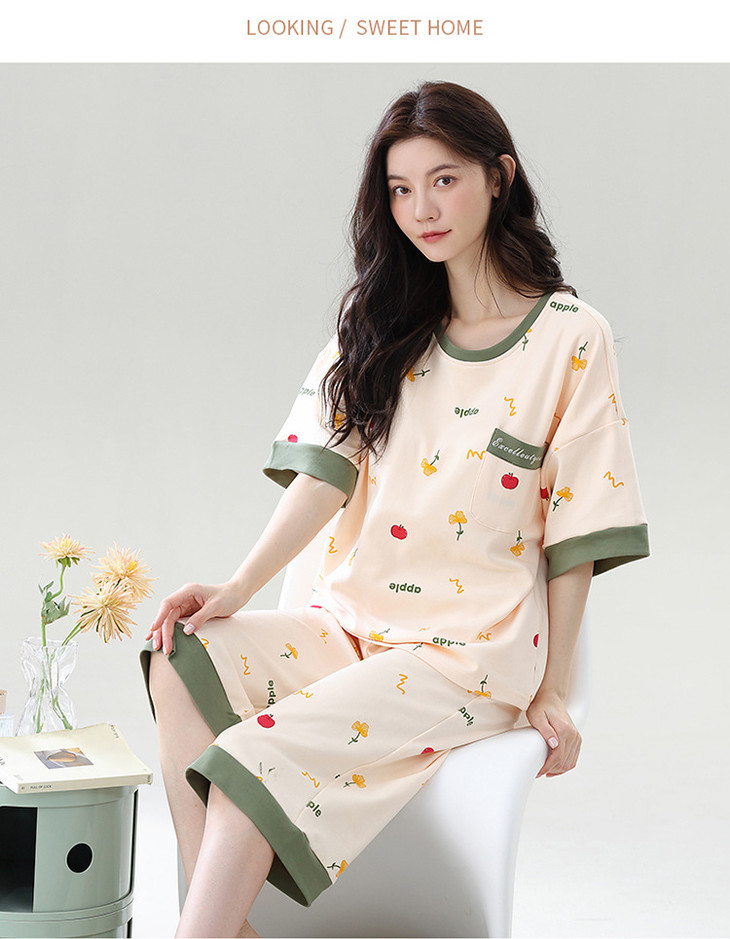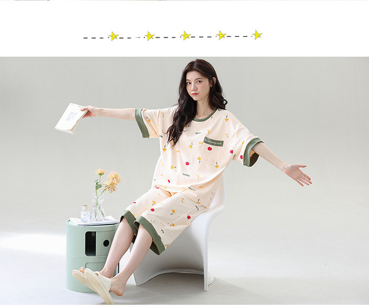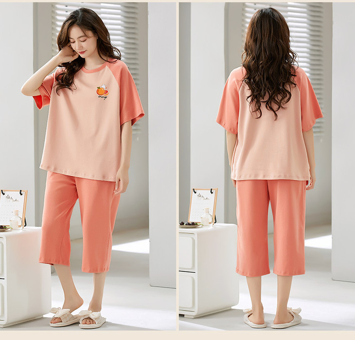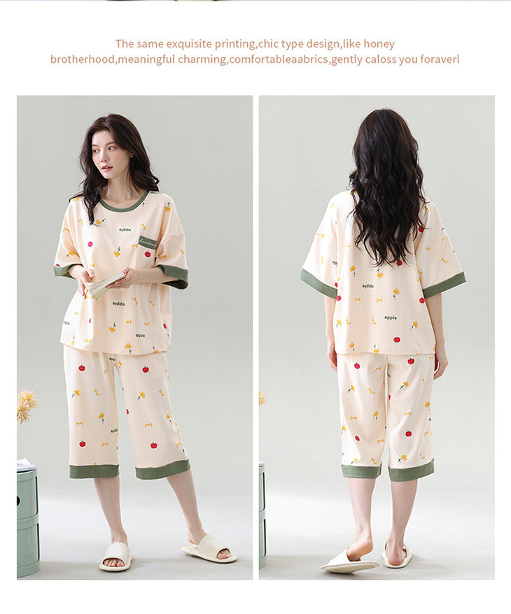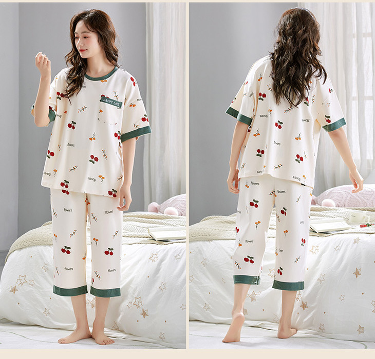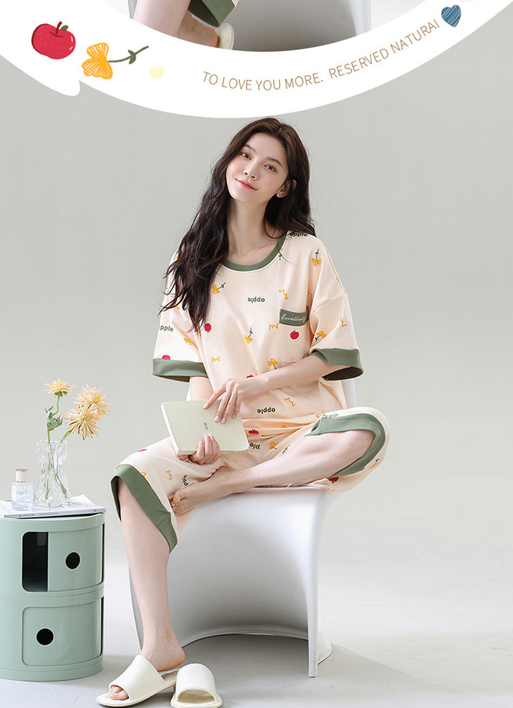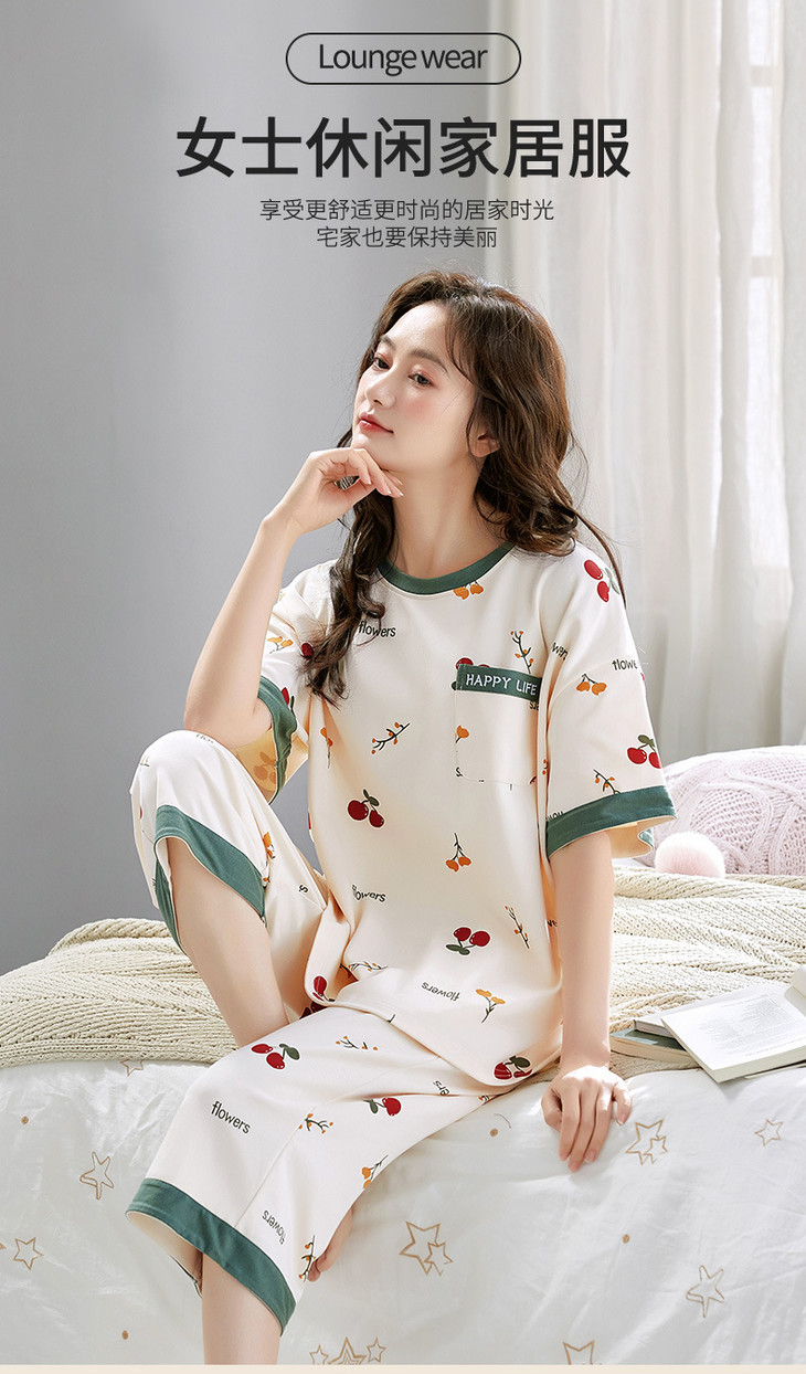 夏季短袖七分裤睡衣女卡通薄款可爱带胸垫家居服可外穿套装