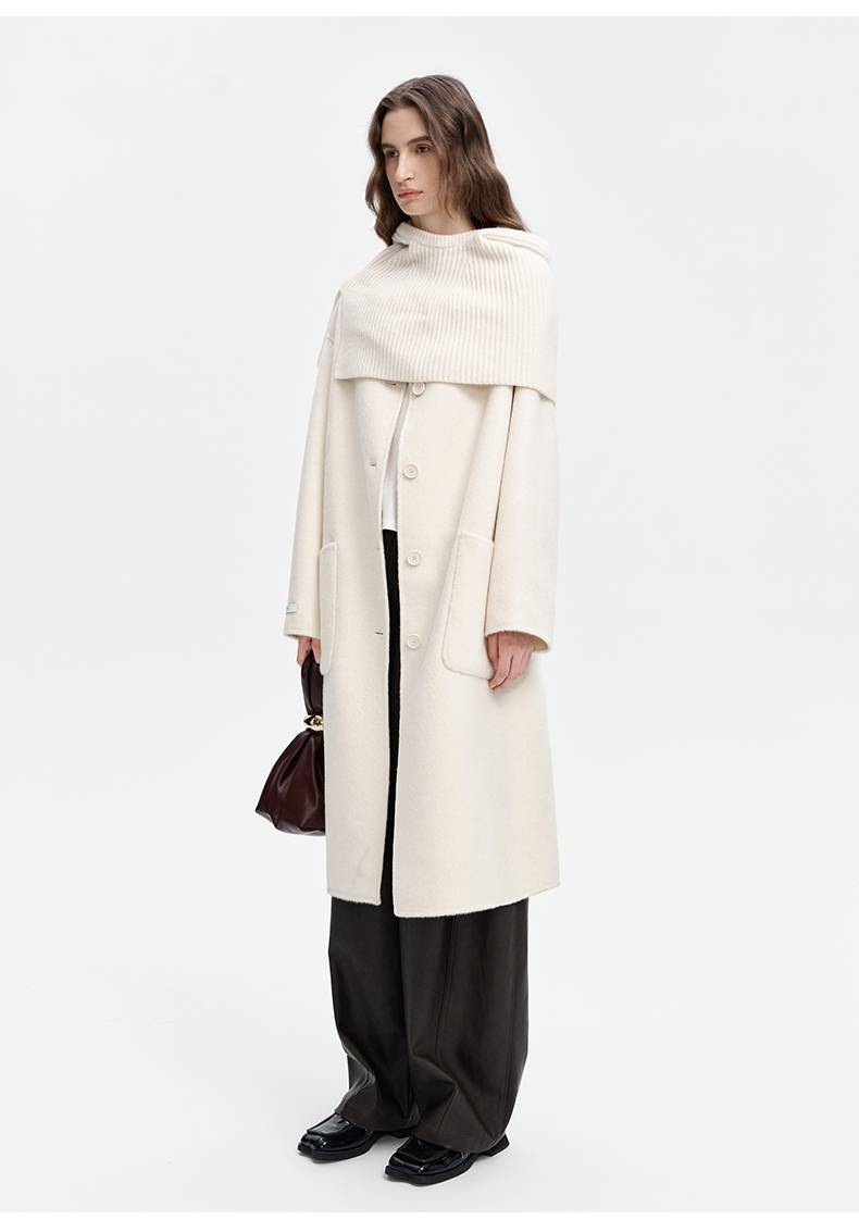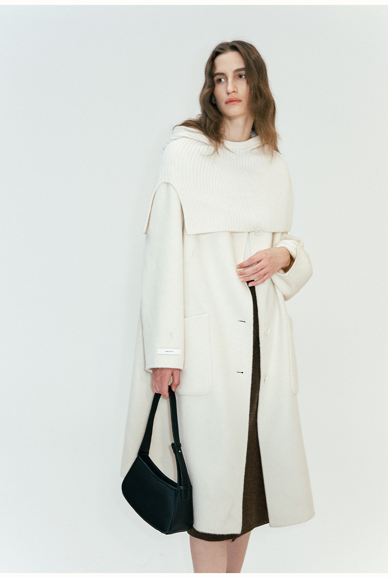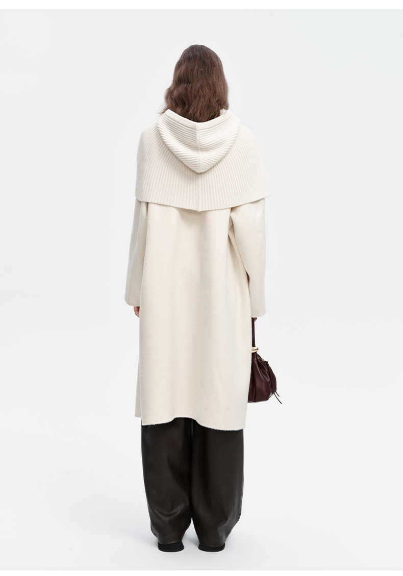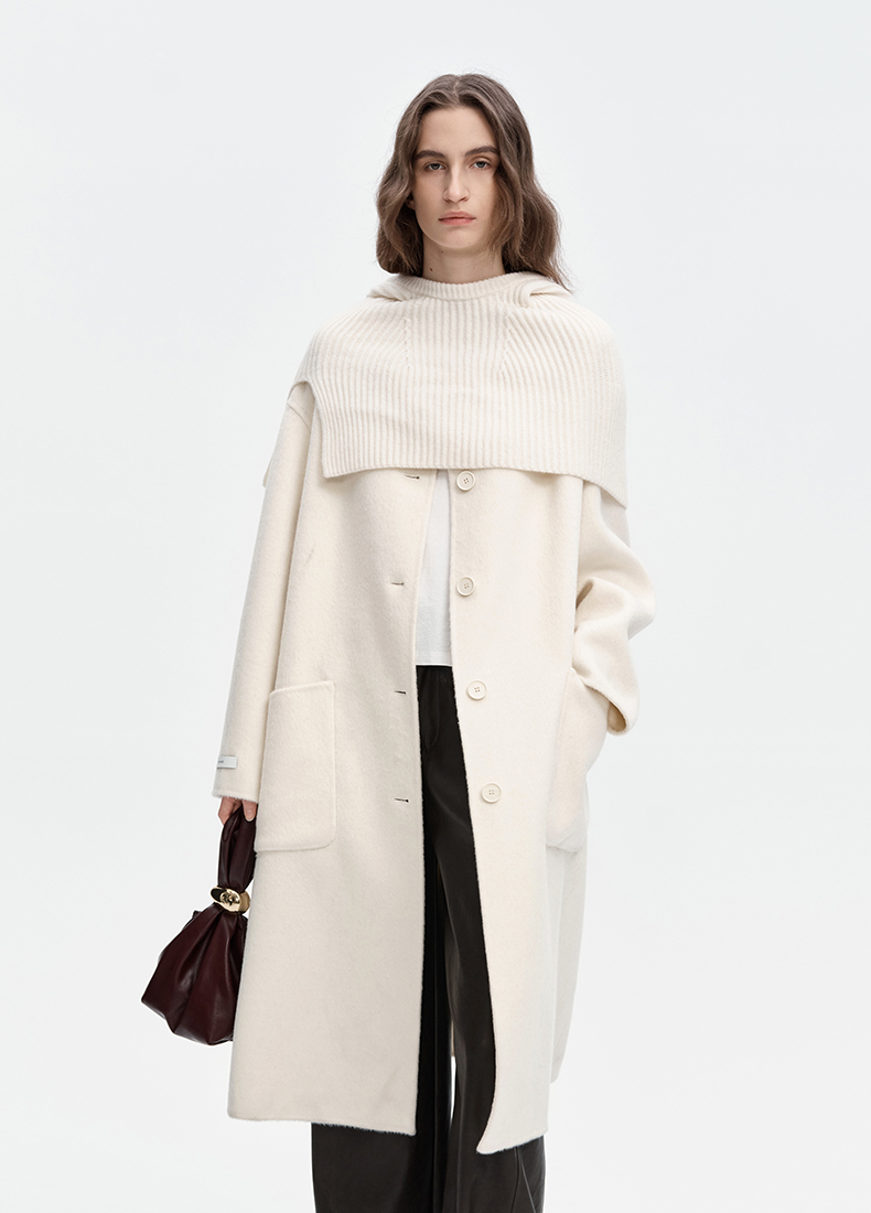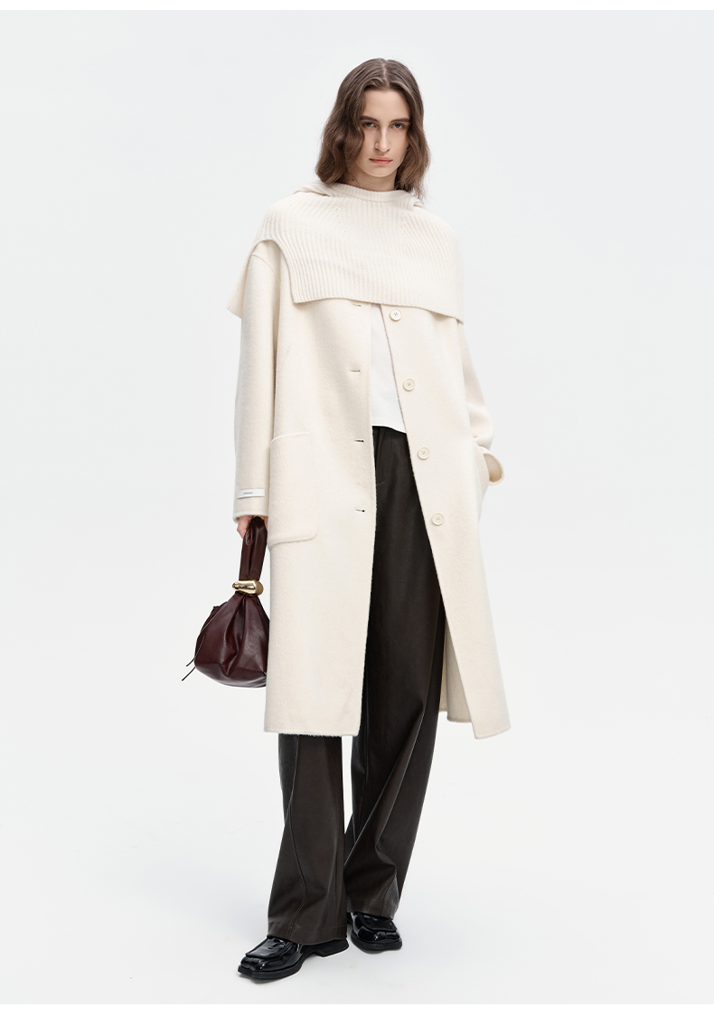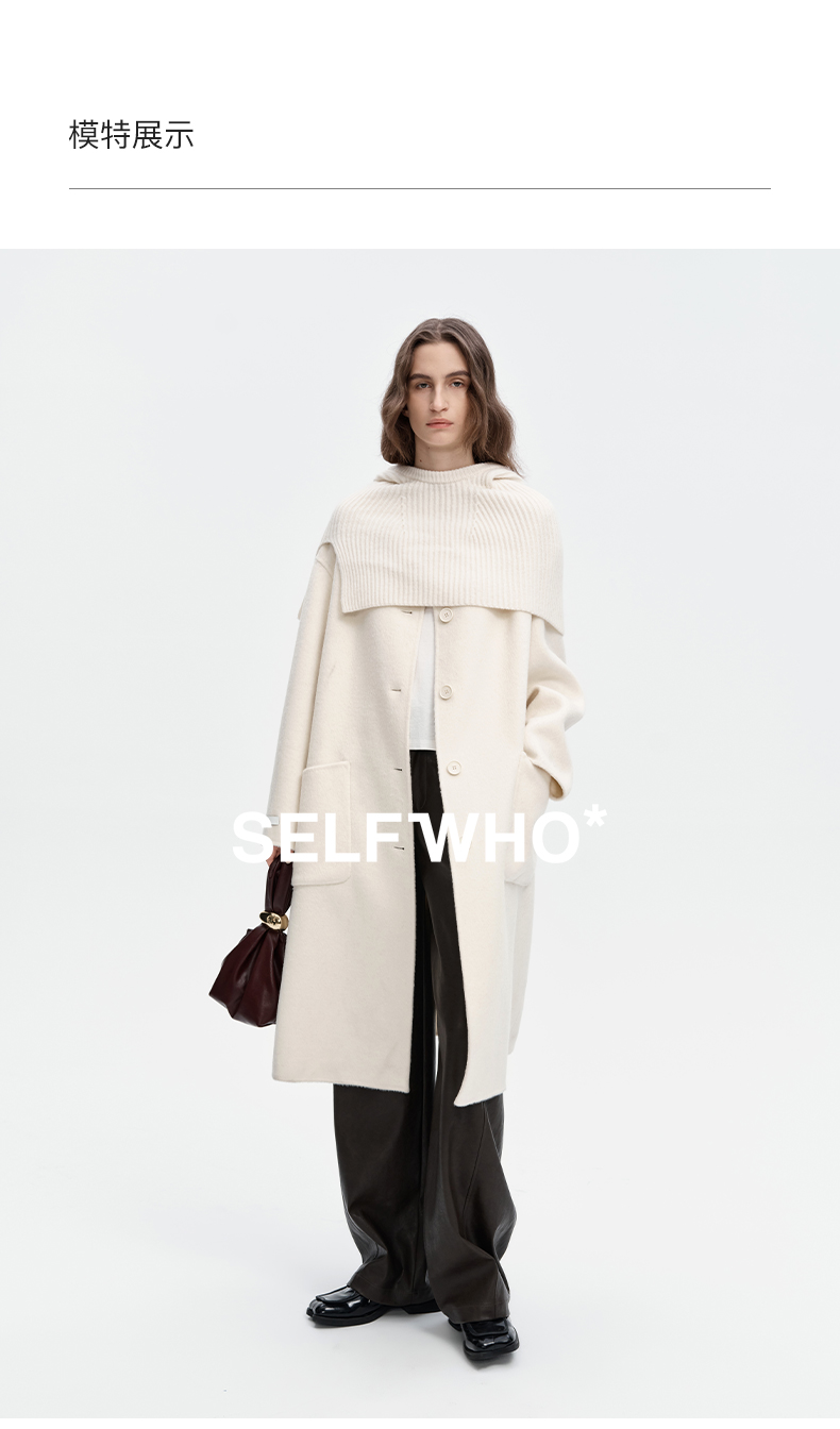 SELFWHO绵羊毛混纺毛织连帽围巾双面呢大衣女2024秋冬单排扣外套