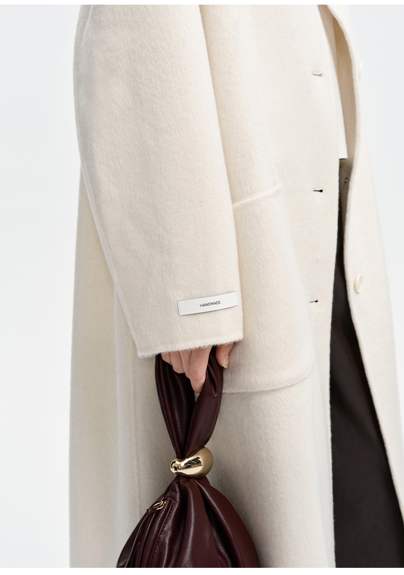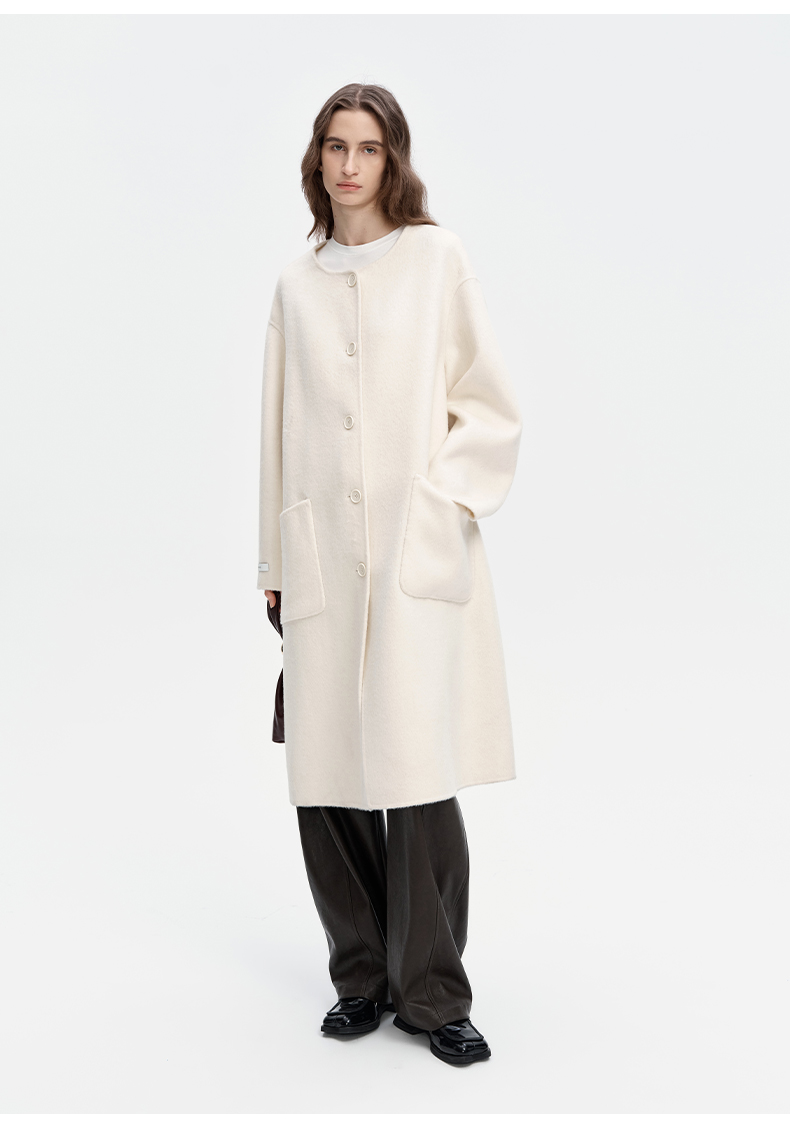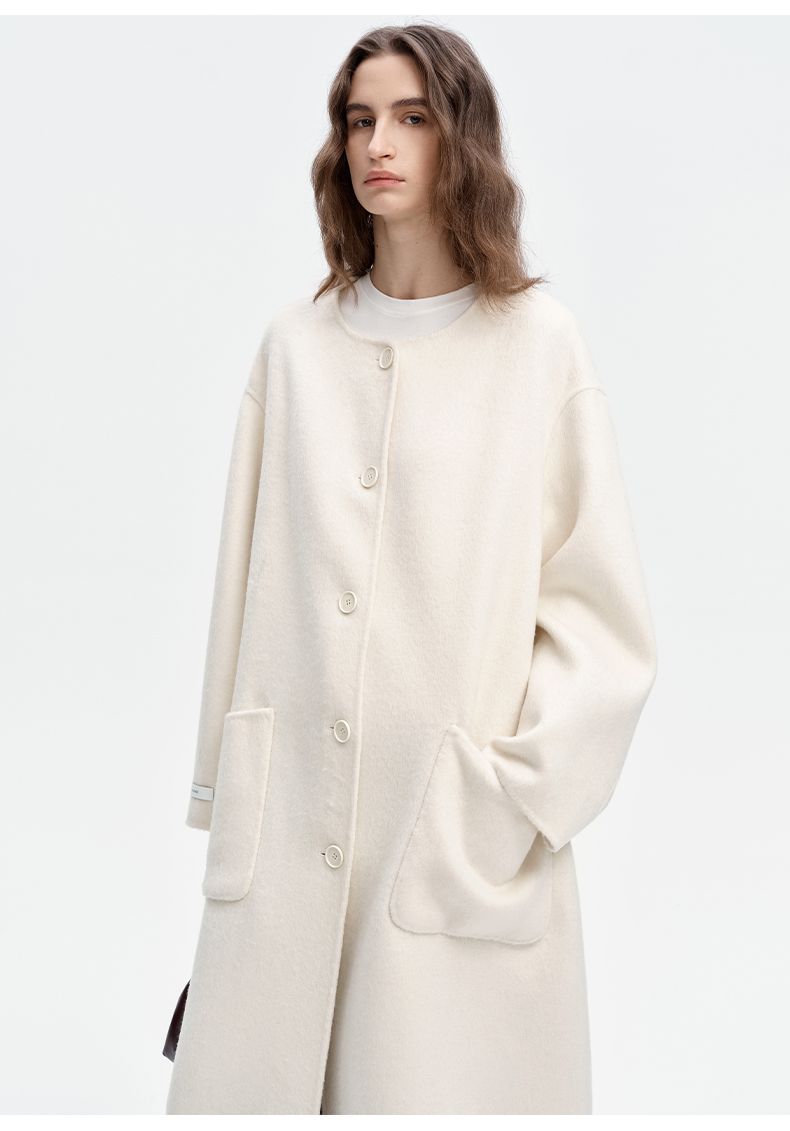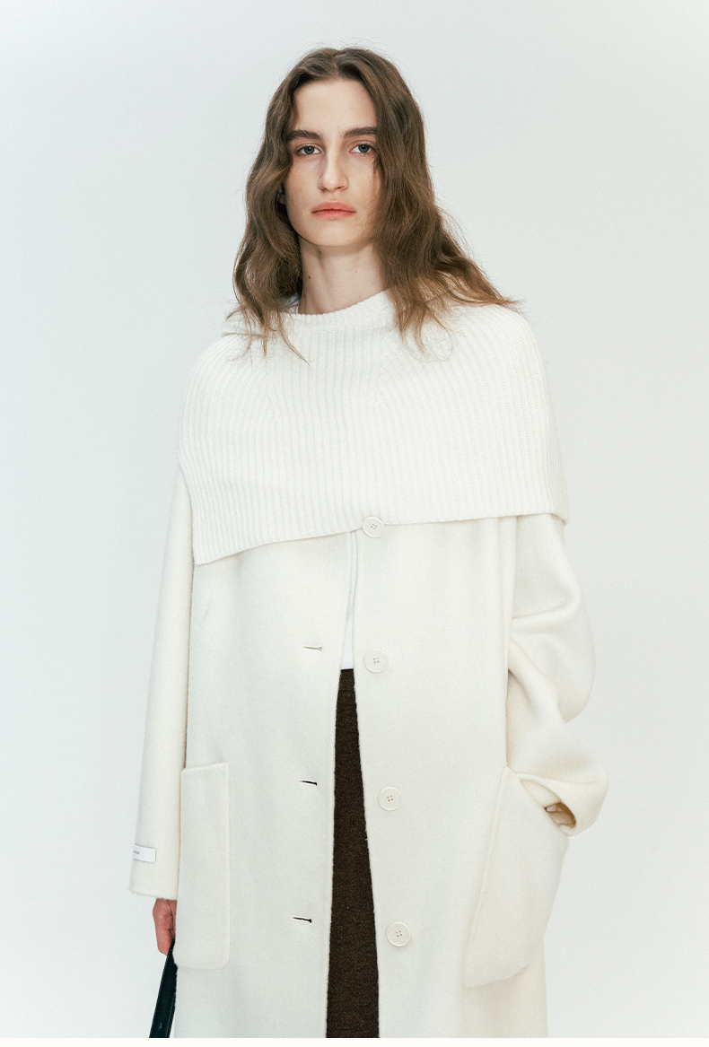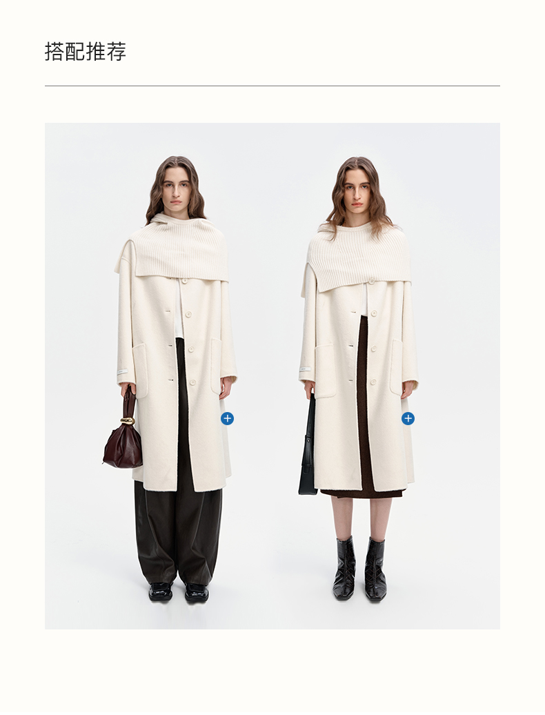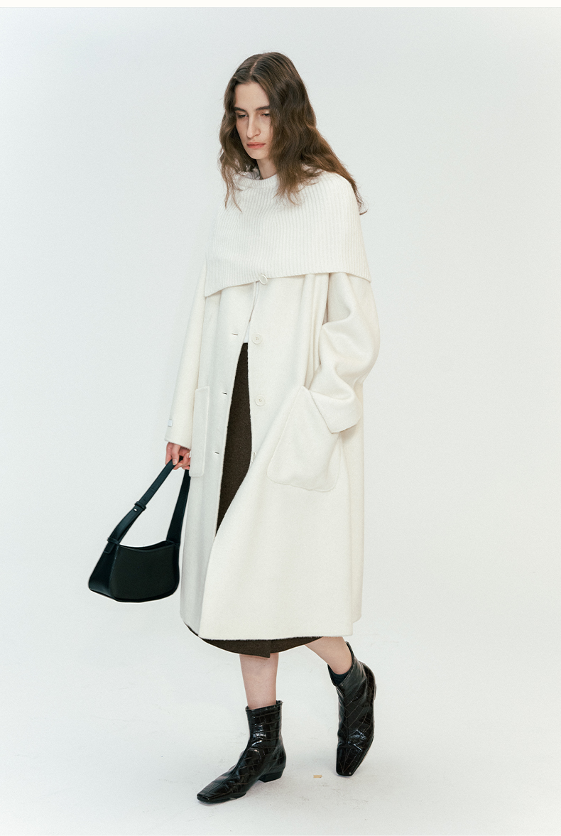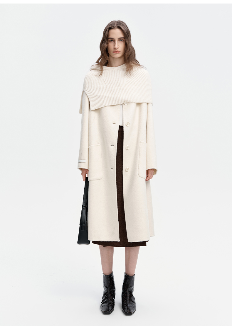 SELFWHO绵羊毛混纺毛织连帽围巾双面呢大衣女2024秋冬单排扣外套