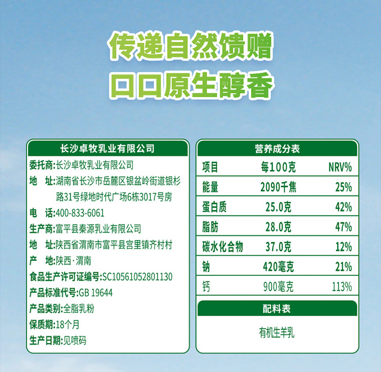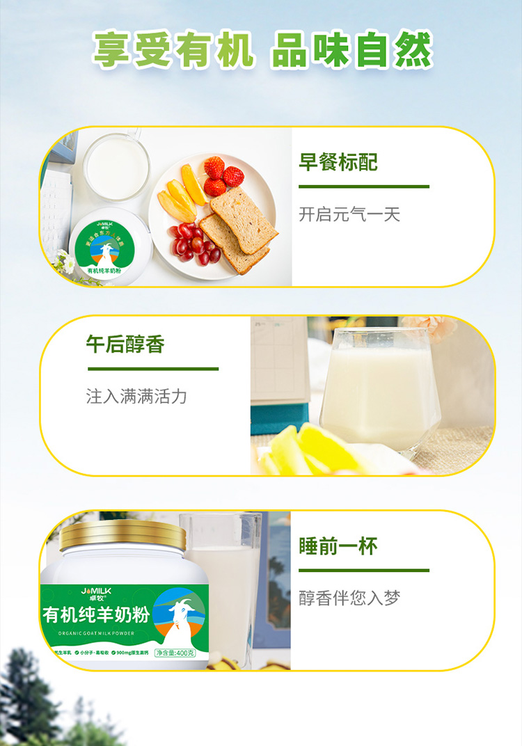 【一乐老师推荐】卓牧Jomilk 有机纯羊奶粉 A2β-酪蛋白 无添加不含蔗糖儿童中老年成人全脂羊奶粉400g*罐