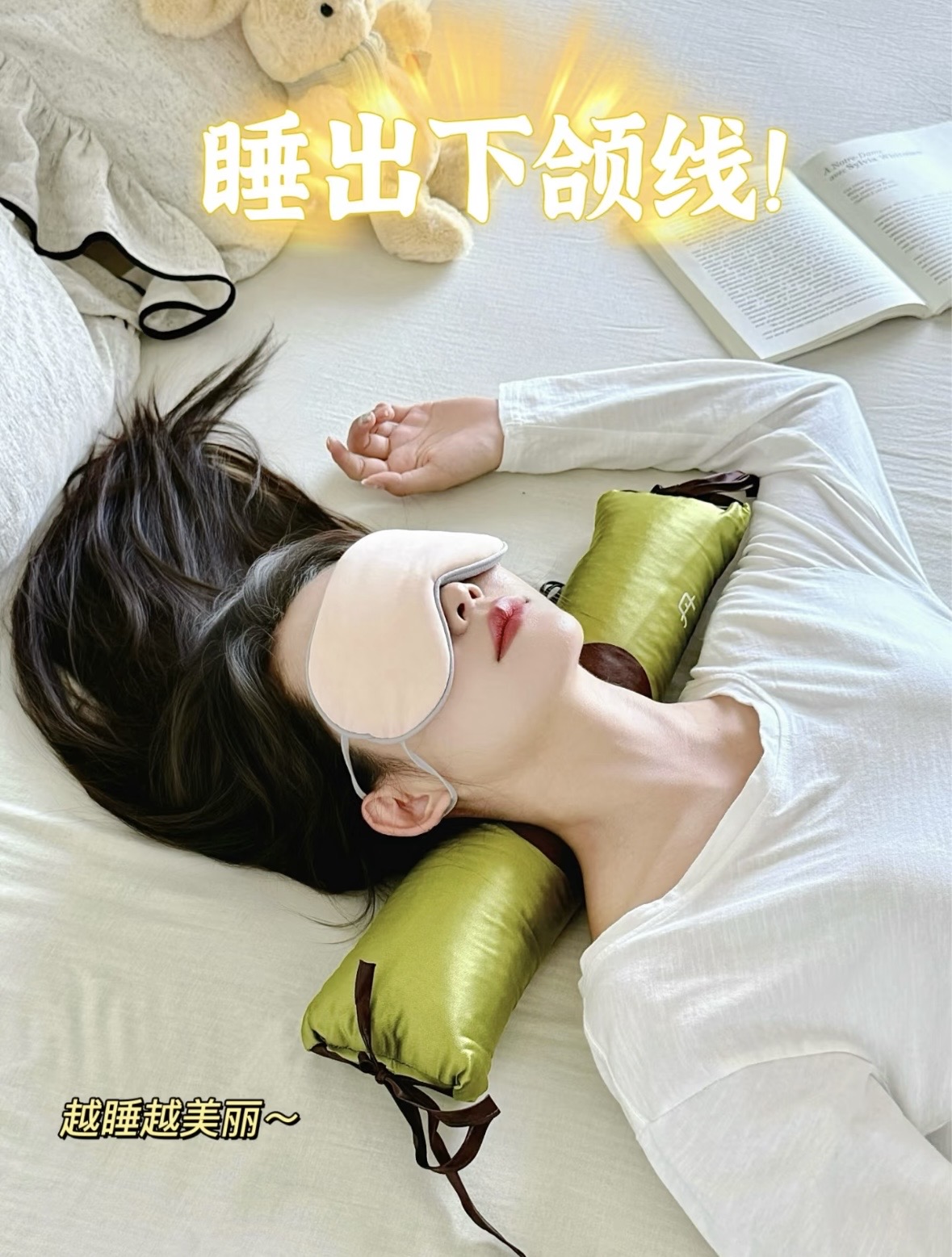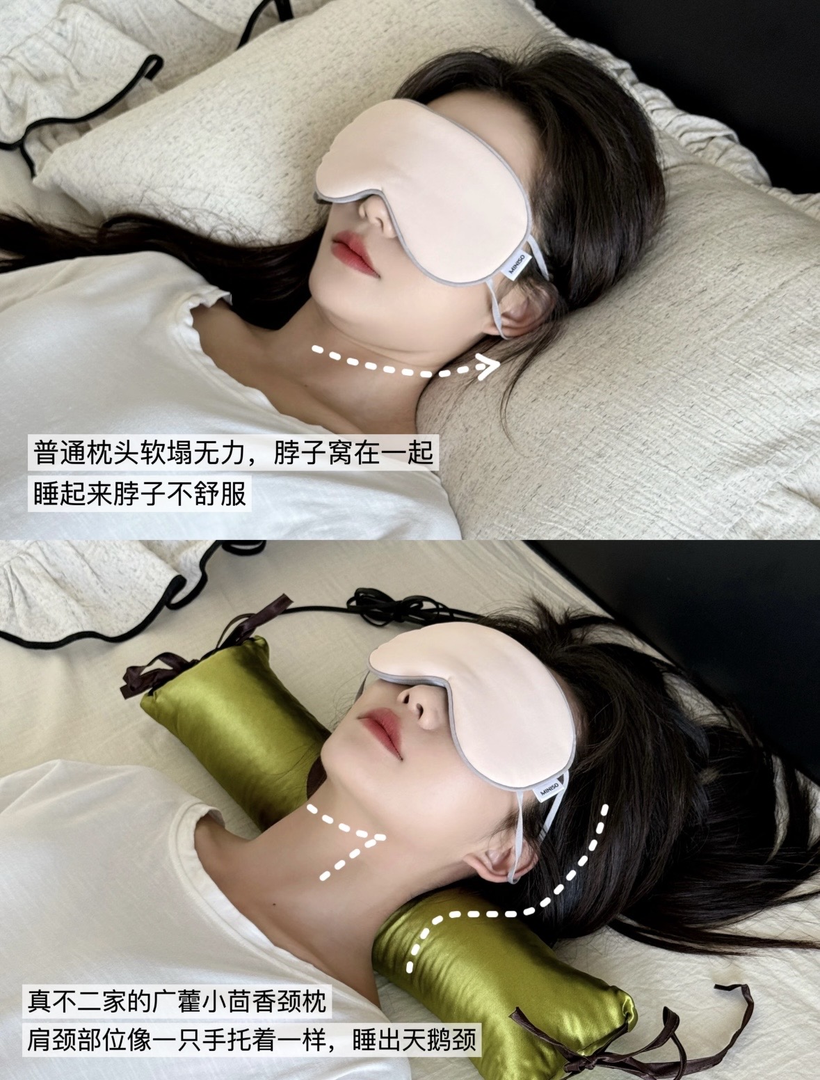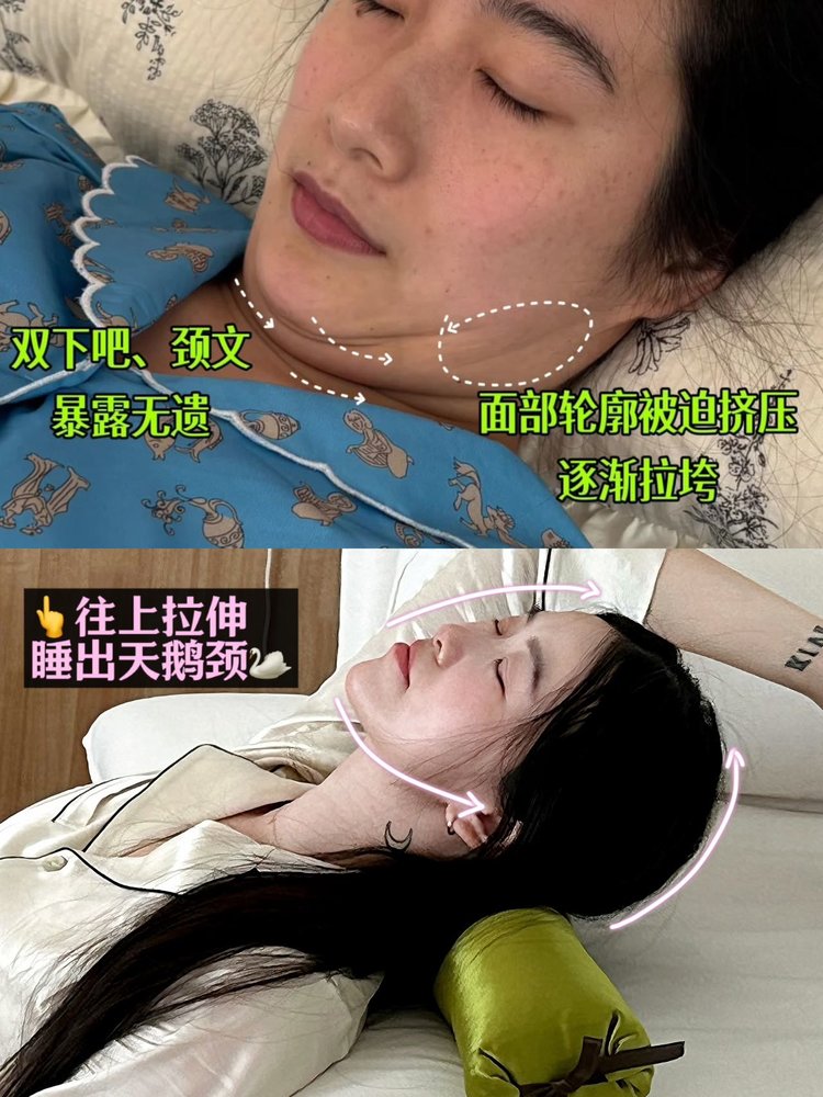 ❌用之前:窝着睡,下巴有几层,颈纹一堆