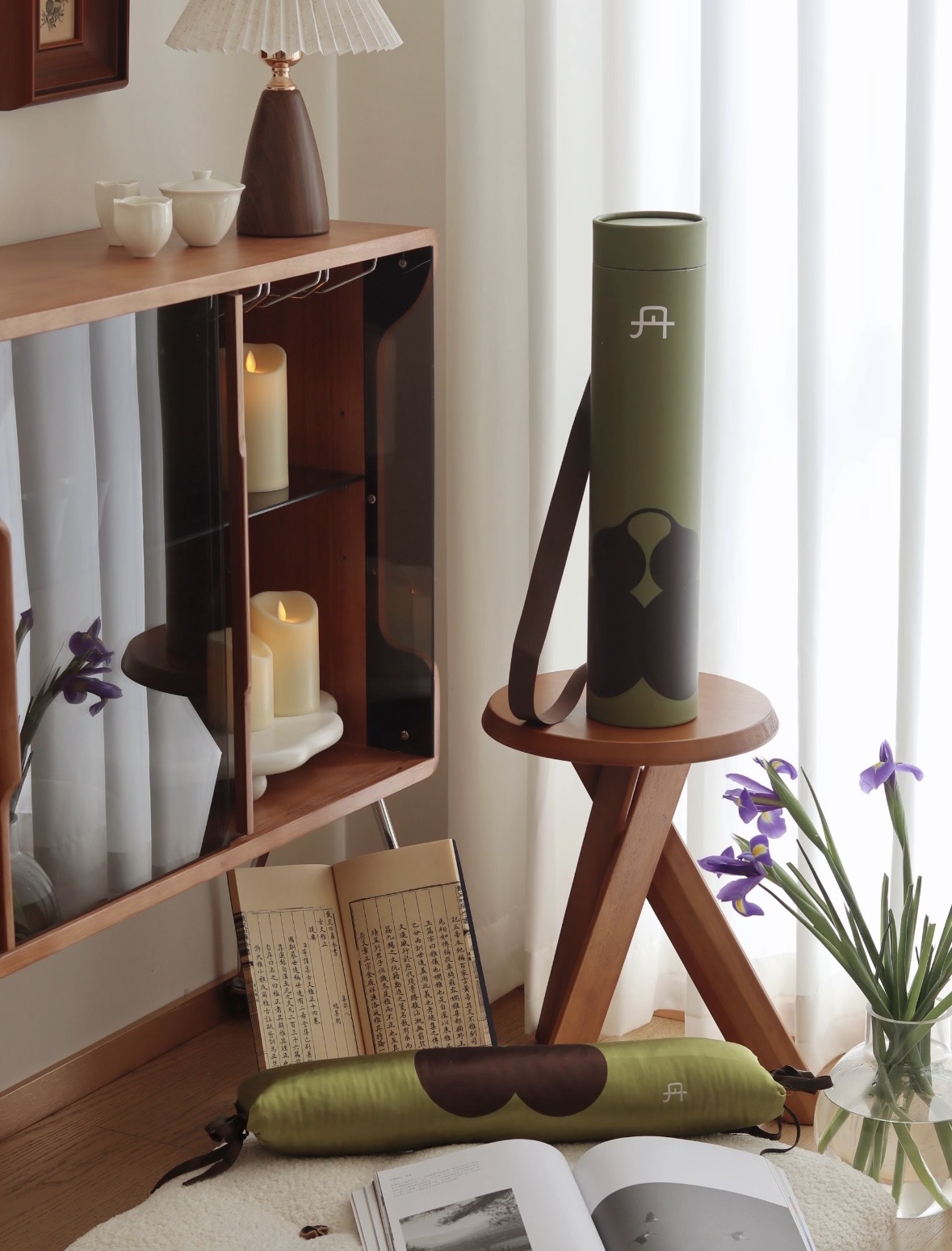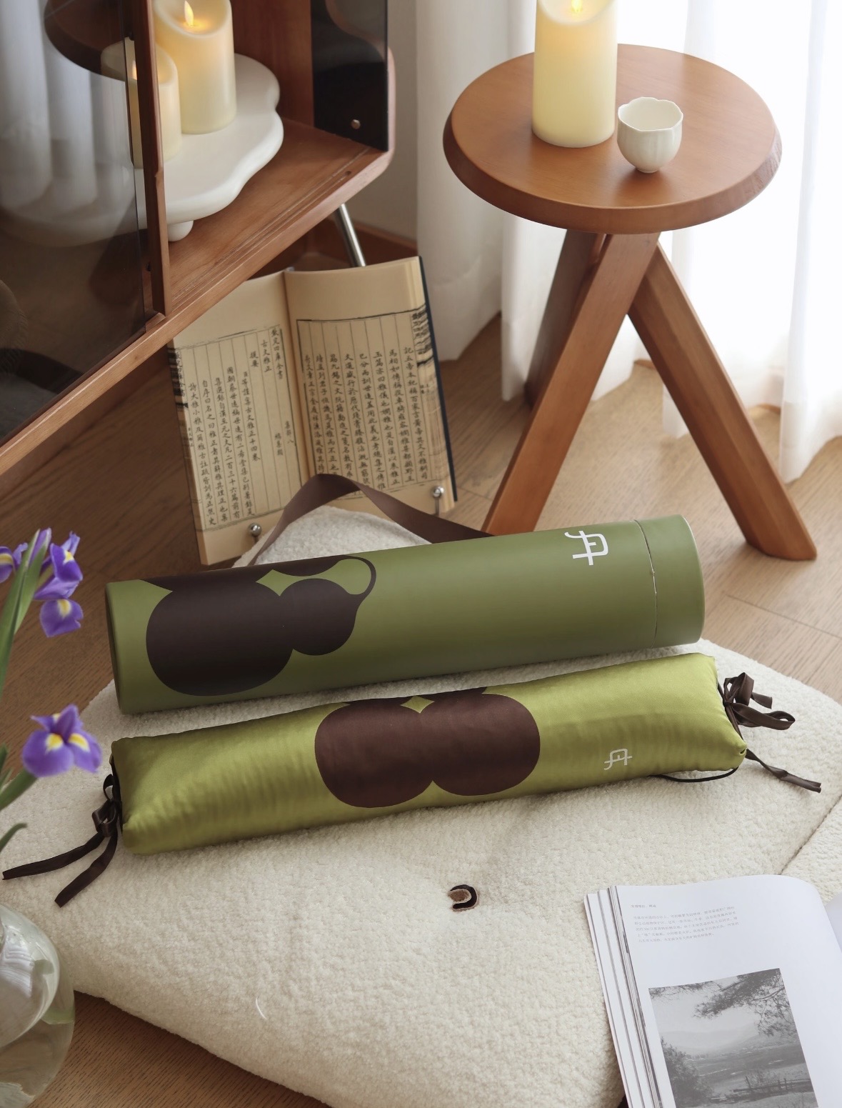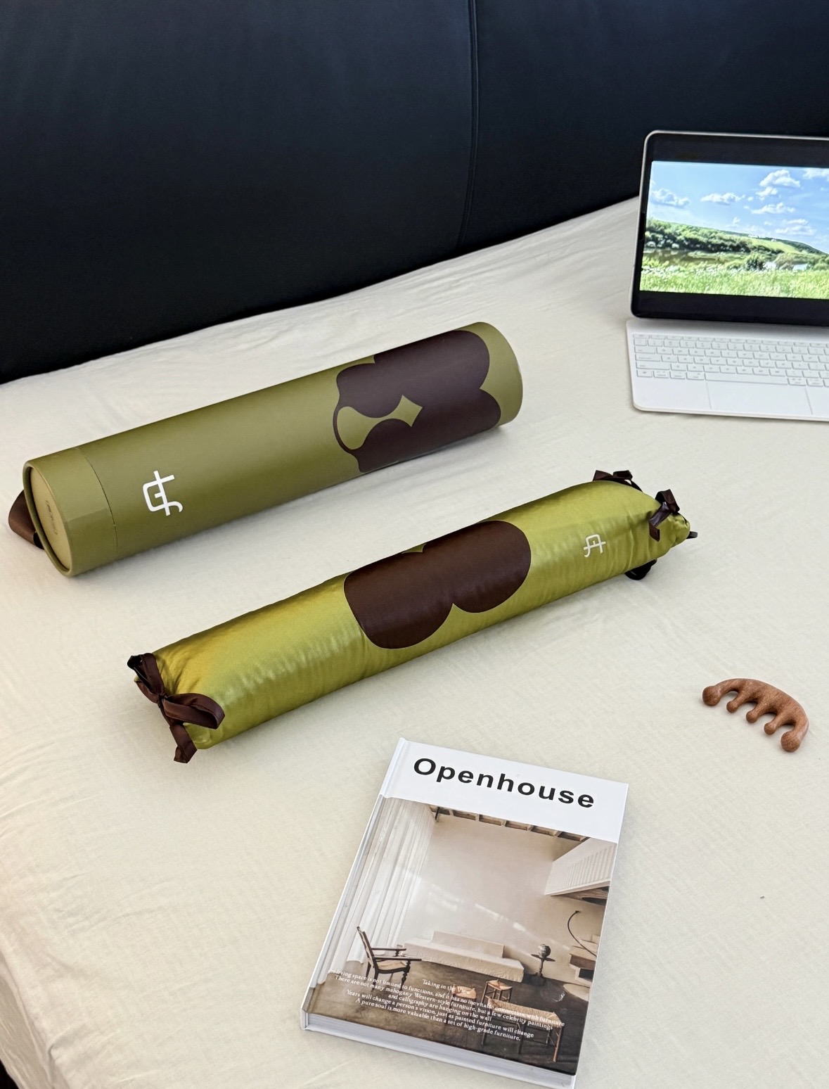 把广藿小茴香加热颈枕拿出来,放在草坪上,靠上去休息