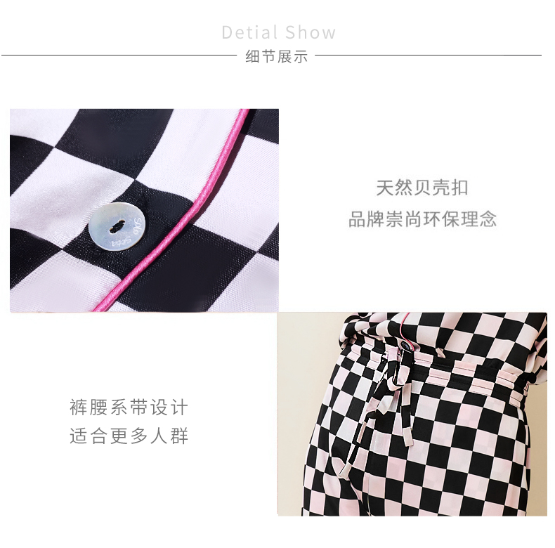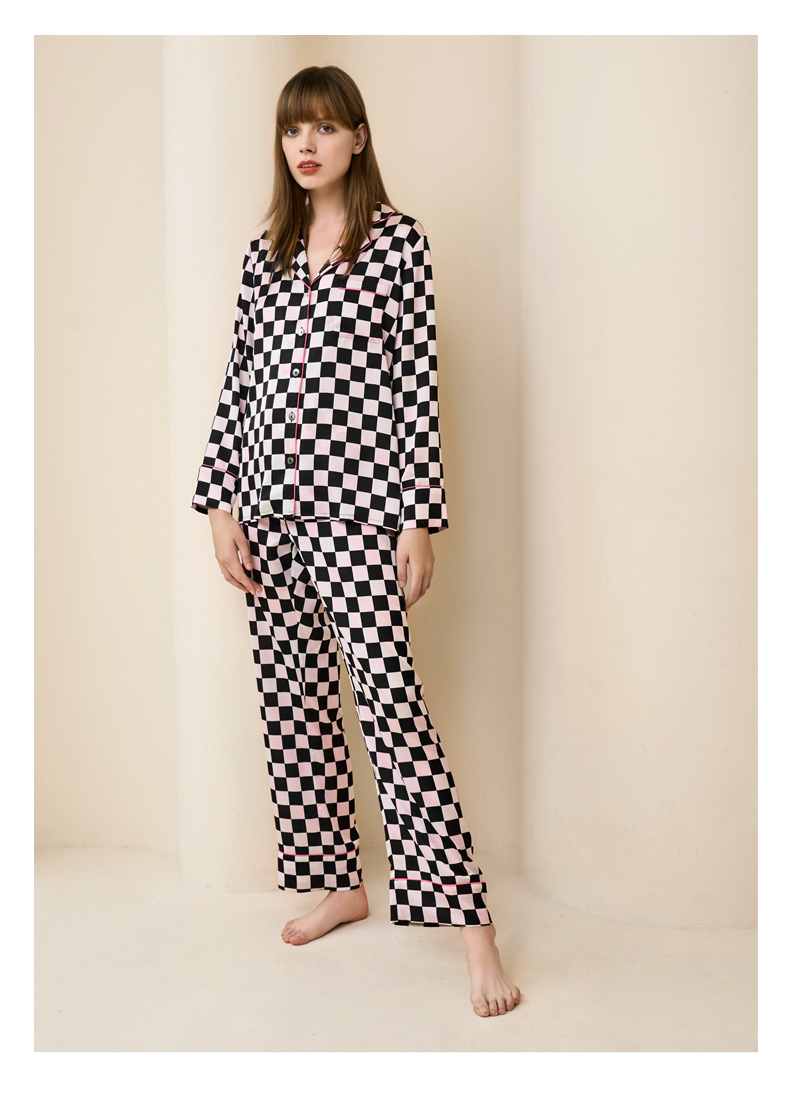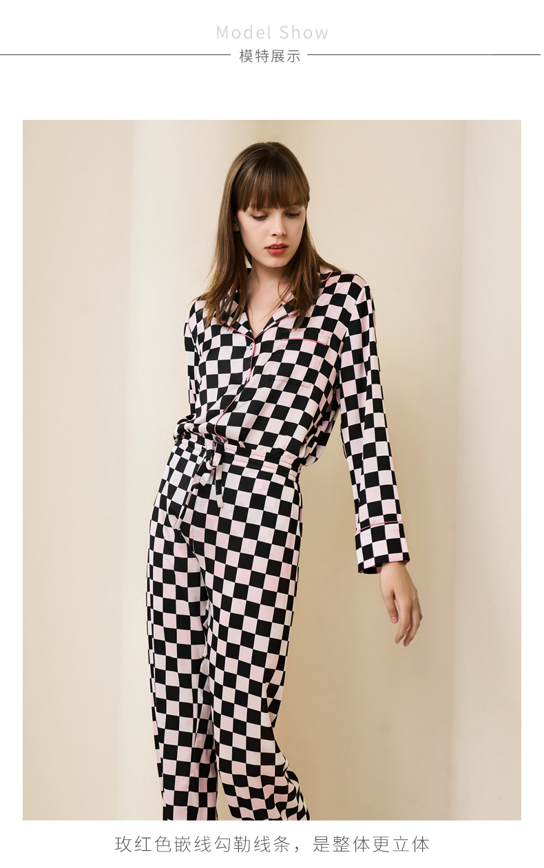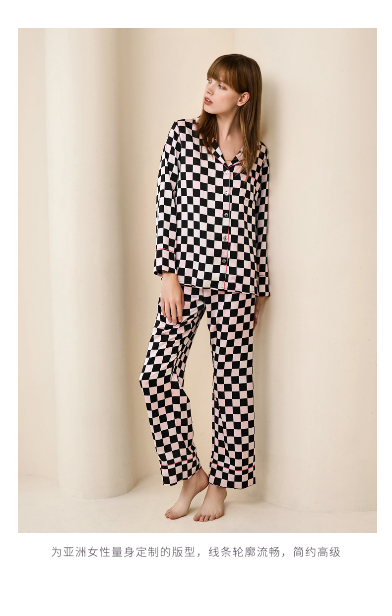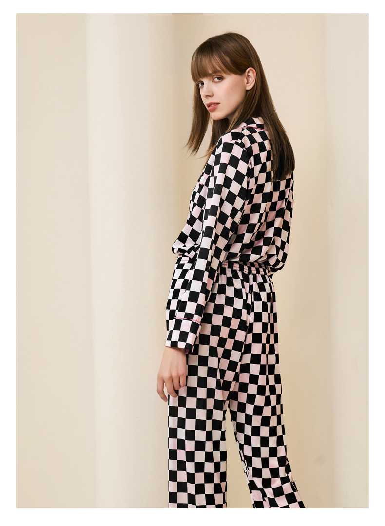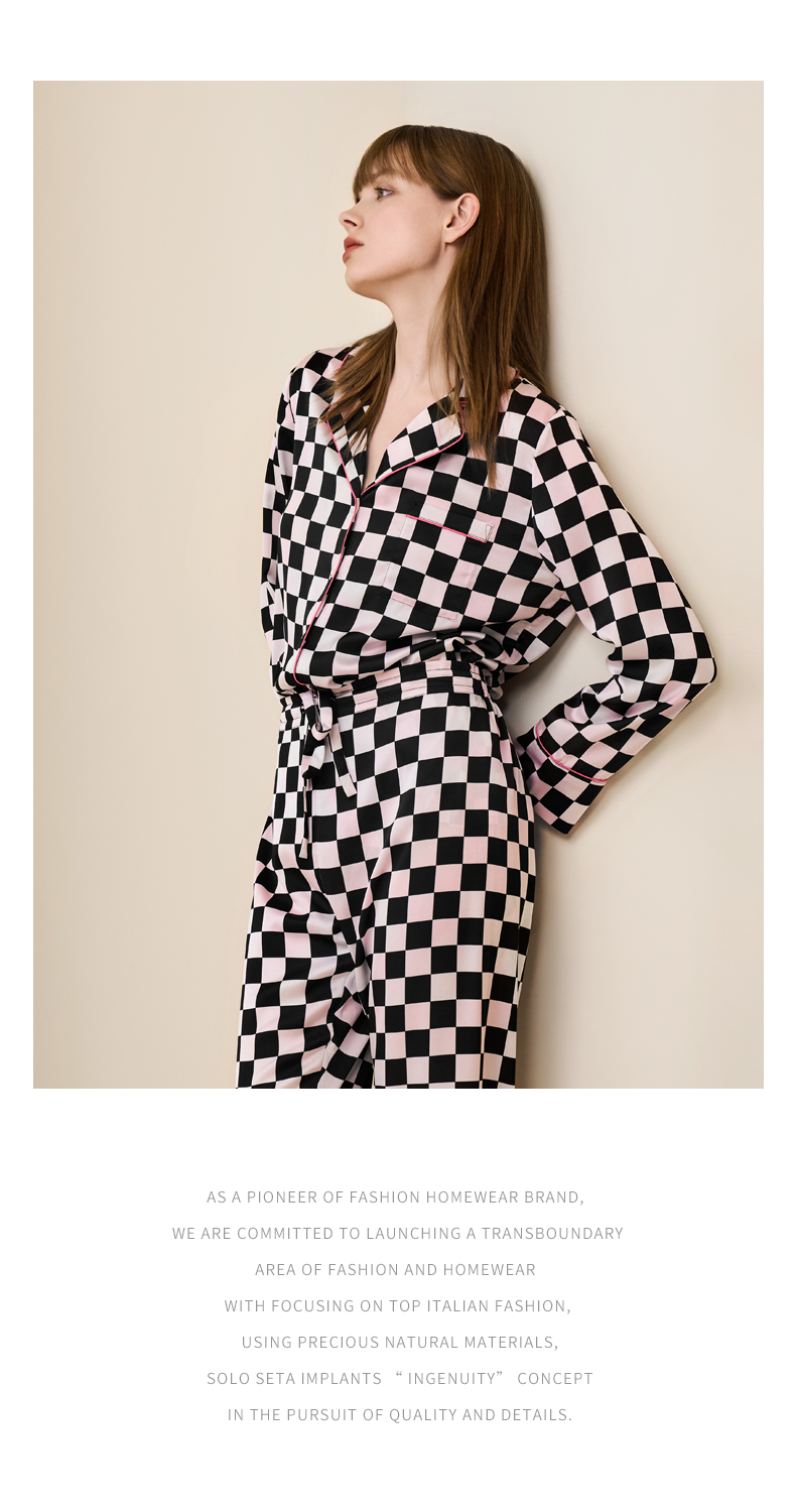 Solo seta桑蚕丝睡衣套装女长袖家居服丝绸印花棋盘格子2025