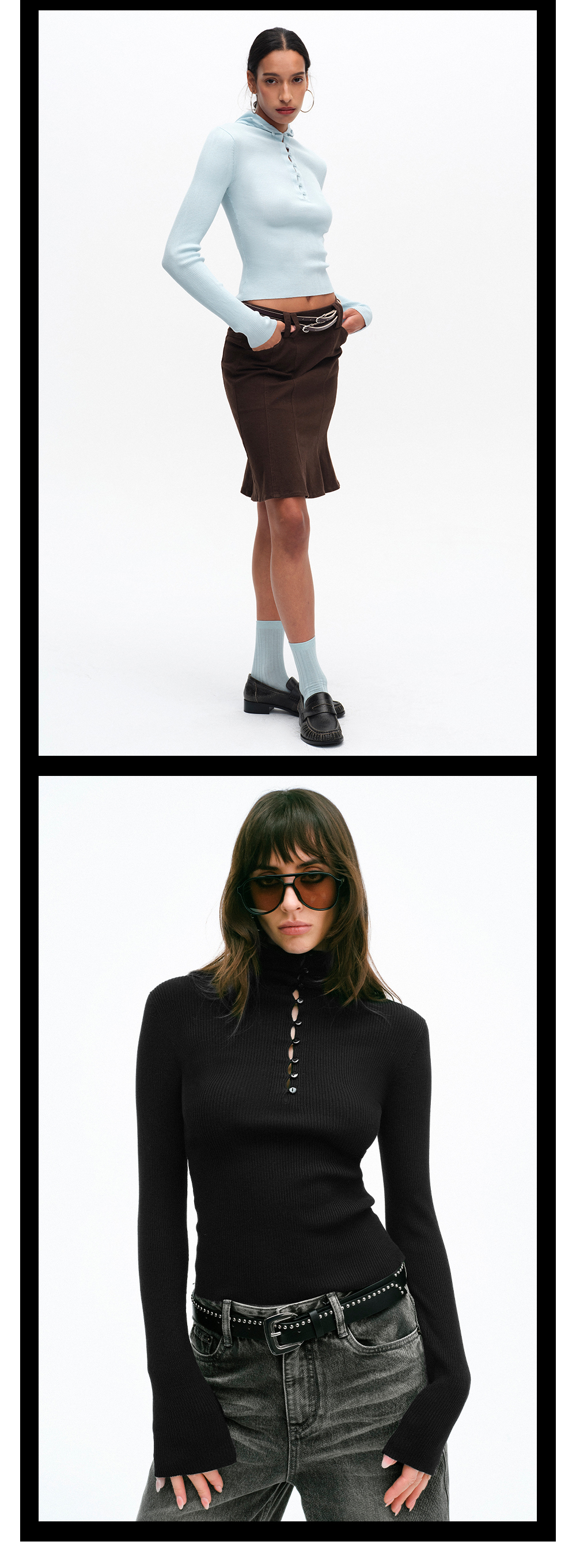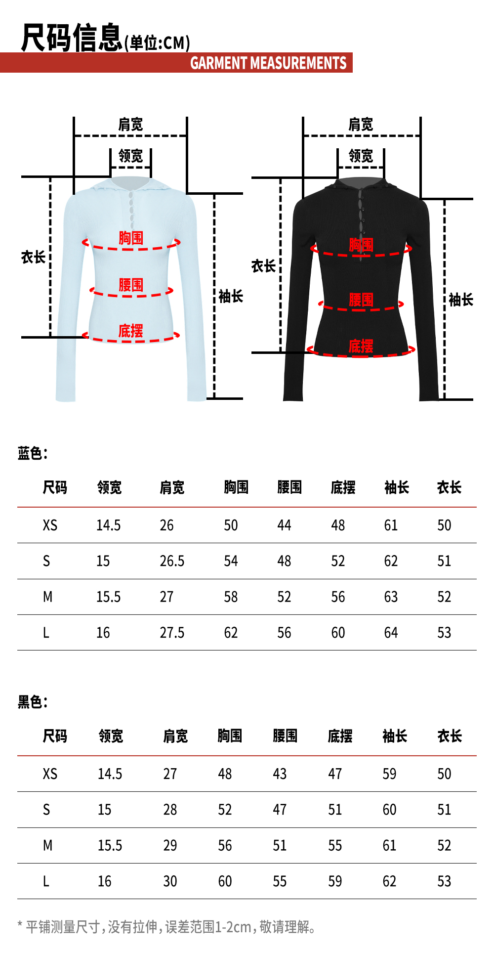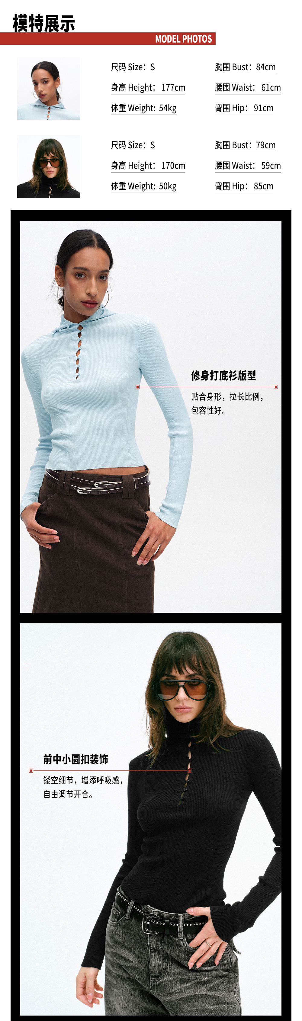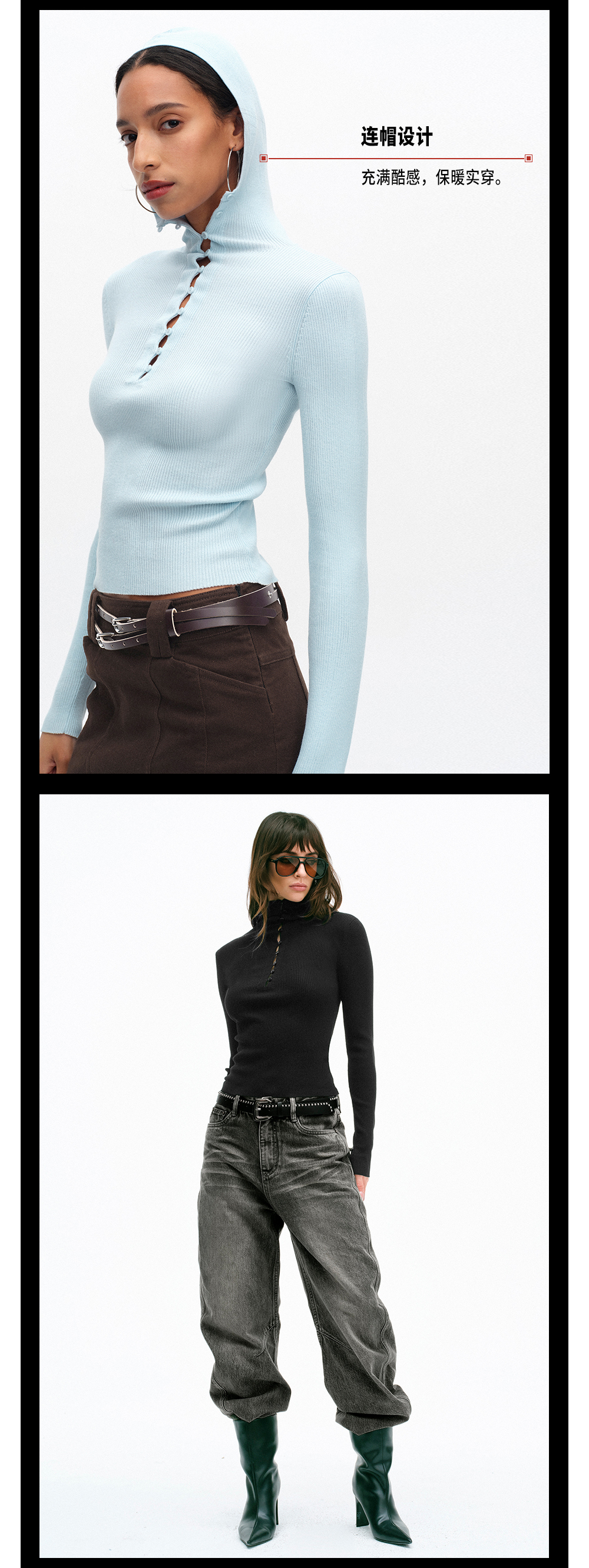 TR她热 云感衫 黑色蓝色弹力针织连帽纽扣修身百搭显瘦打底衫上衣