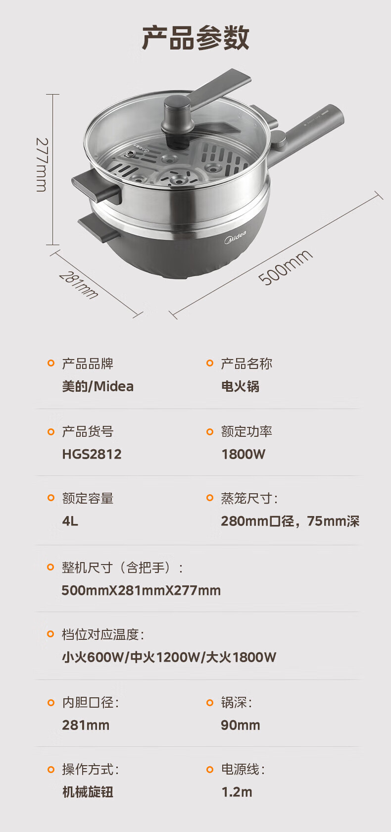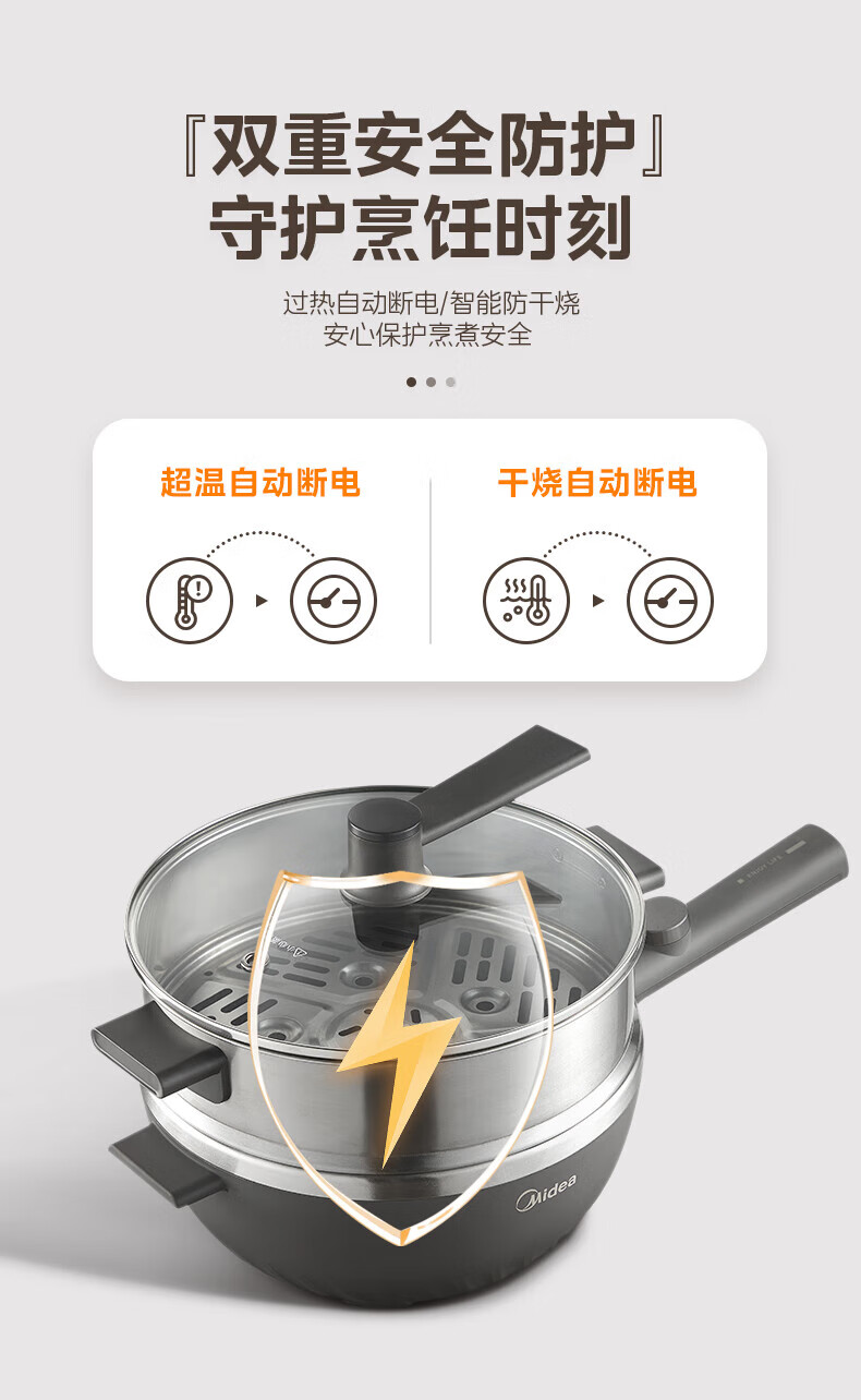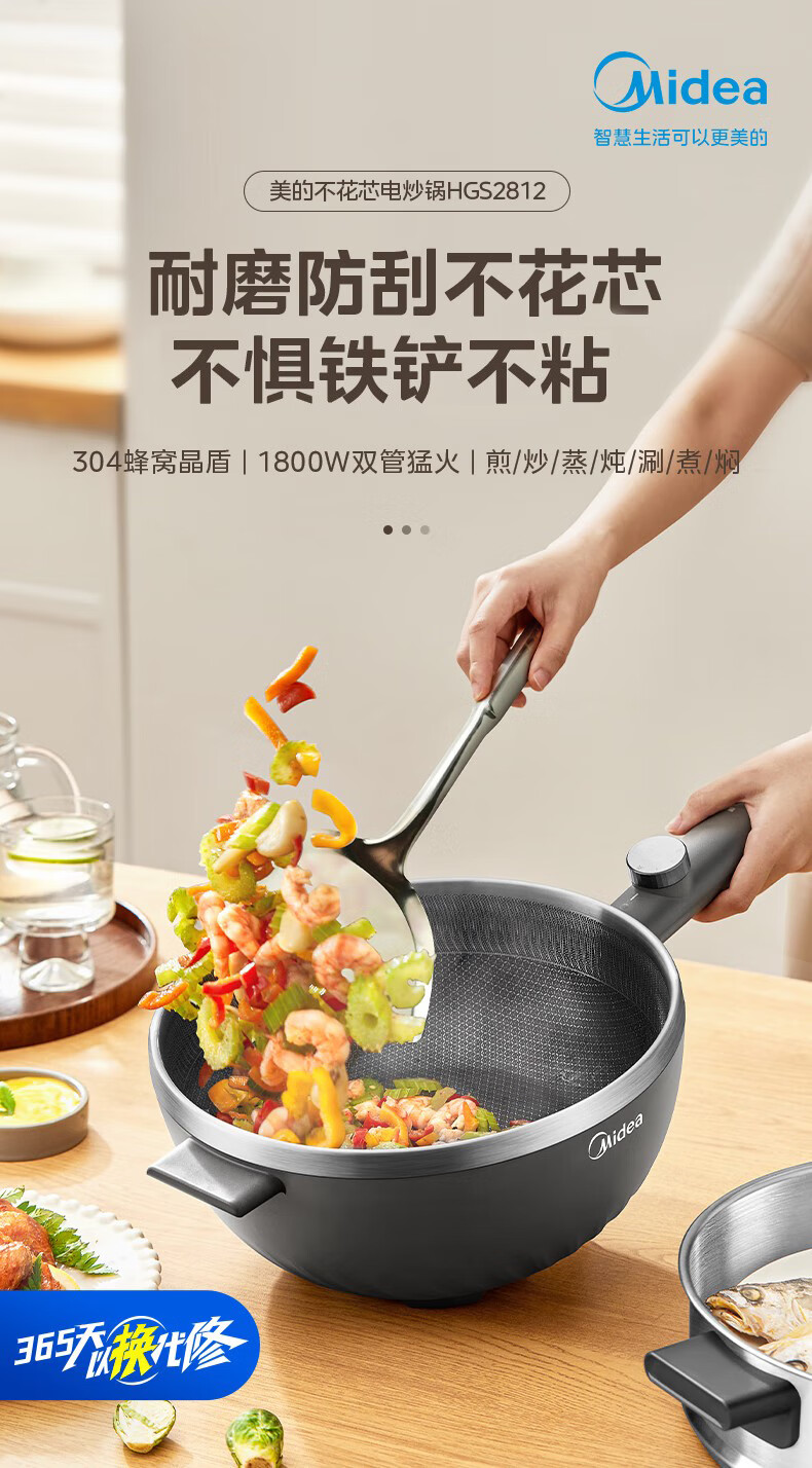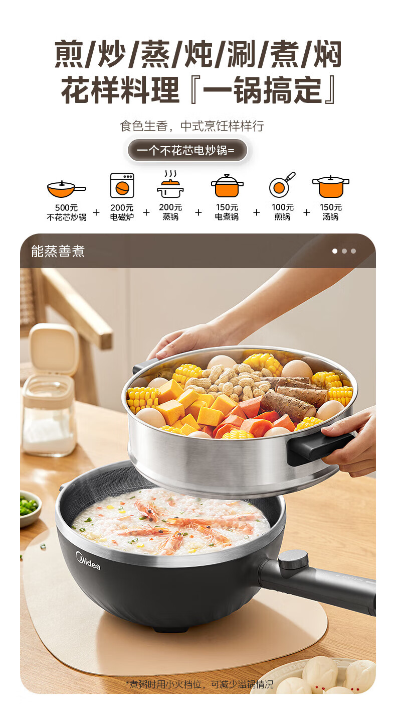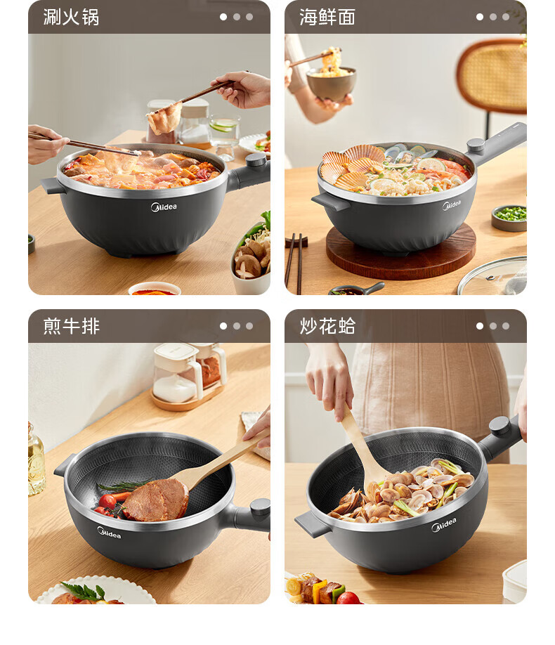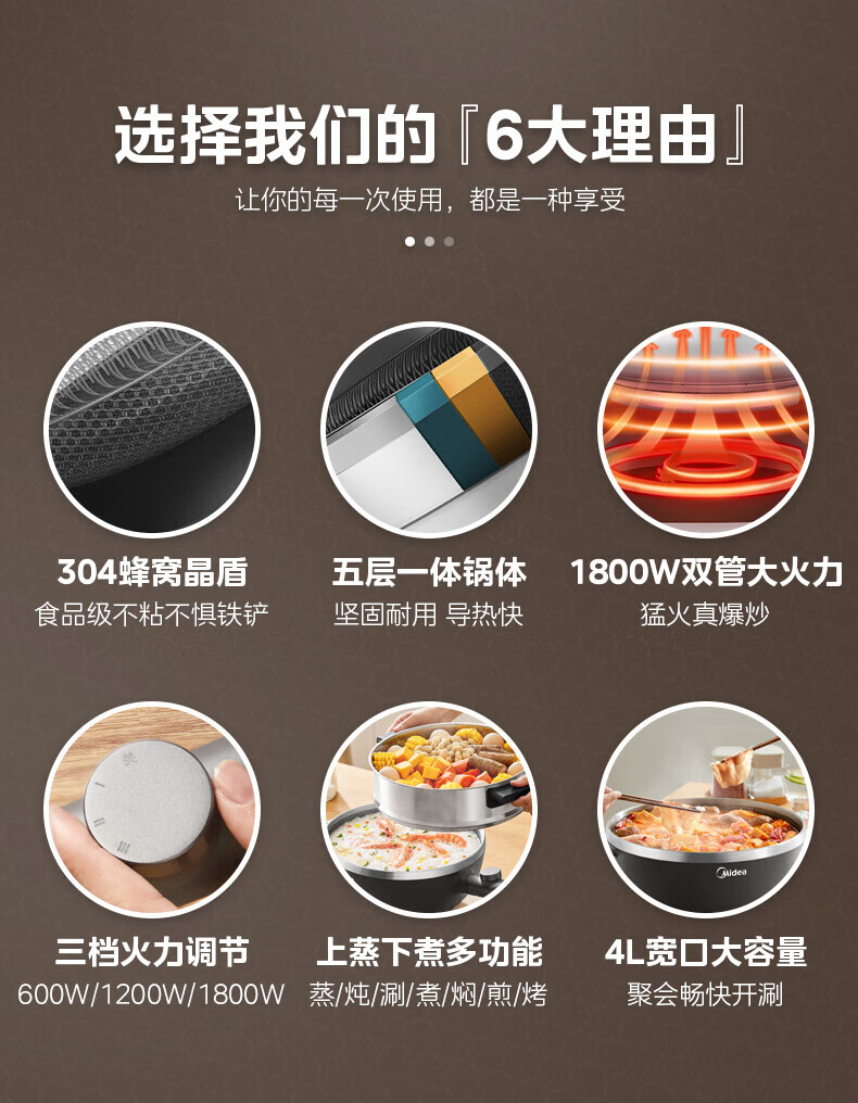 美的(Midea)电炒锅 多用途锅 电蒸锅 电煮锅 电火锅 家用蒸锅多功能锅炒菜锅 蒸煮一体锅 蜂窝晶盾不粘锅 4L MC-HGS2812