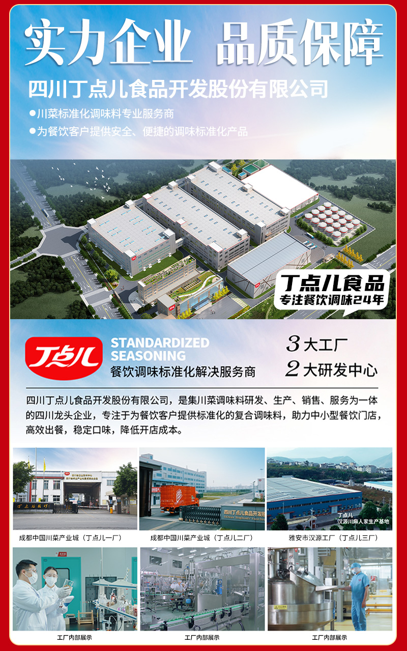 四川丁点儿食品开发股份有限公司,是集川菜调味料研发、生产、销售、服务为一体的现代化企业,专注为餐饮客户提供川菜调味解决方案。公司成立至今,服务了超百万家的餐饮门店以及连锁品牌。