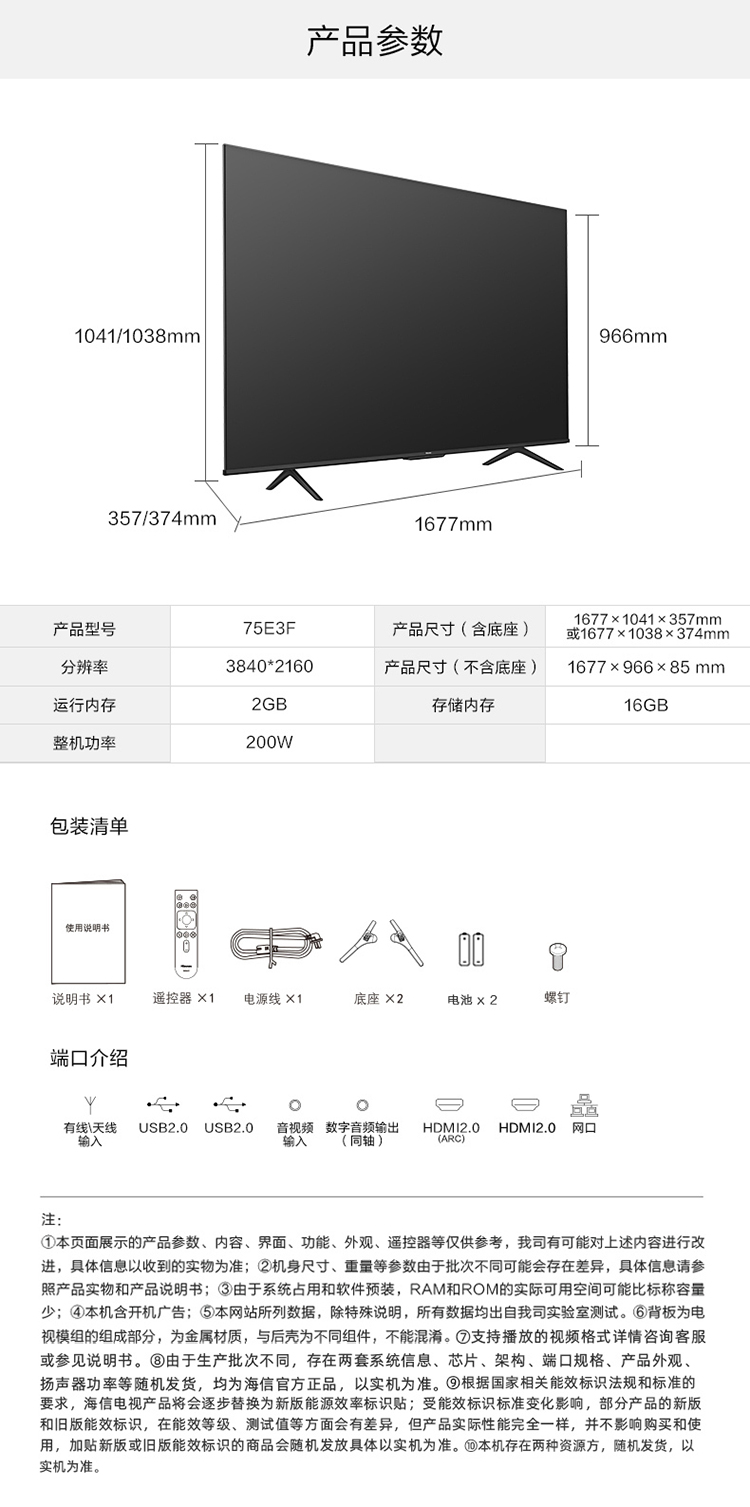 海信电视 75英寸 75E3F 4k超高清 16G大内存超薄全面智慧屏 智能网络投屏家用彩电大屏 液晶平板电视机