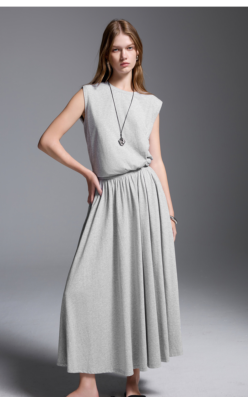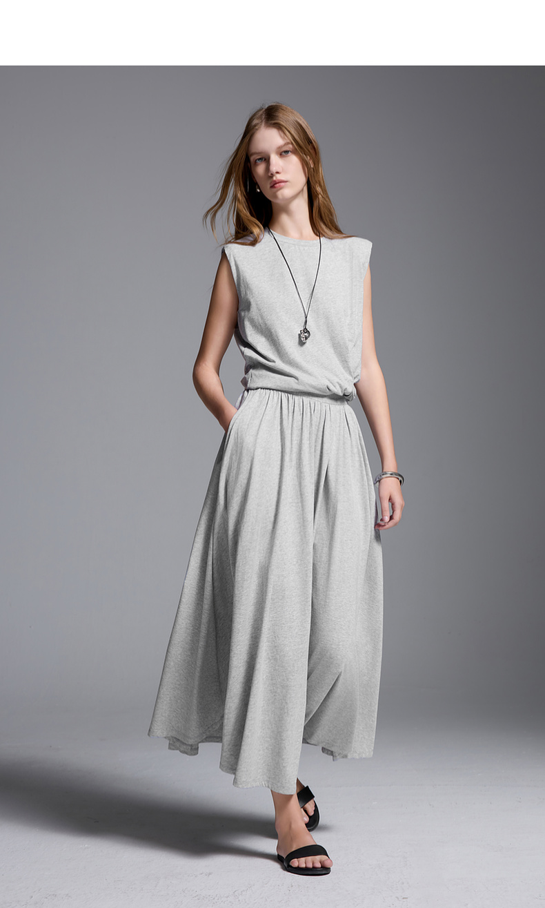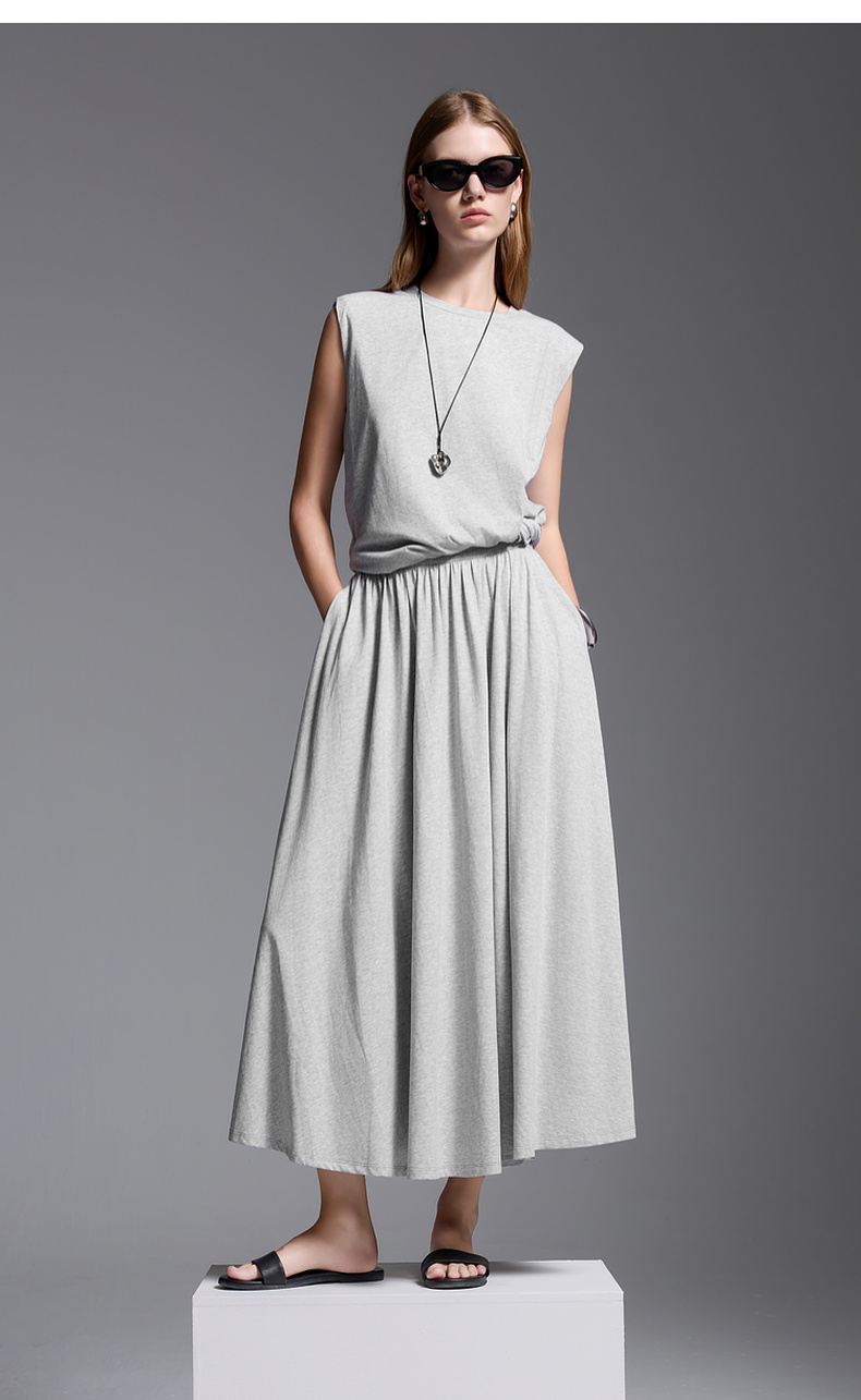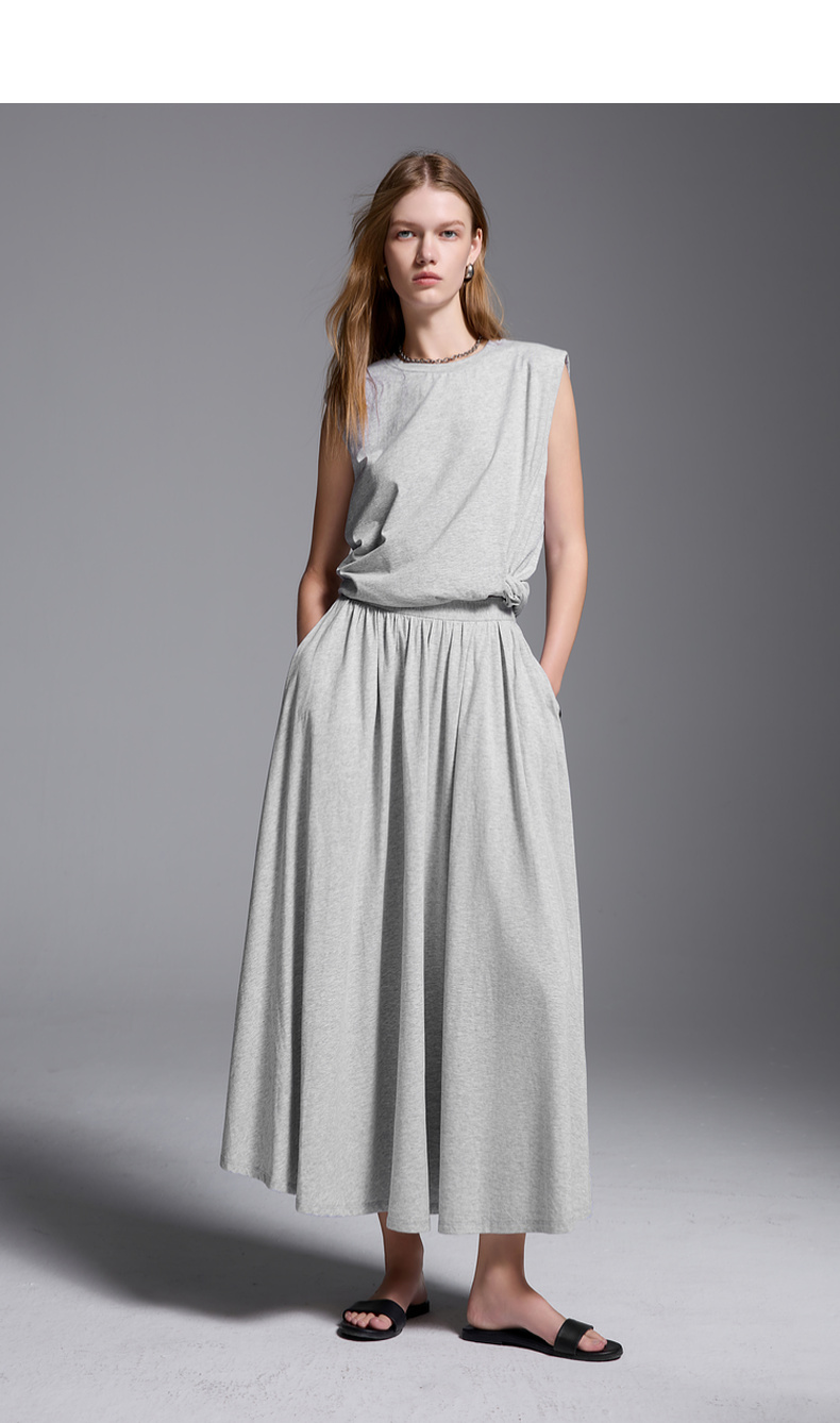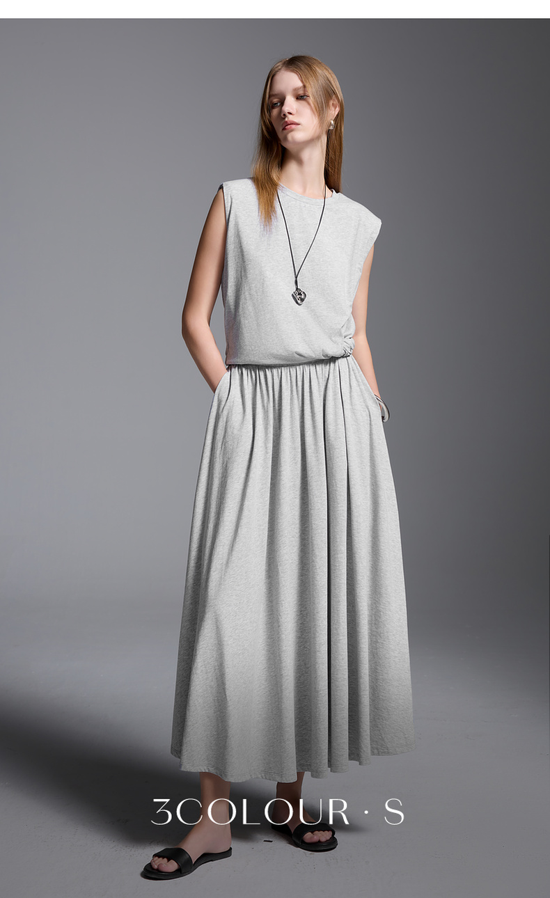 三彩2025夏季新款极简风套装圆领无袖垫肩上衣松紧腰半身裙S