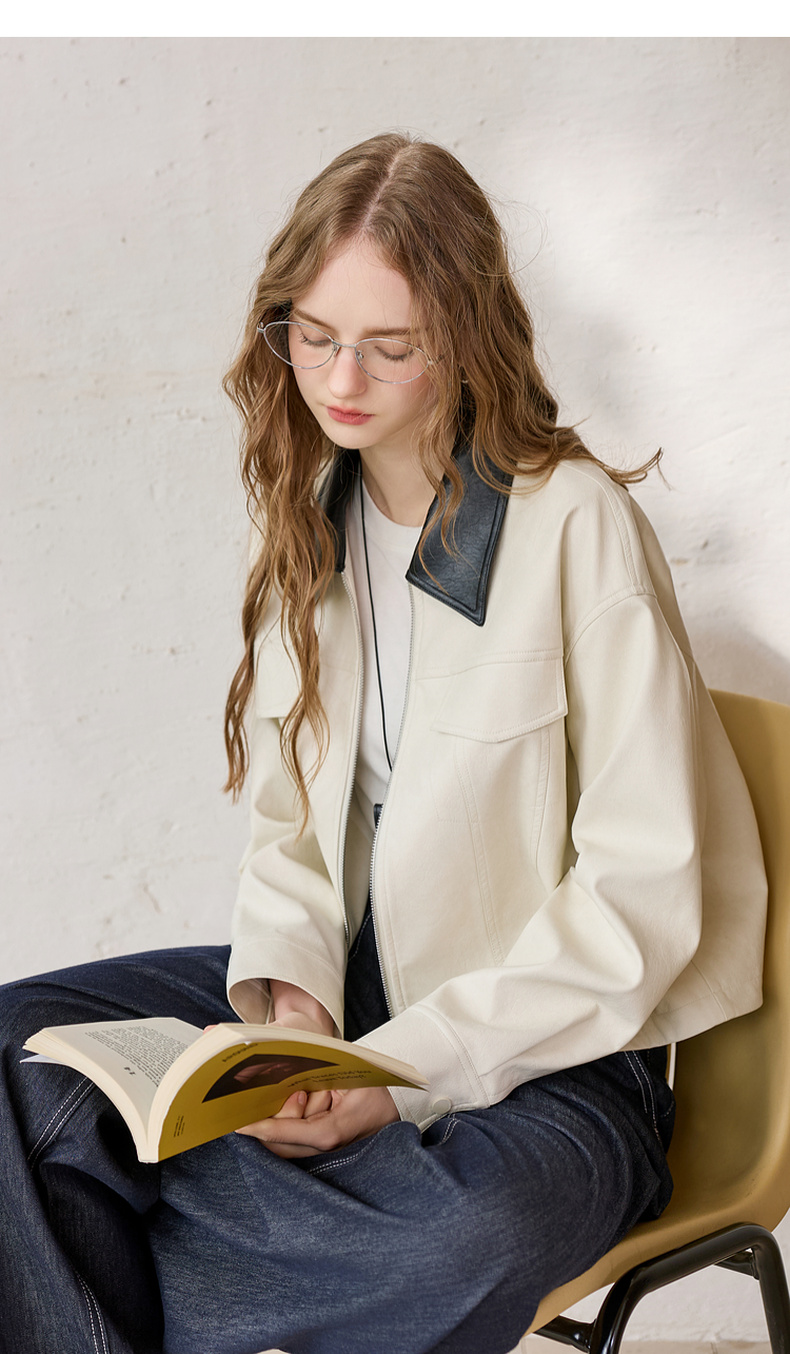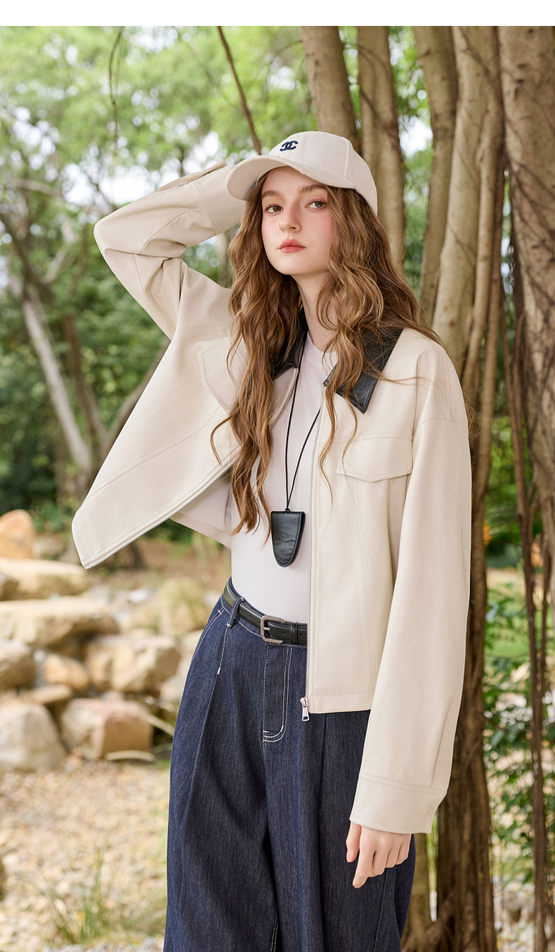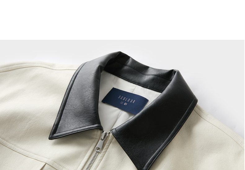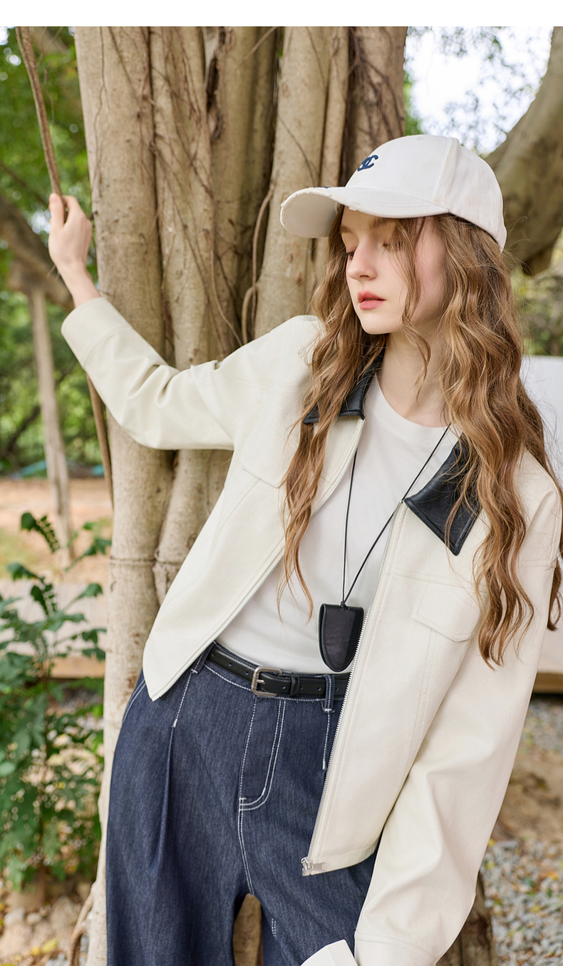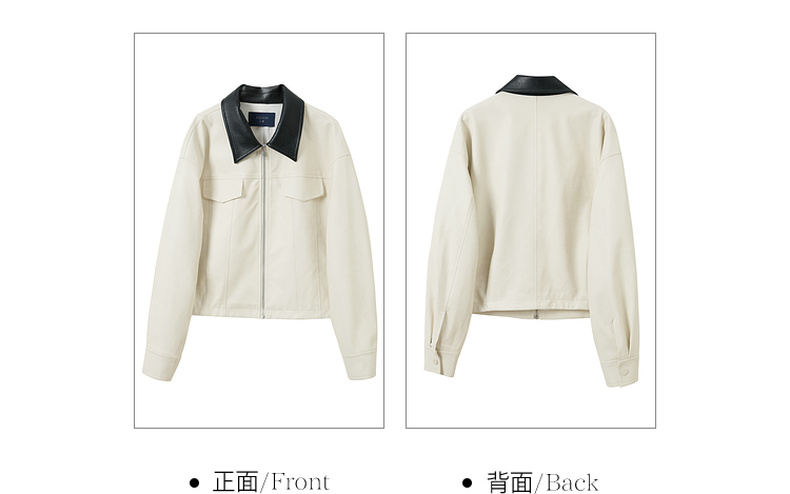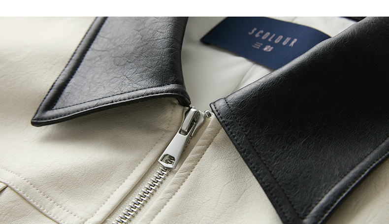 三彩2026春季新款宽松短款PU皮外套撞色翻领夹克上衣拉链开衫M