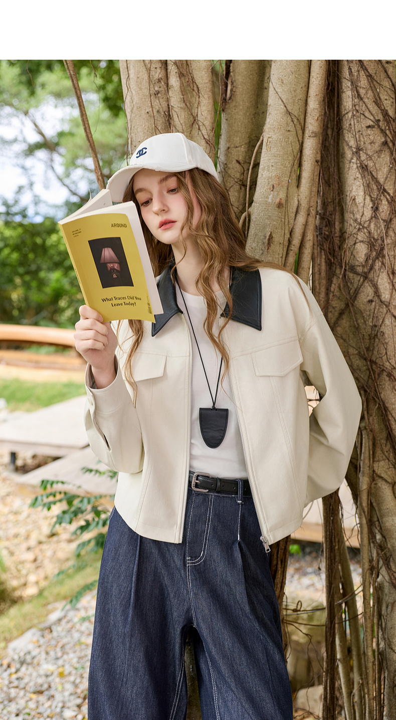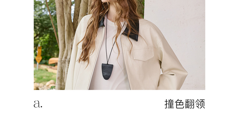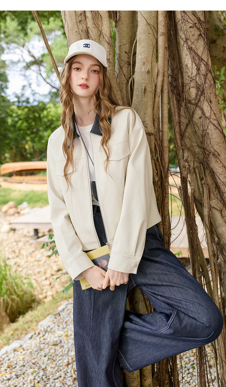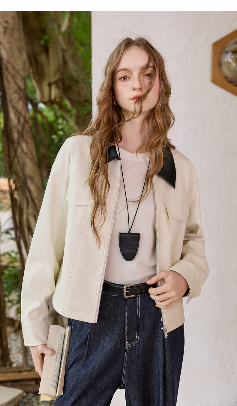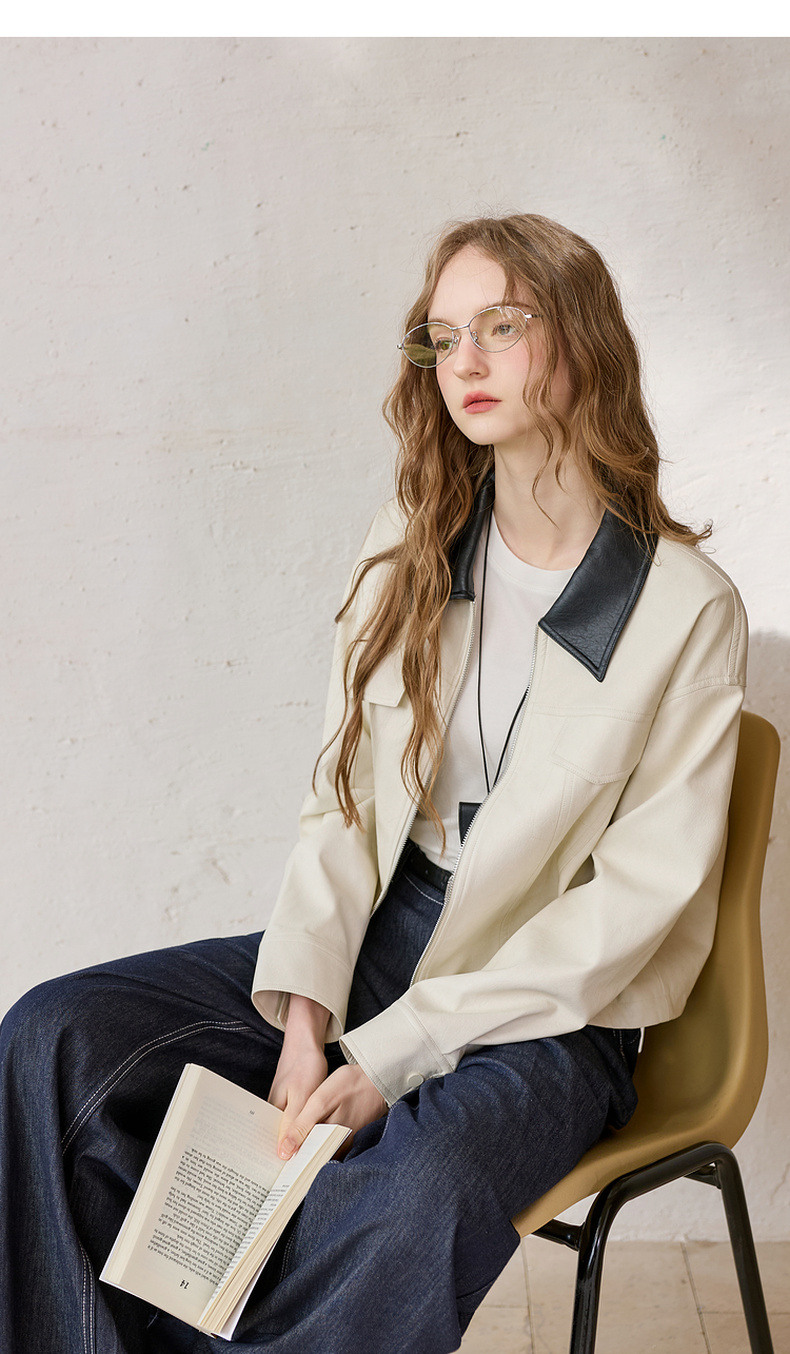 三彩2026春季新款宽松短款PU皮外套撞色翻领夹克上衣拉链开衫M