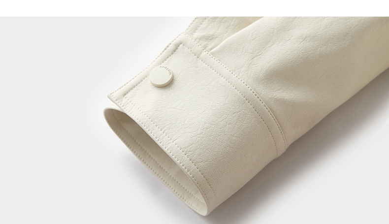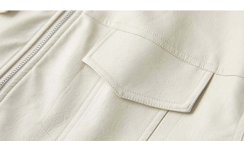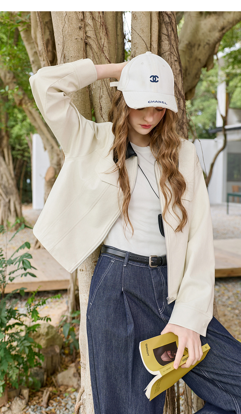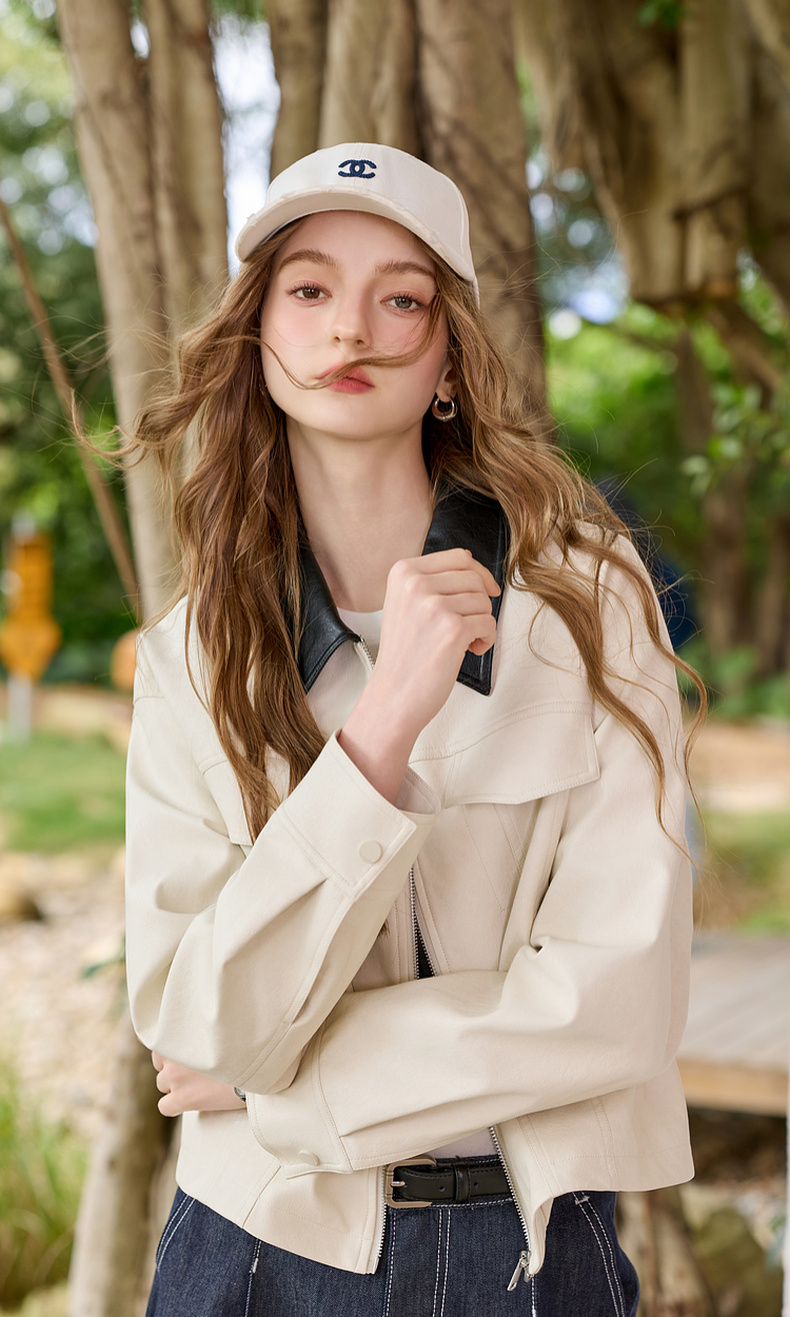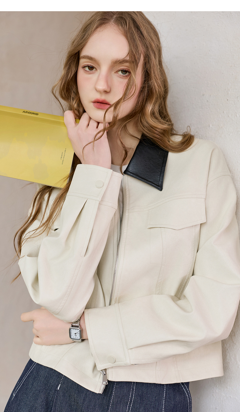 三彩2026春季新款宽松短款PU皮外套撞色翻领夹克上衣拉链开衫M