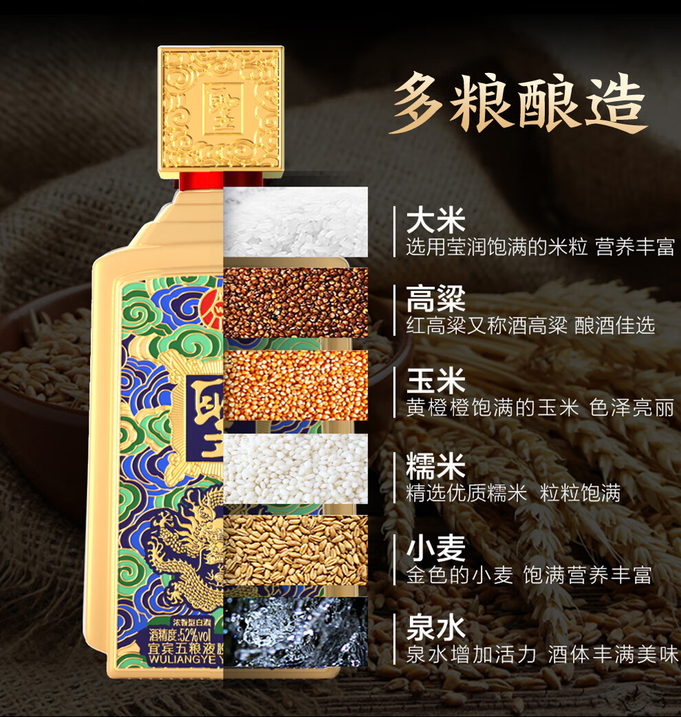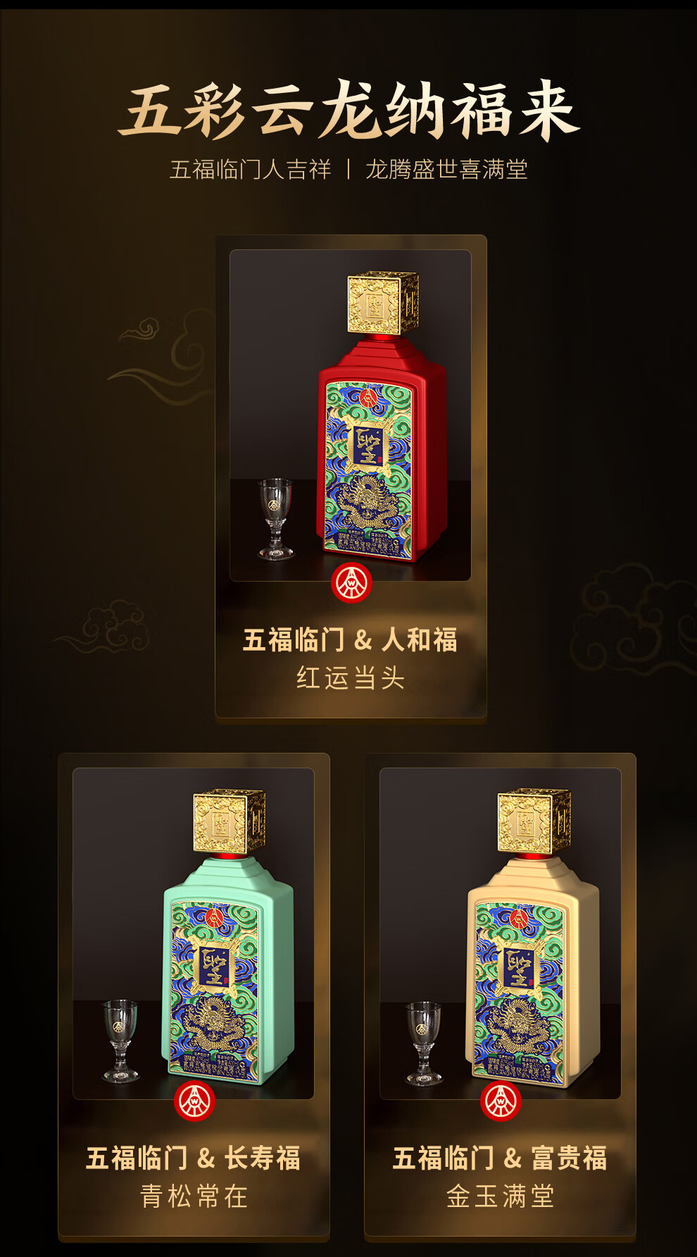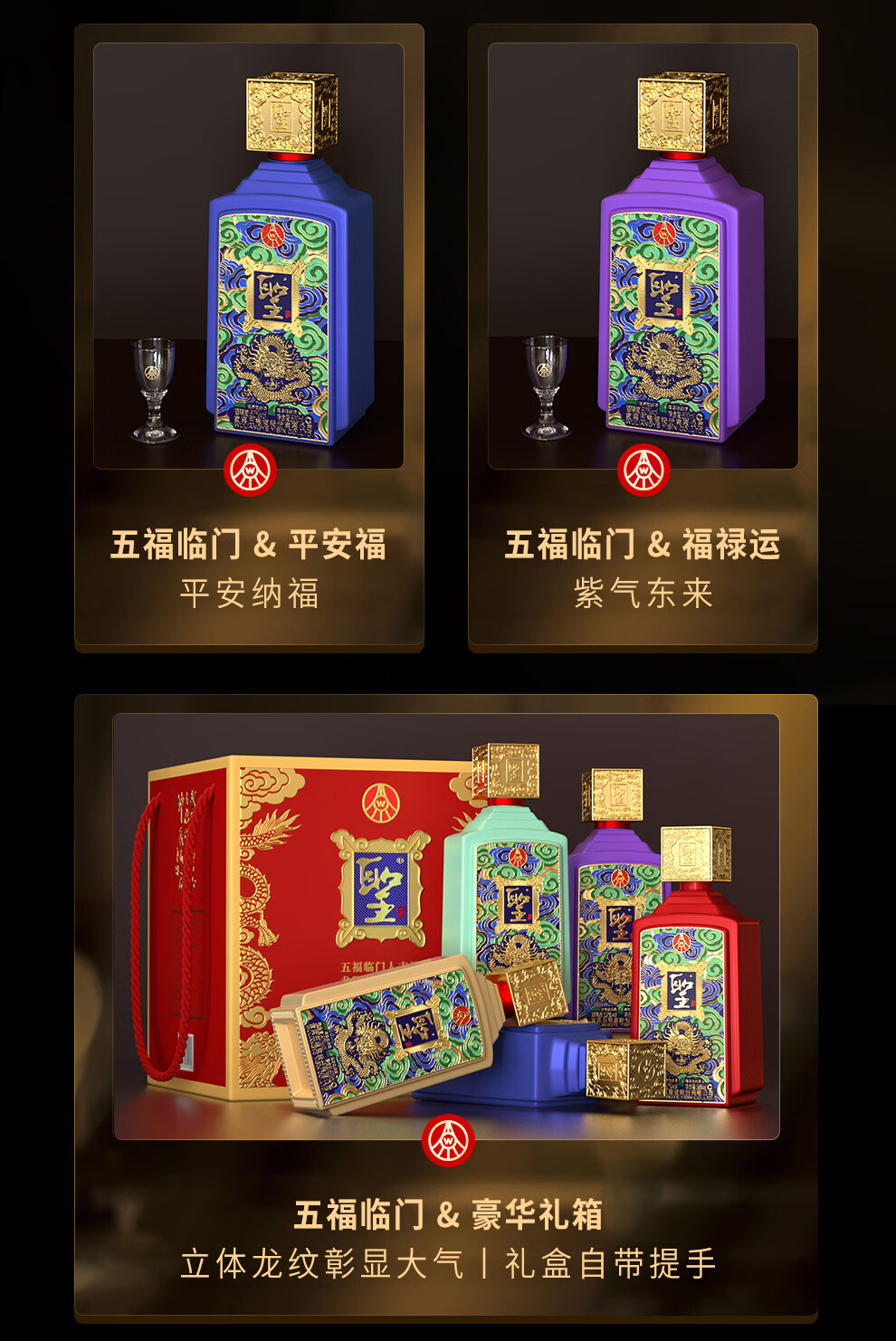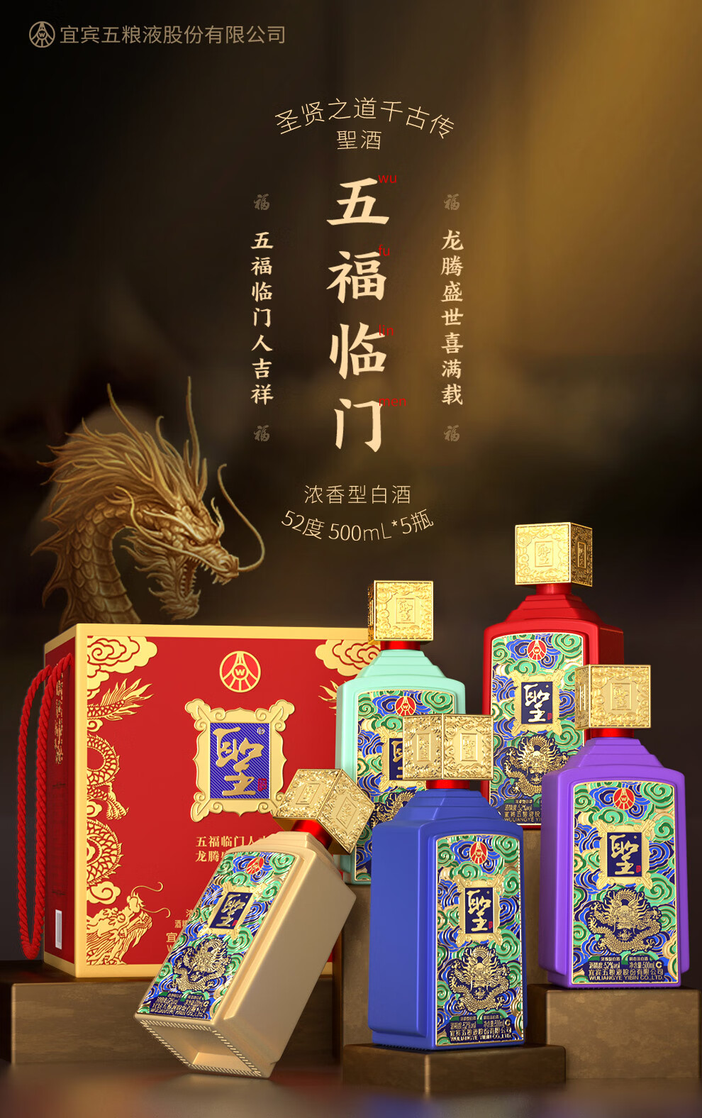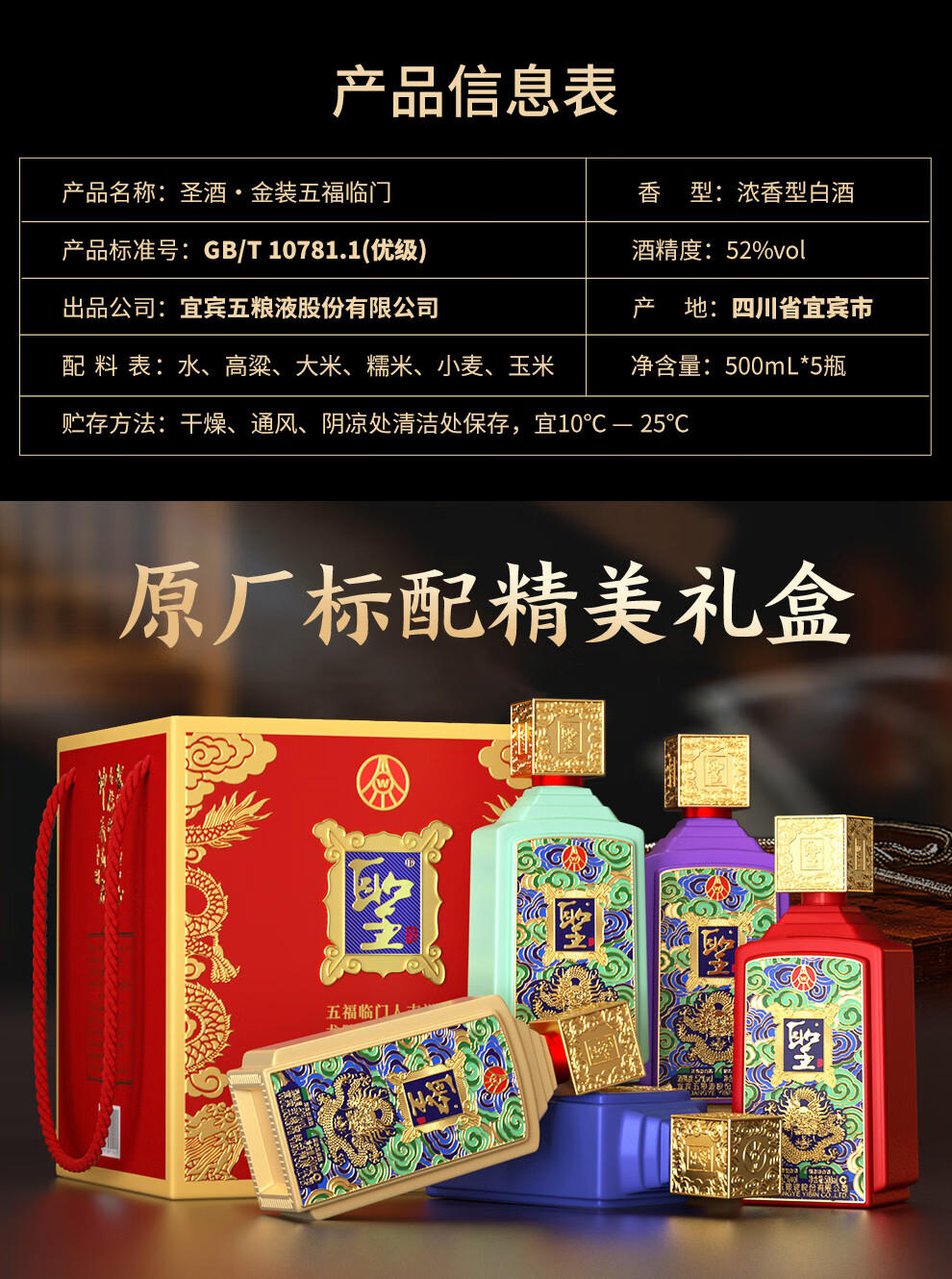 五粮液股份圣酒五福临门52度浓香型白酒500ml*5瓶,固态法纯粮酿造的优级白酒,5瓶礼盒装寓意五福临门