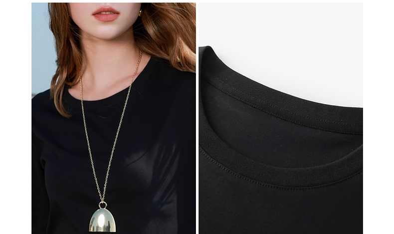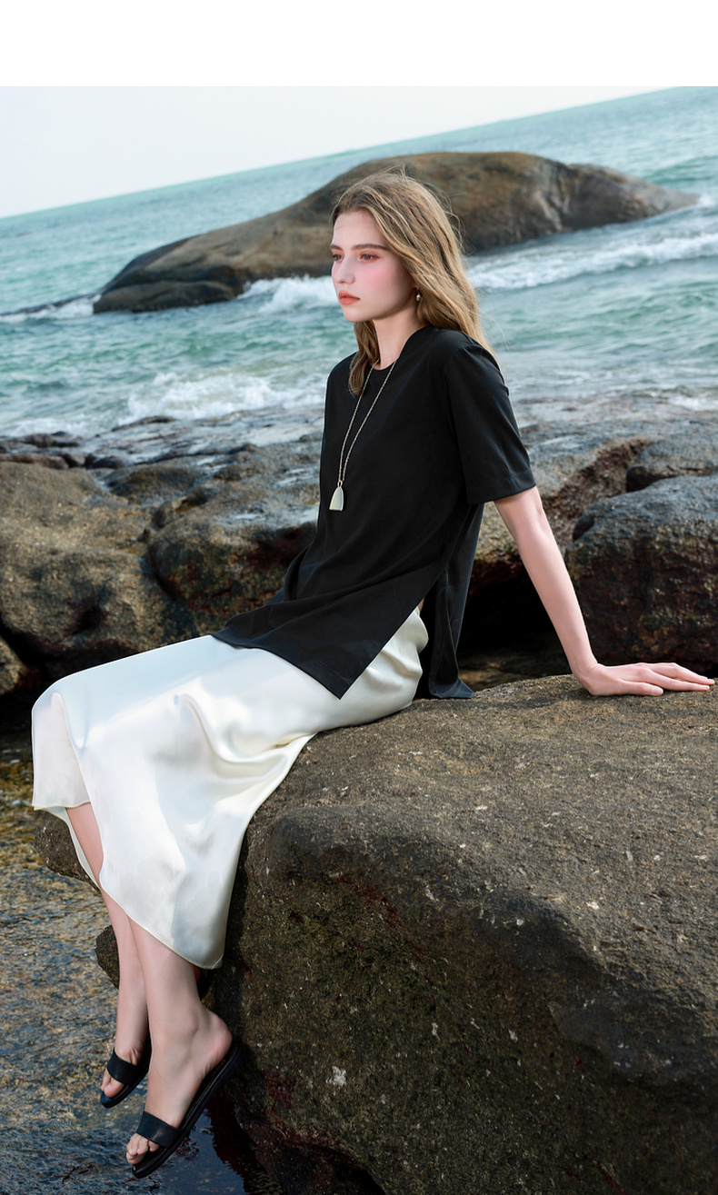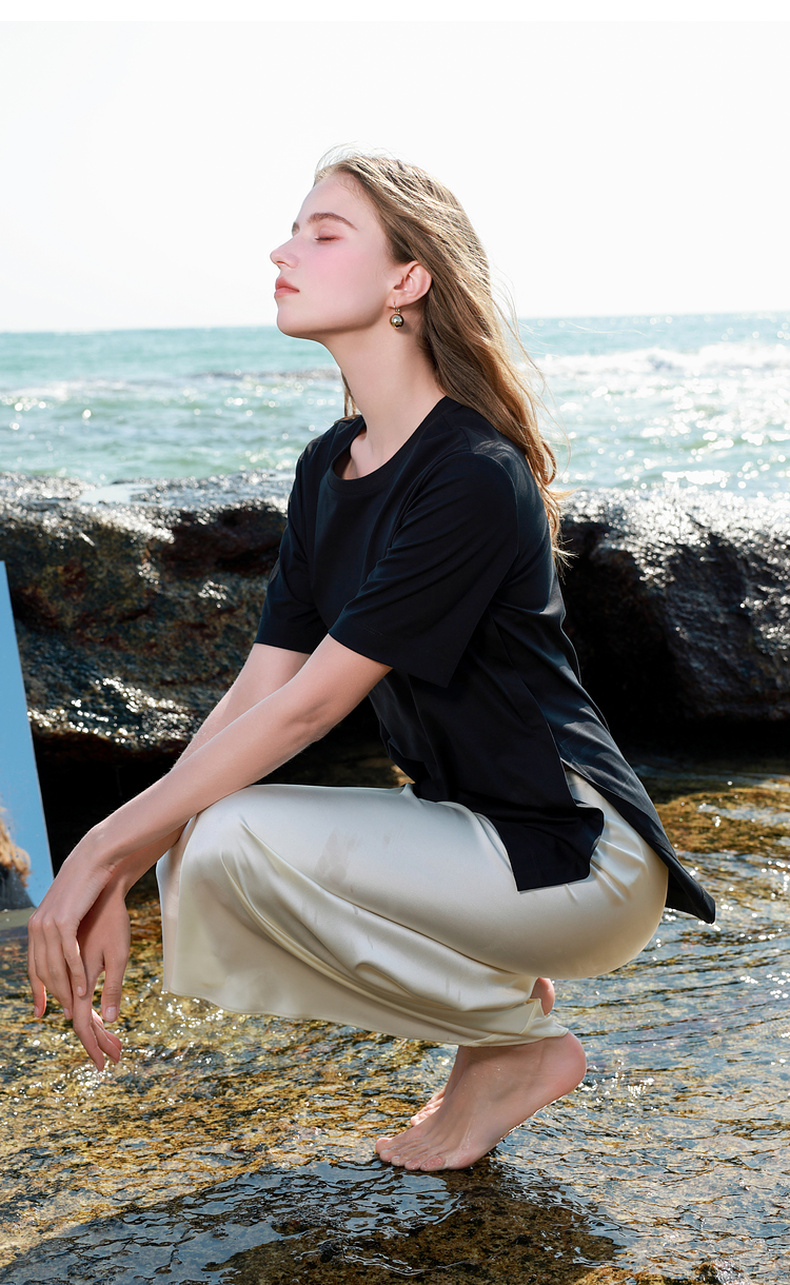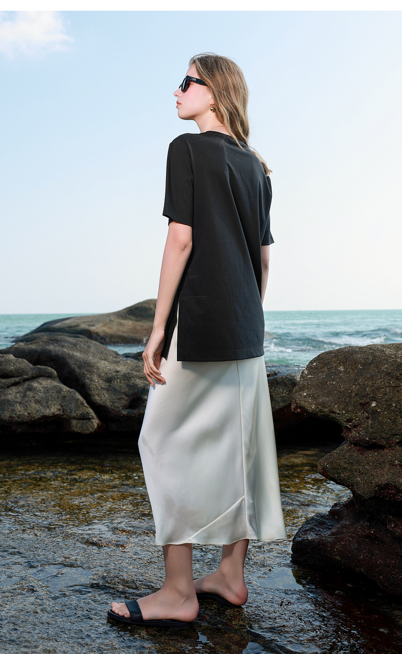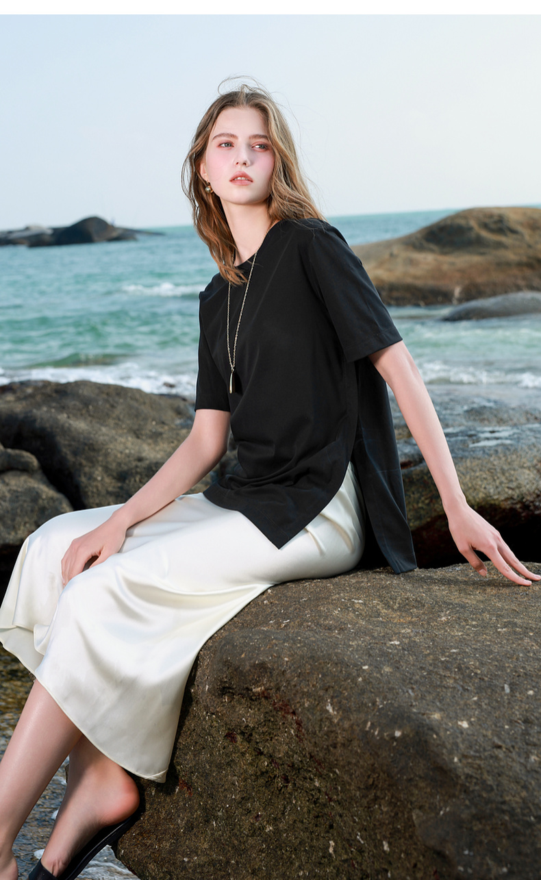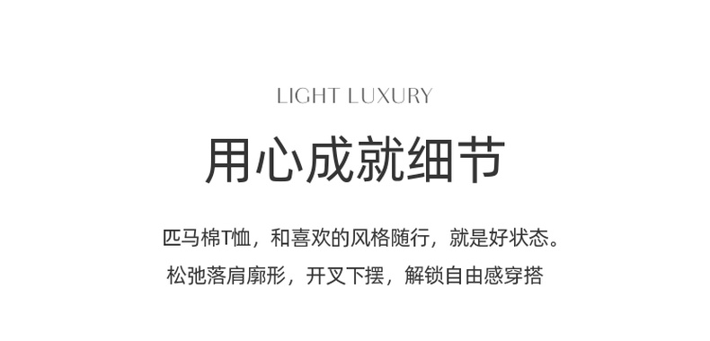 三彩2025春季新款110支匹马棉T恤宽松圆领开叉落肩袖套头衫上衣S