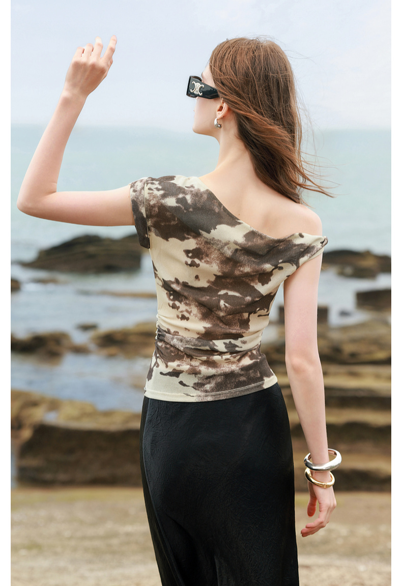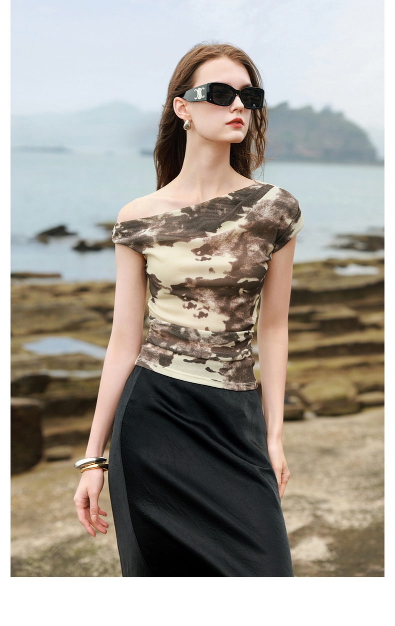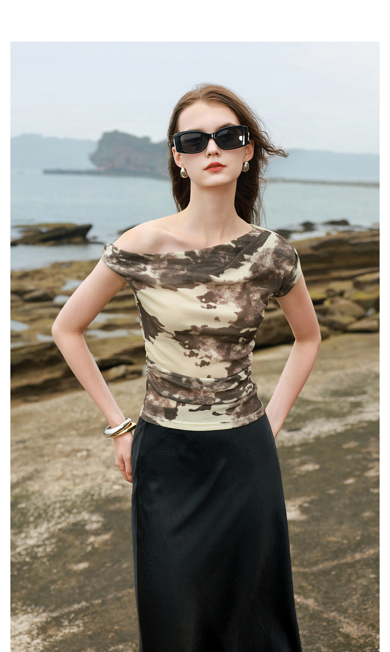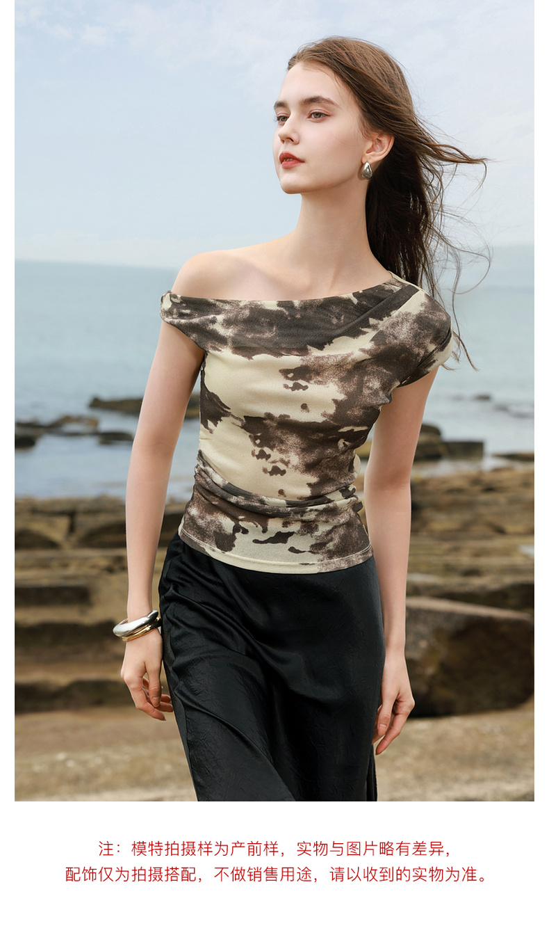 三彩2025夏季新款废土风T恤斜领露肩上衣修身套头衫设计感M