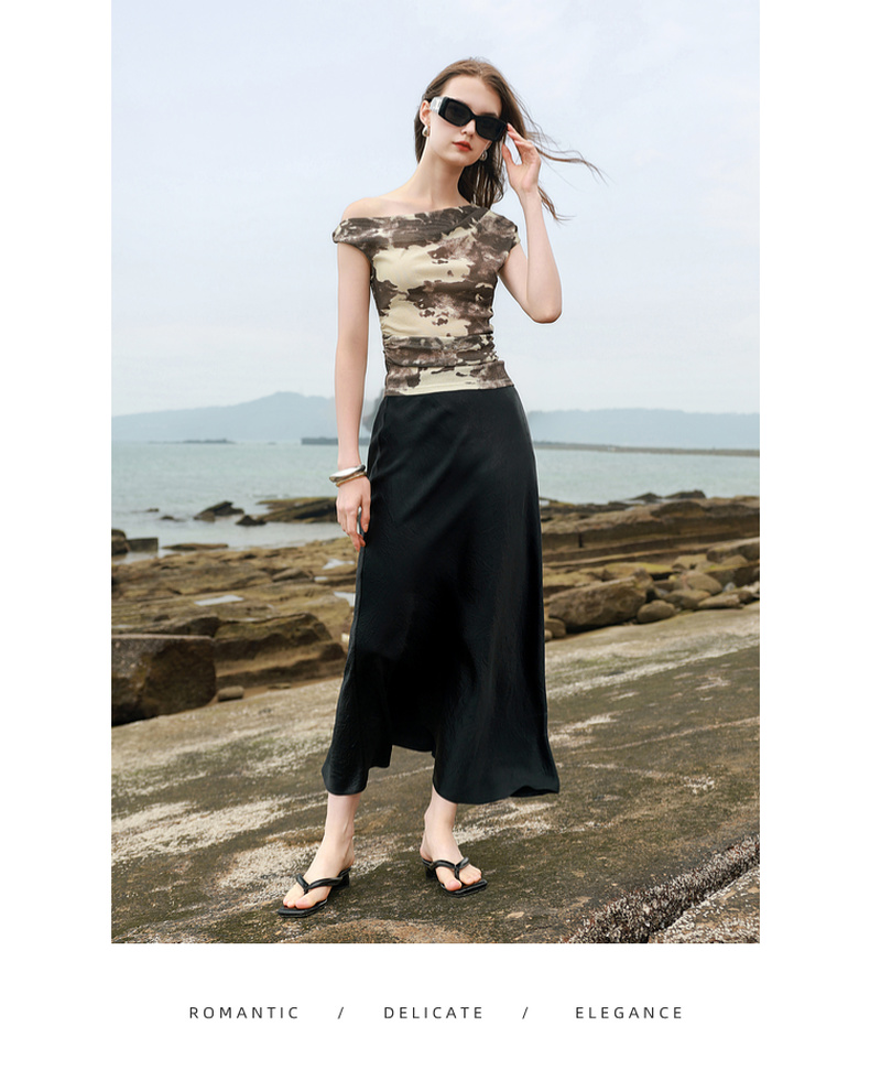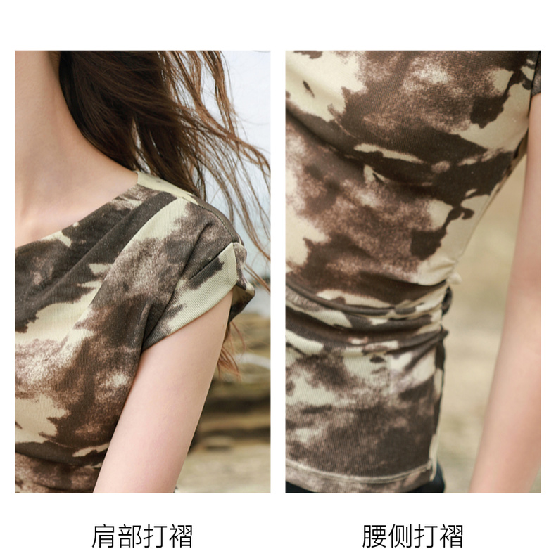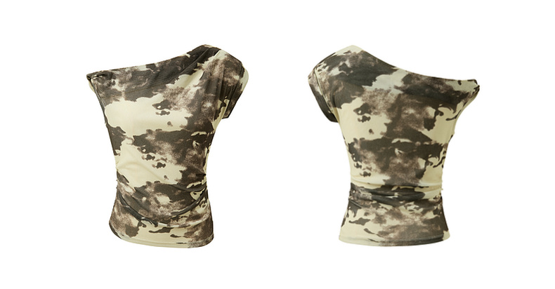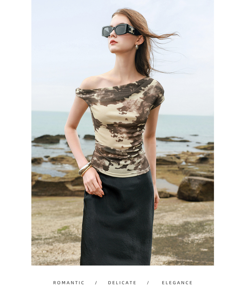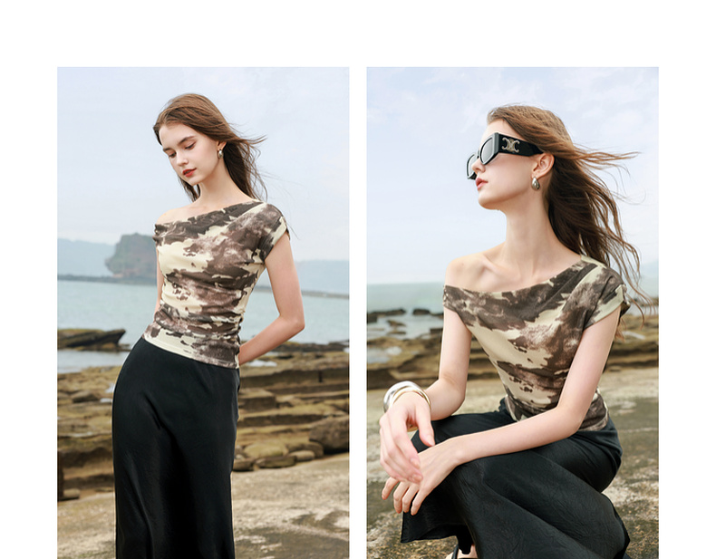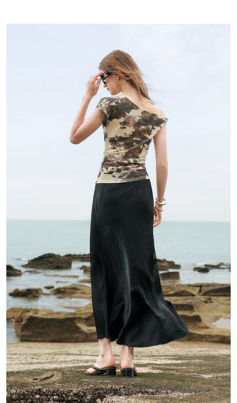 三彩2025夏季新款废土风T恤斜领露肩上衣修身套头衫设计感M