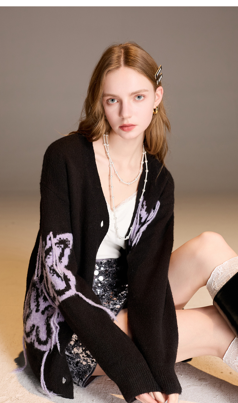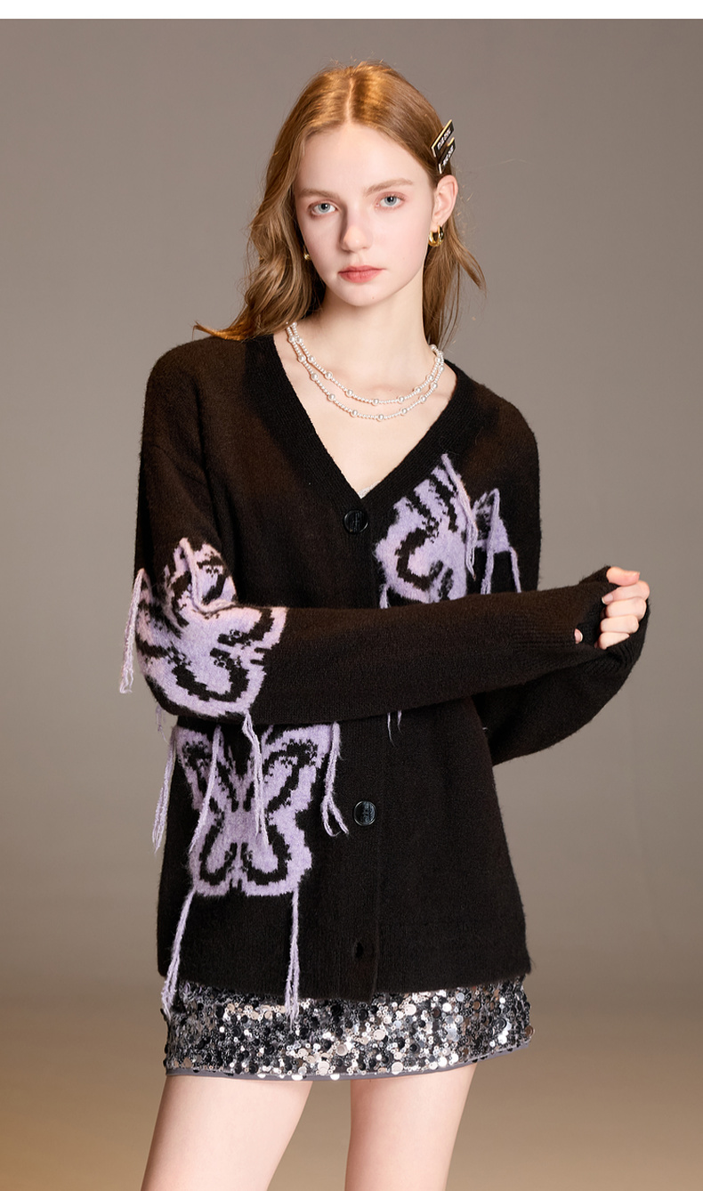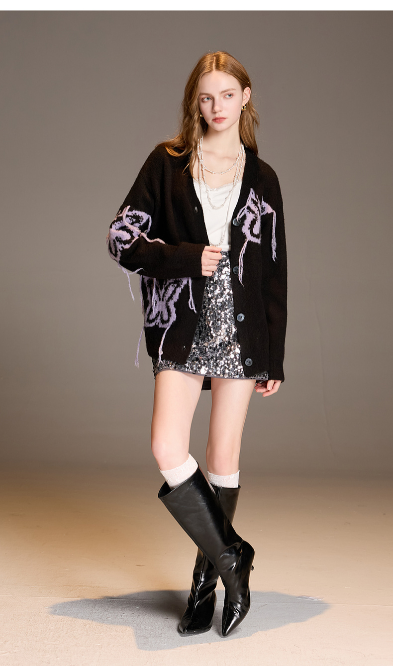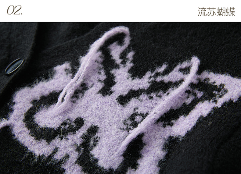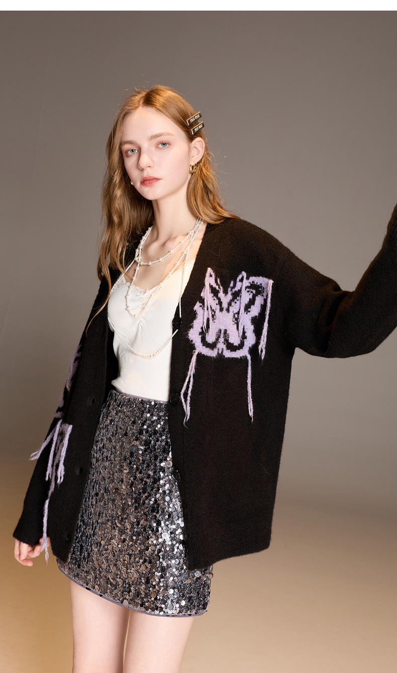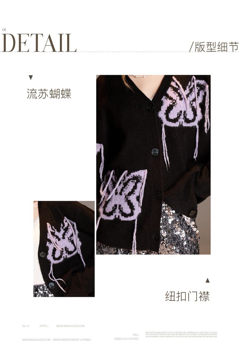 三彩2025冬季新款宽松慵懒蝴蝶针织衫长袖单排扣开衫复古外套M