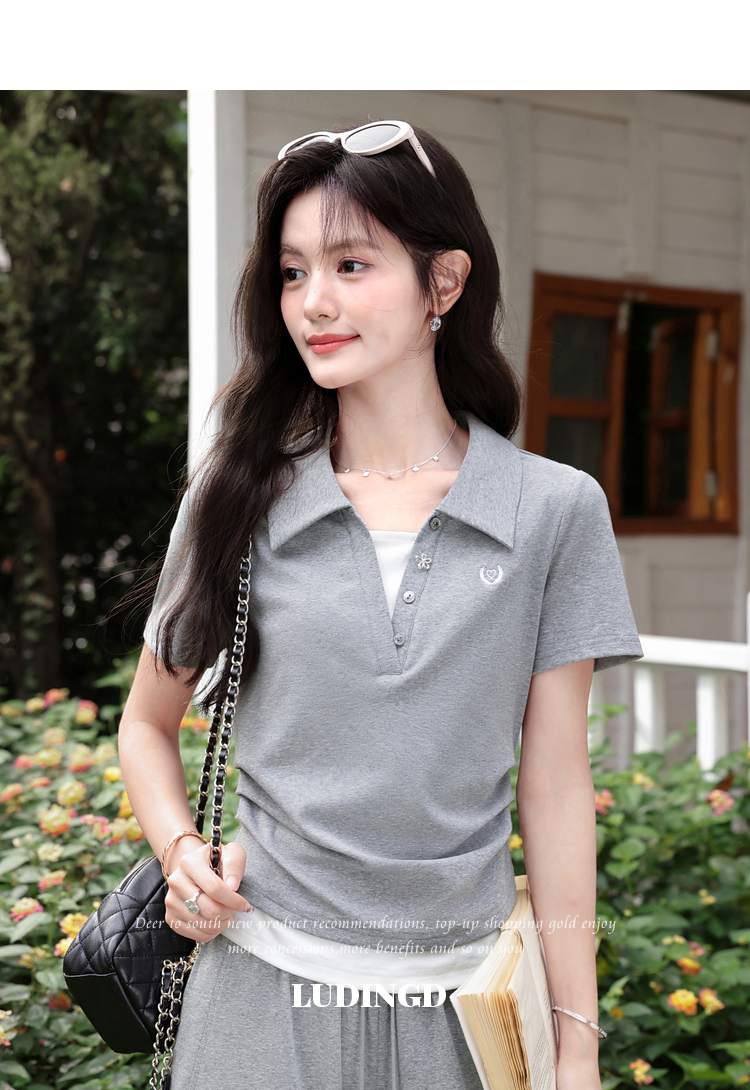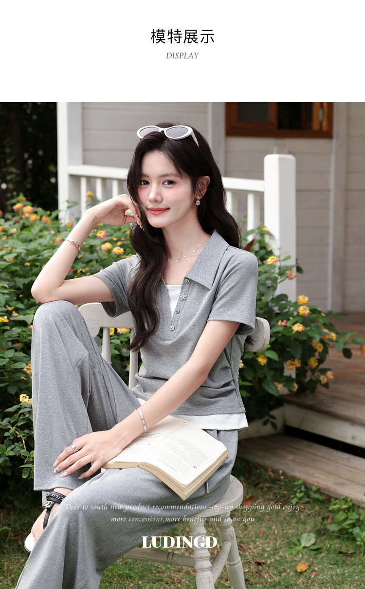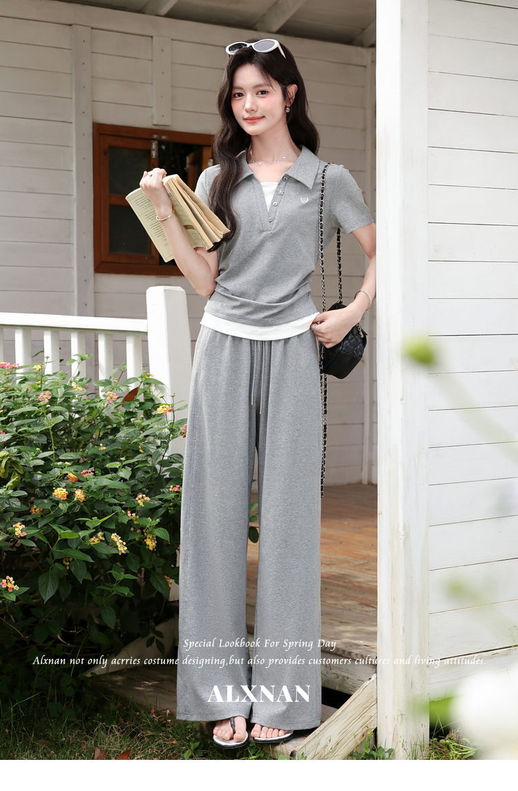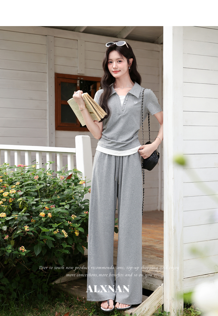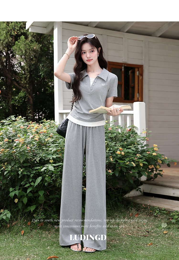 鹿向南「灰屿闲光」假两件短袖上衣时尚灰色套装夏季休闲裤俩件套