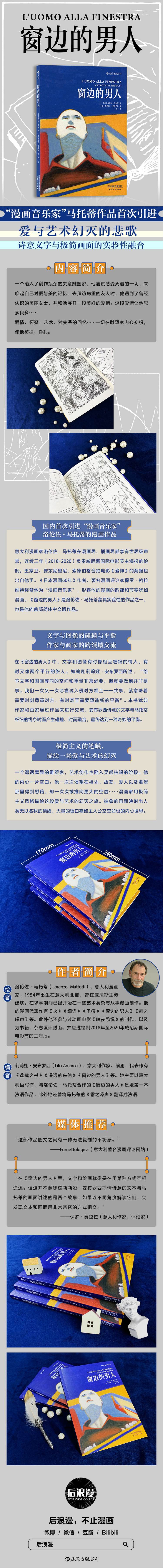 意大利漫画家洛伦佐·马托蒂在漫画界、插画界都享有shi界级声誉,连续三年(2018-2020)负责威尼斯国际电影节主海报的绘制。王家卫、安东尼奥尼、索德伯格合拍电影《爱神》的海报也出自他手。《日本漫画60年》作者、著名漫画评论家保罗·格拉维特称赞他为“漫画音乐家”,形容他的漫画的韵律和节奏犹如漫画。《窗边的男人》是洛伦佐·马托蒂蕞具实验性的作品之一,也是他的首部简体中文版作品。