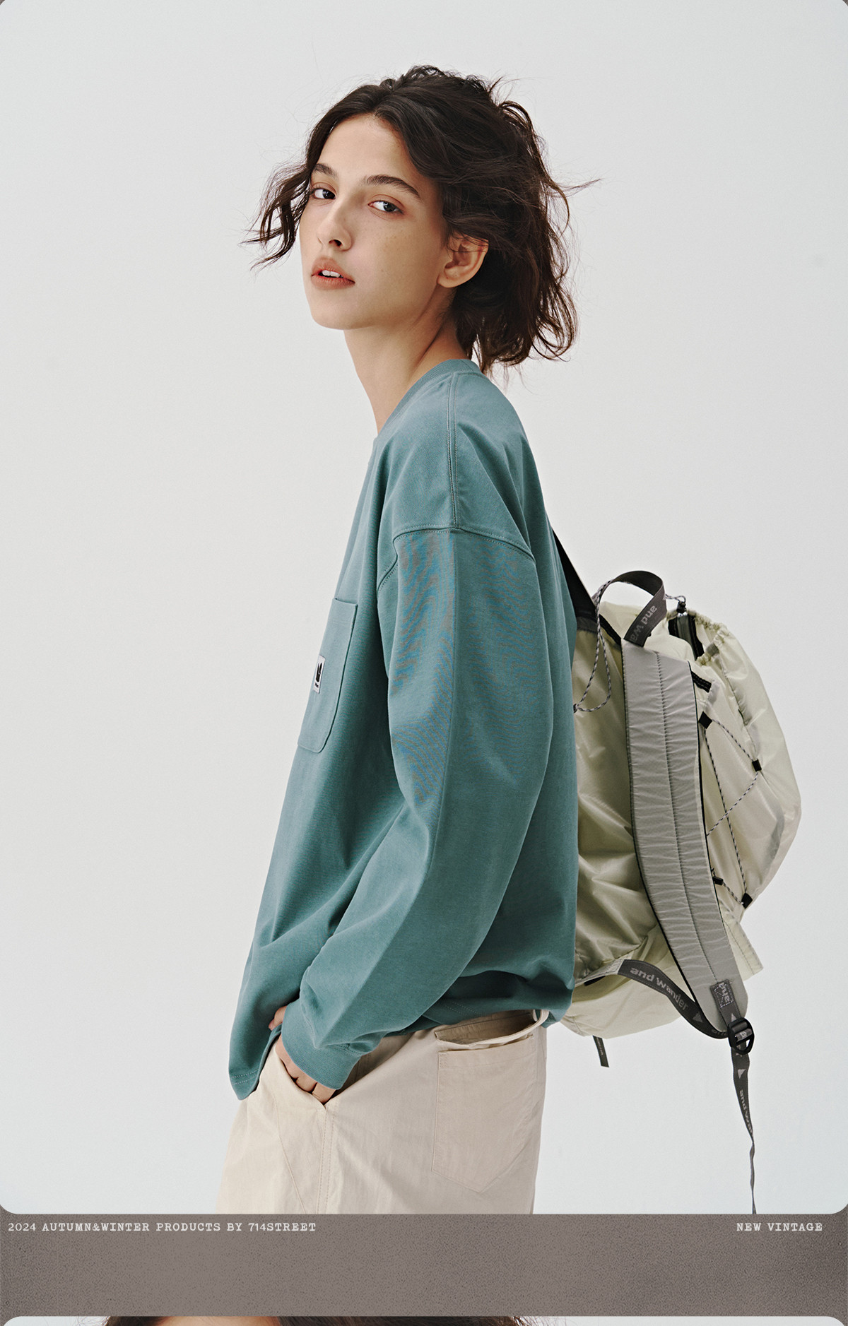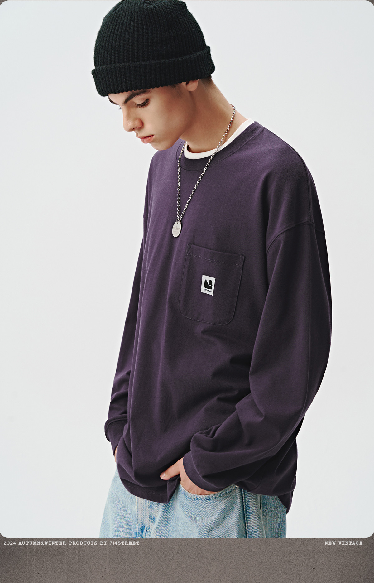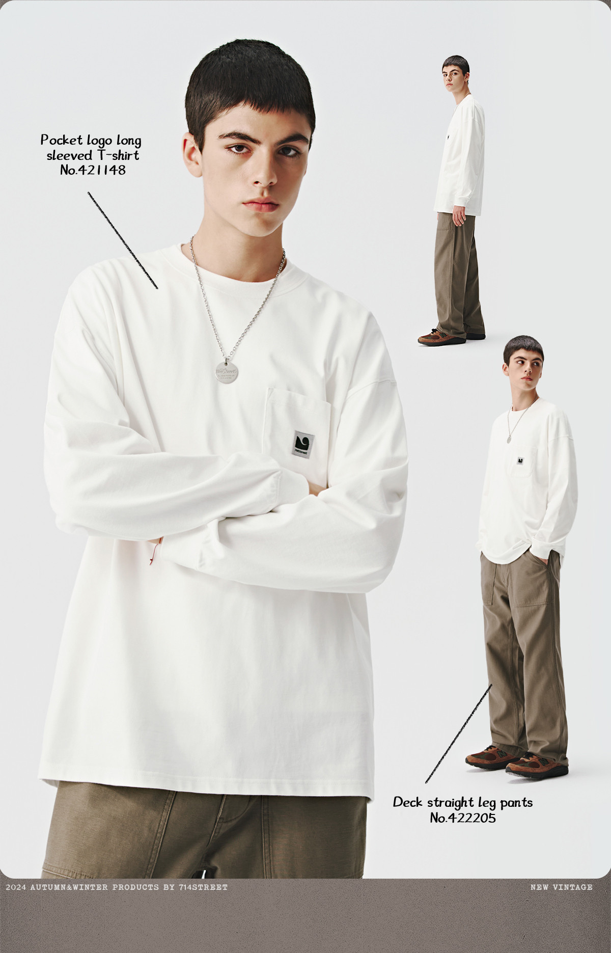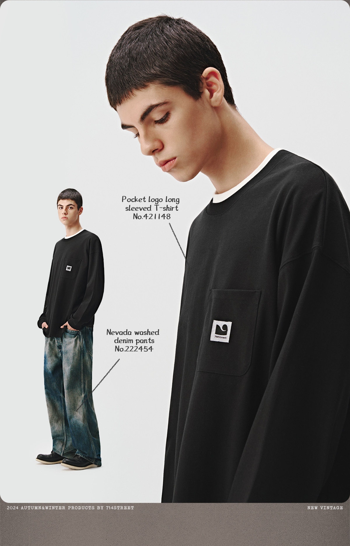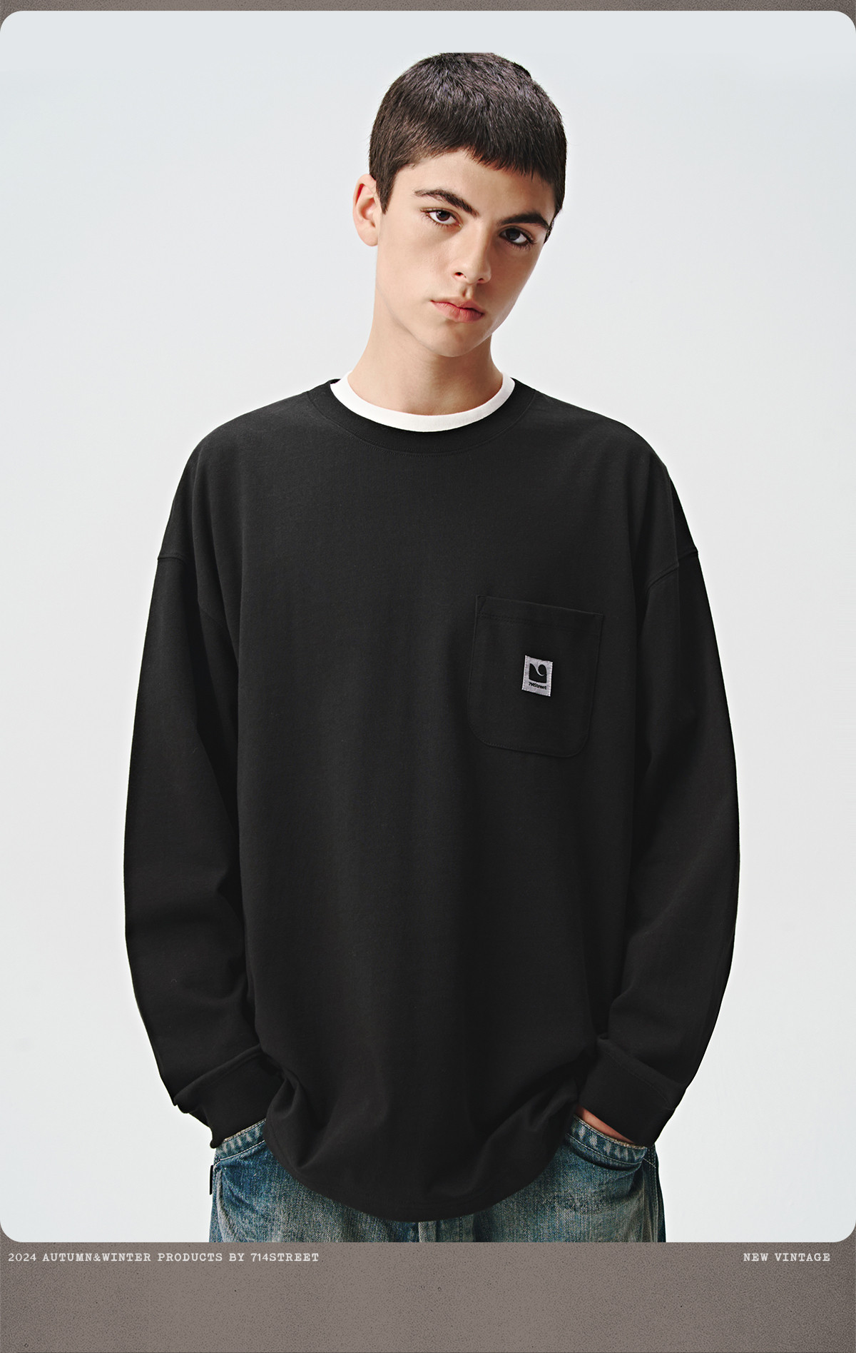 714street重磅300g口袋长袖T恤男2024秋季新款情侣装宽松休闲上衣