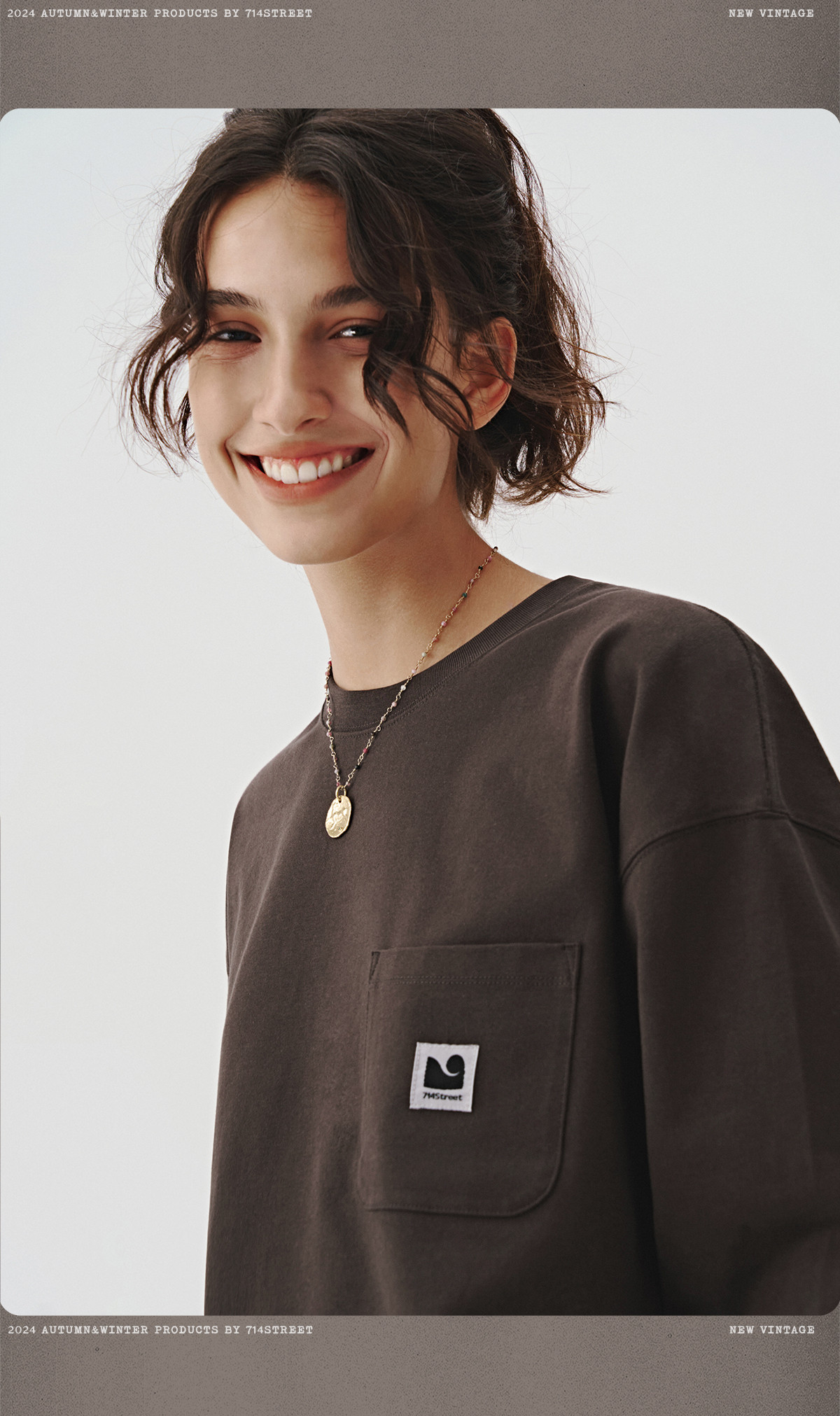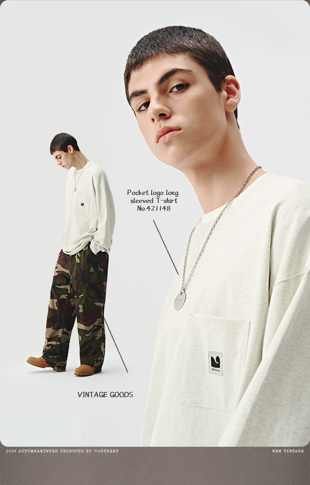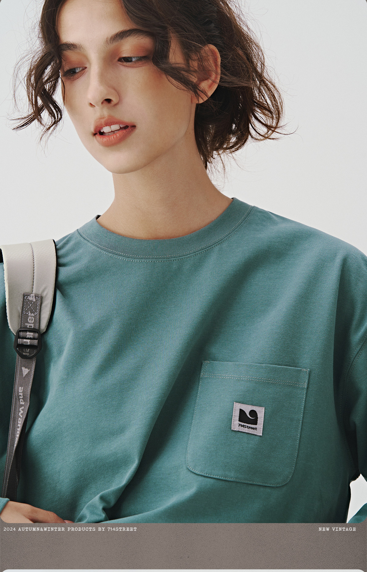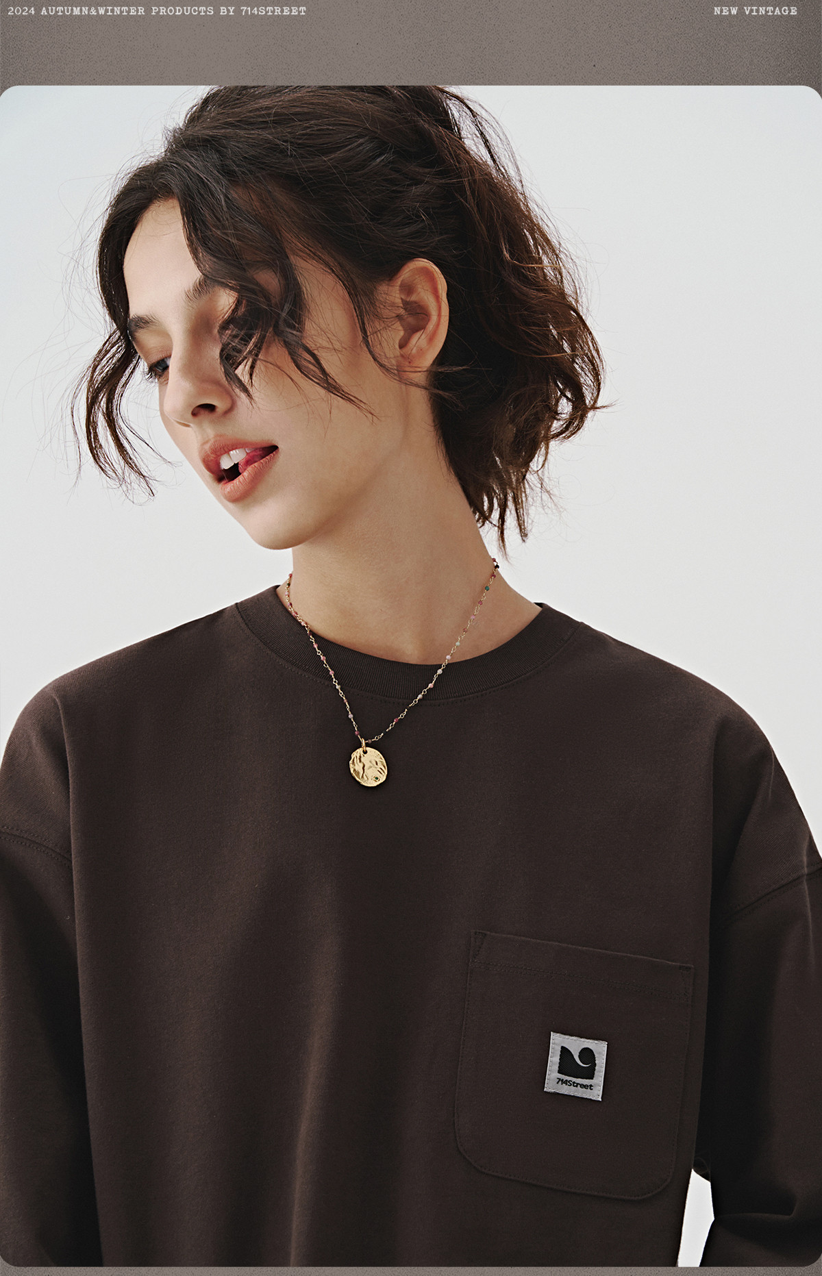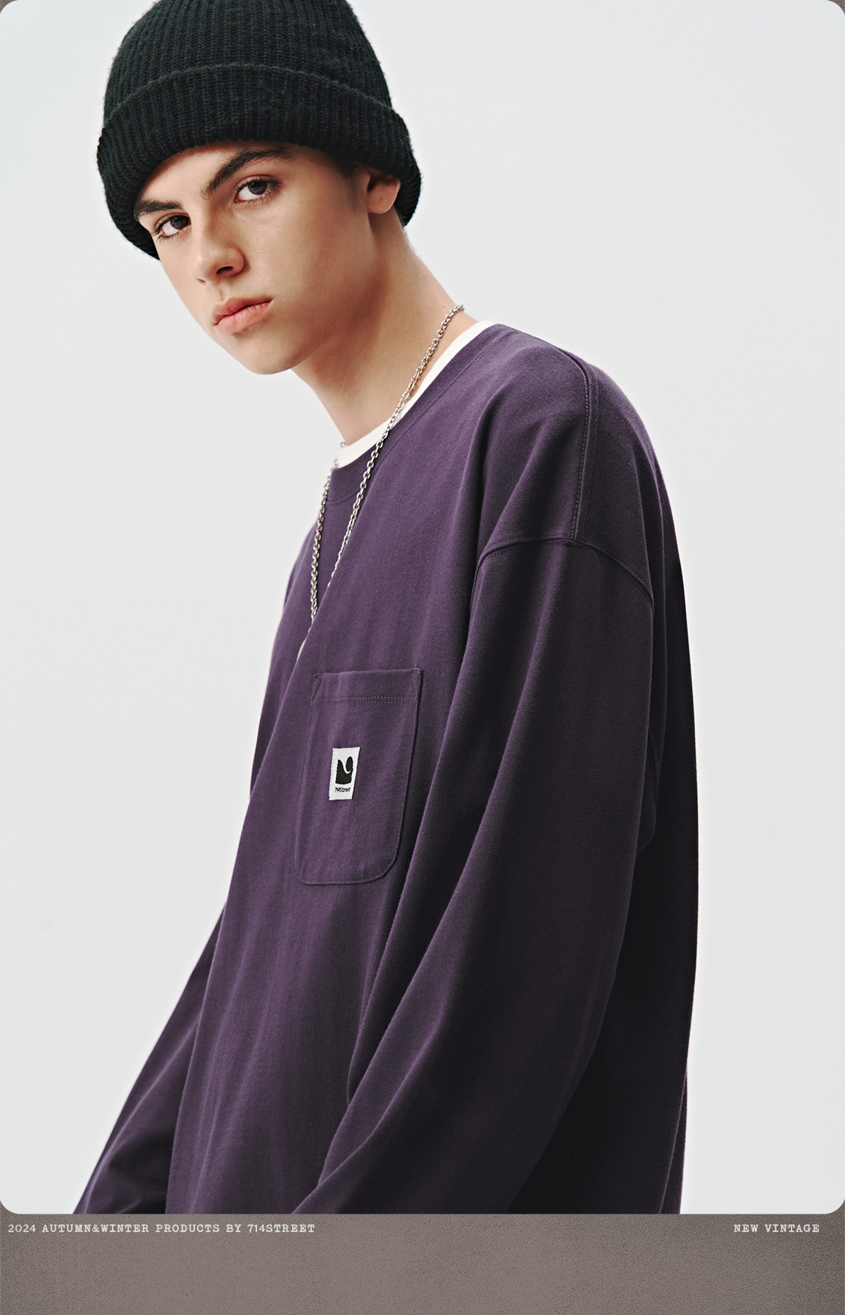 714street重磅300g口袋长袖T恤男2024秋季新款情侣装宽松休闲上衣
