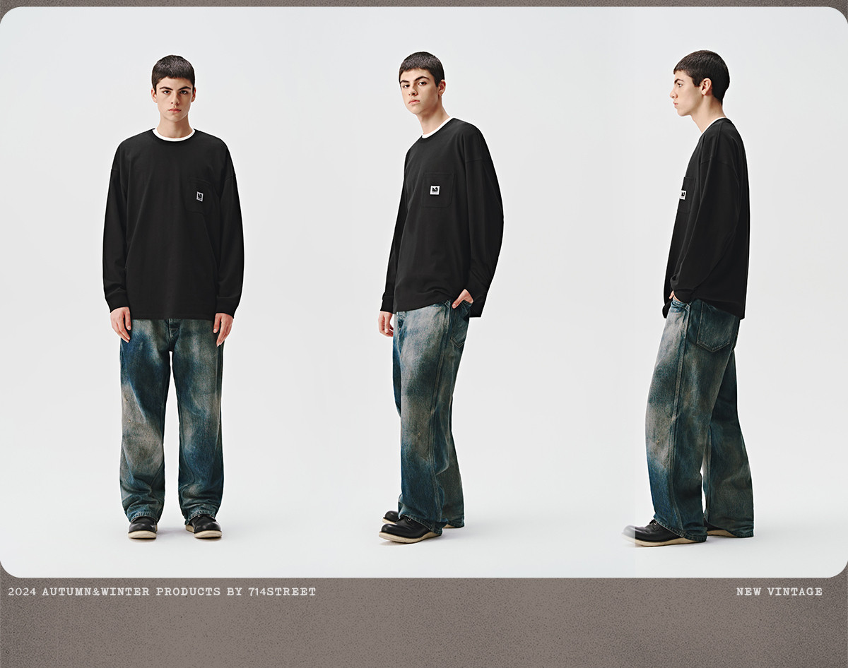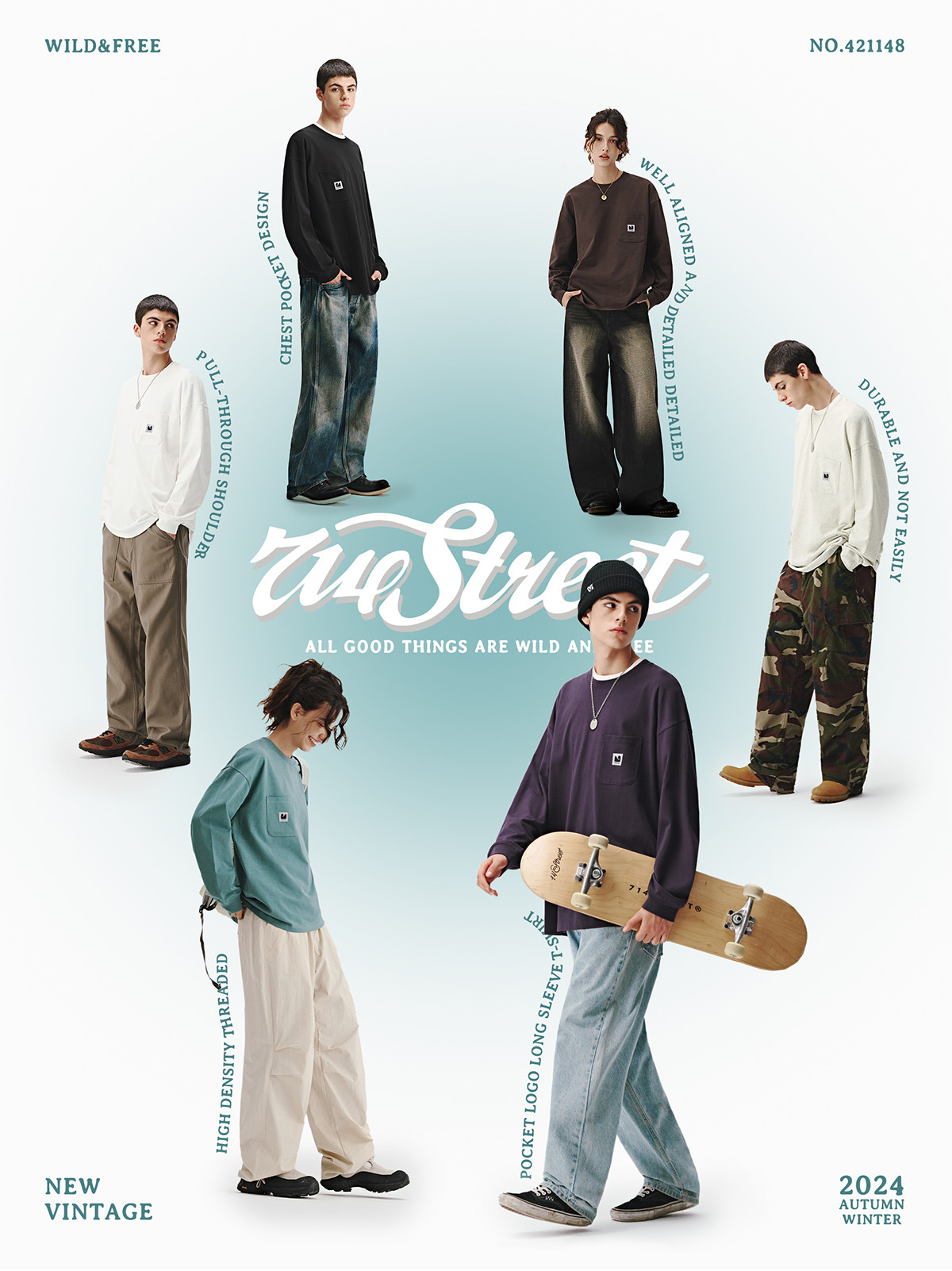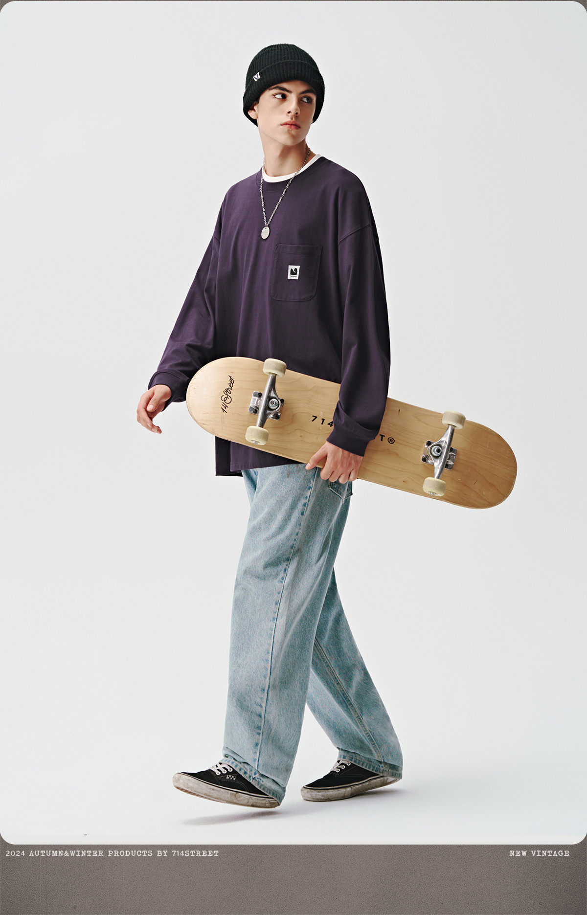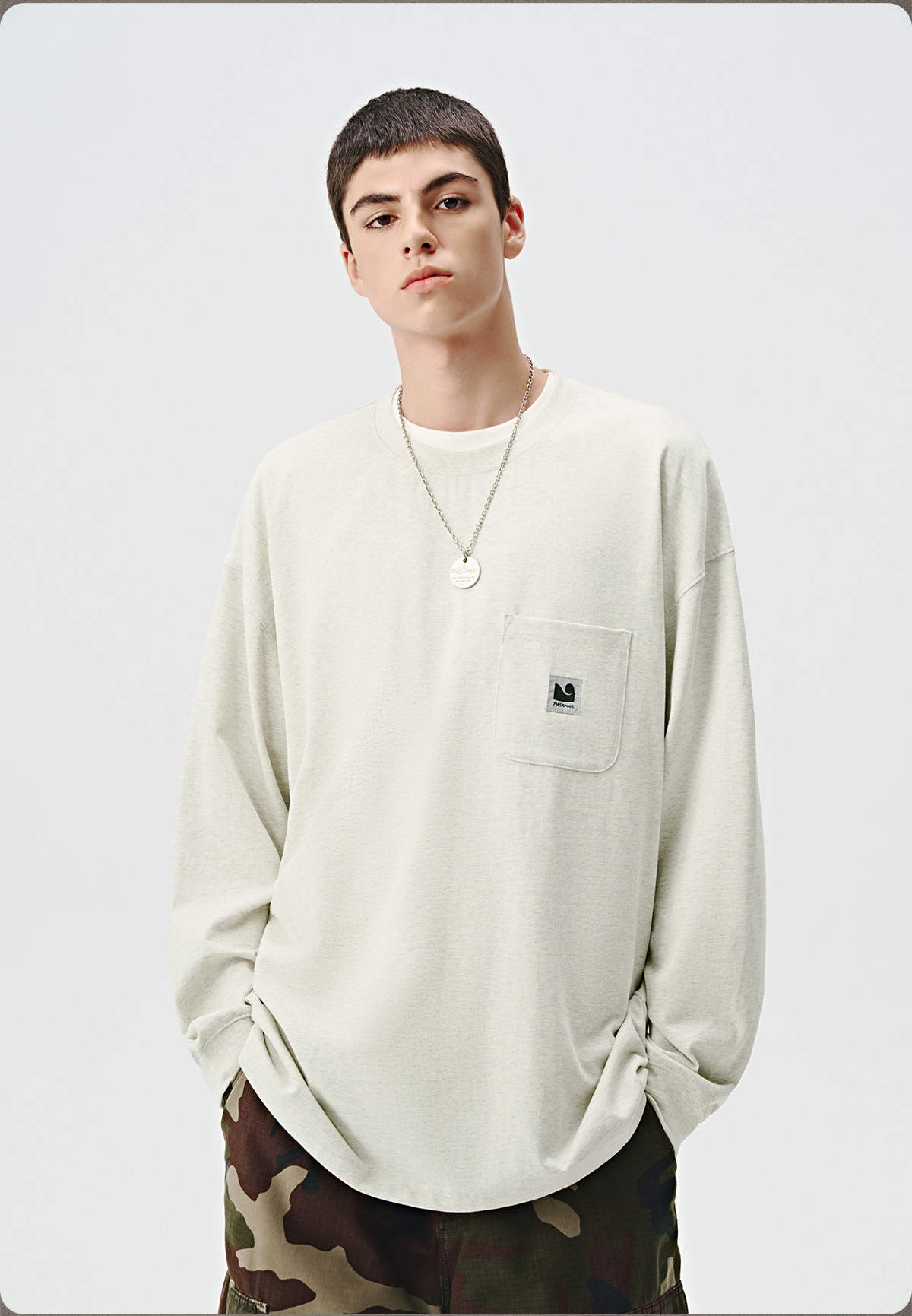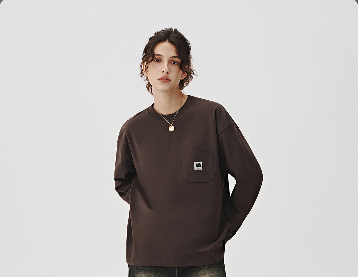 714street重磅300g口袋长袖T恤男2024秋季新款情侣装宽松休闲上衣