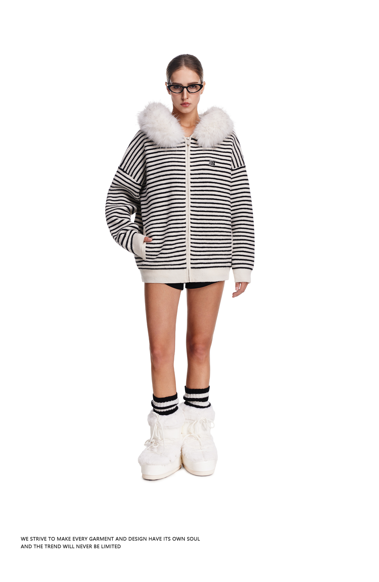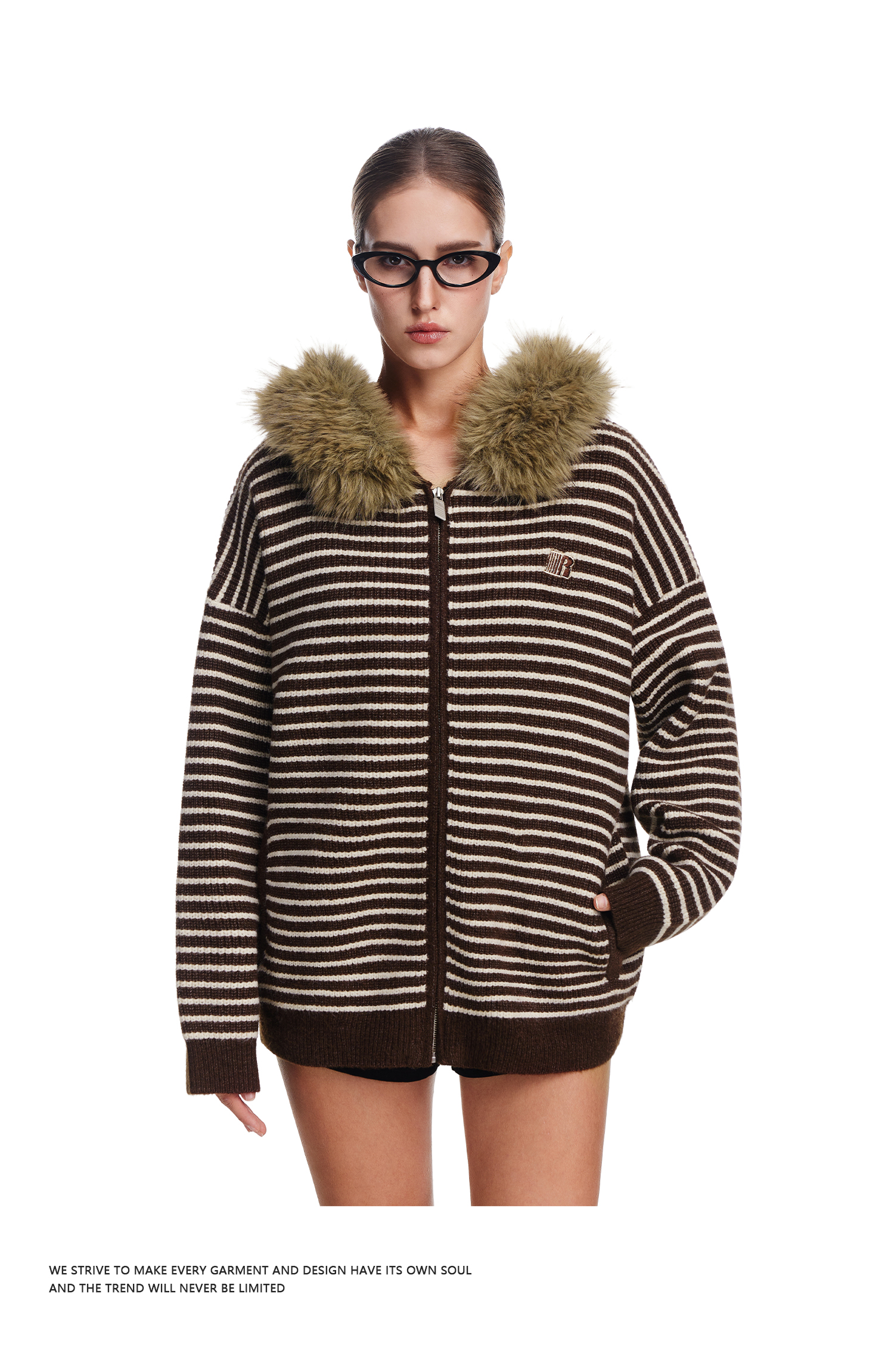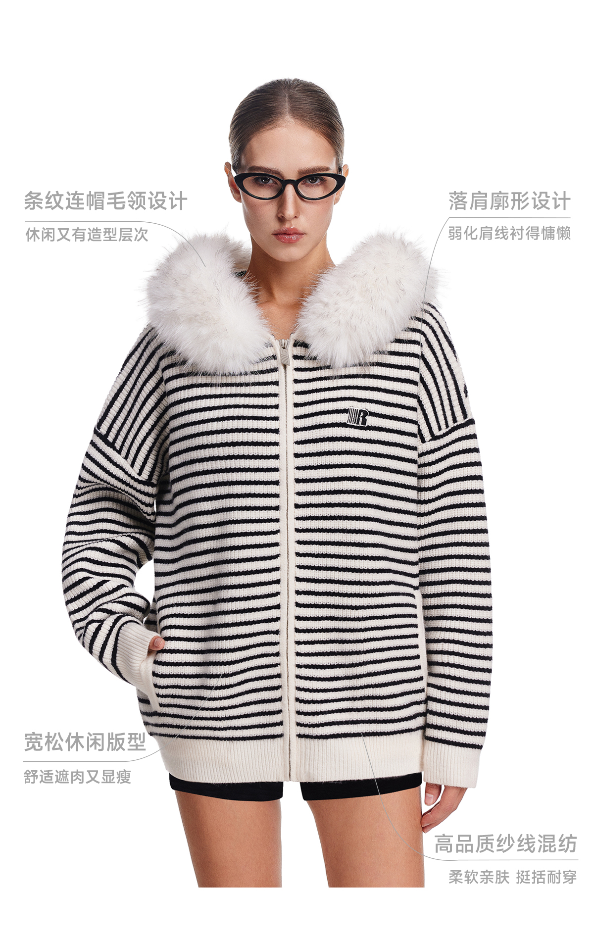 FDR官方店 条纹毛衣可拆卸毛领针织开衫秋季加厚情侣毛衣外套男女