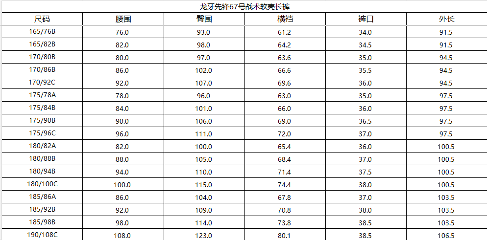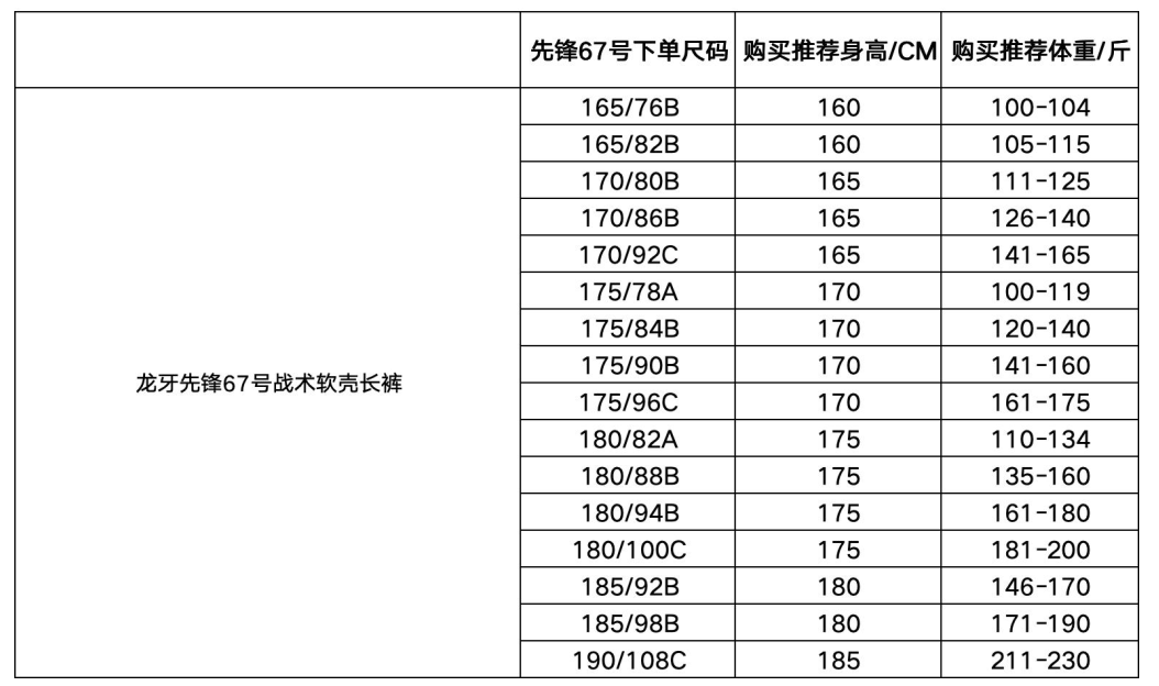 温馨提示:1、龙牙先锋67号属于修身版型,对比常规龙牙尺寸会略微偏瘦短2、如内里加穿保暖裤,建议增加一码选购3、此尺码推荐表仅供参考