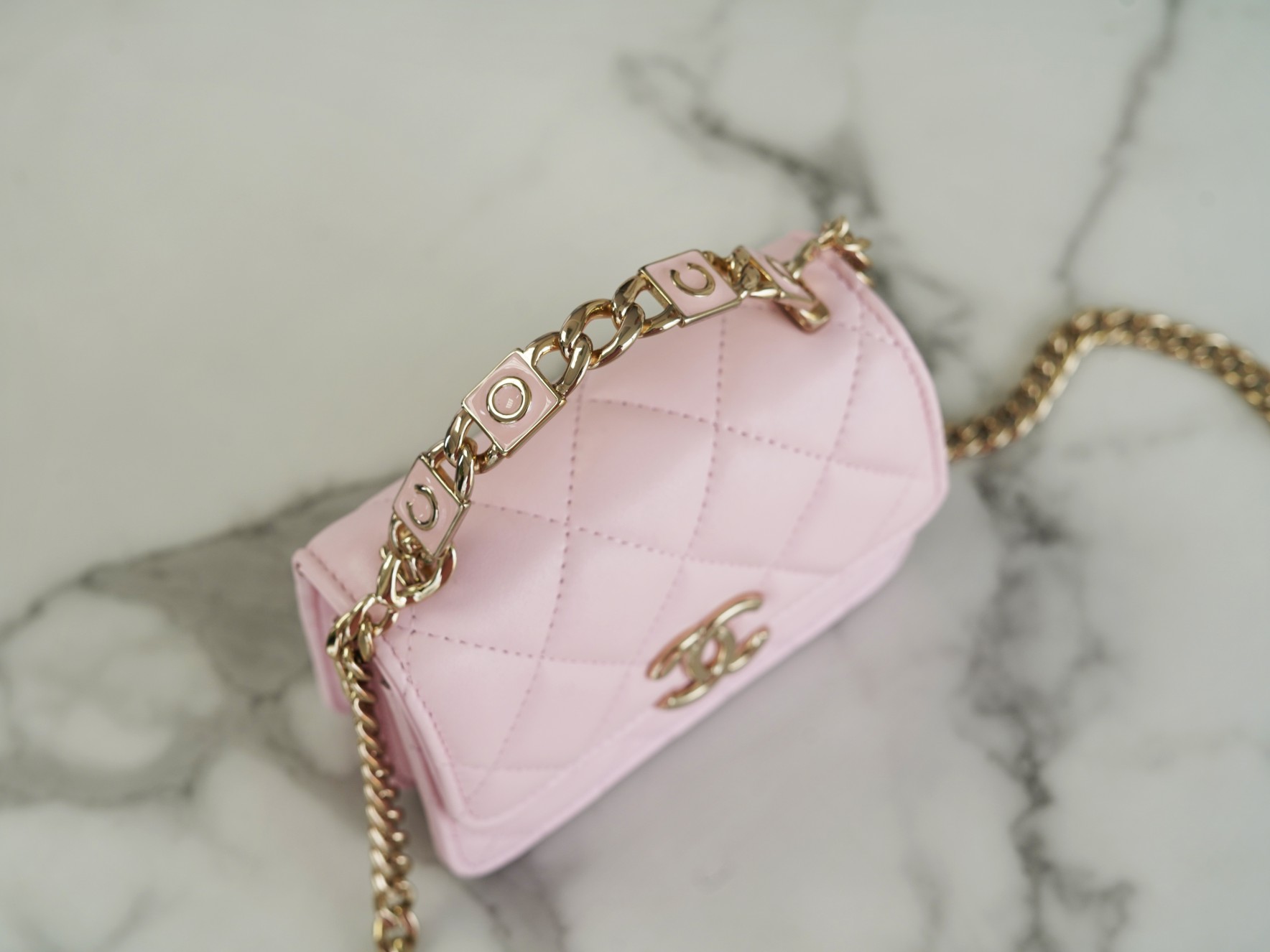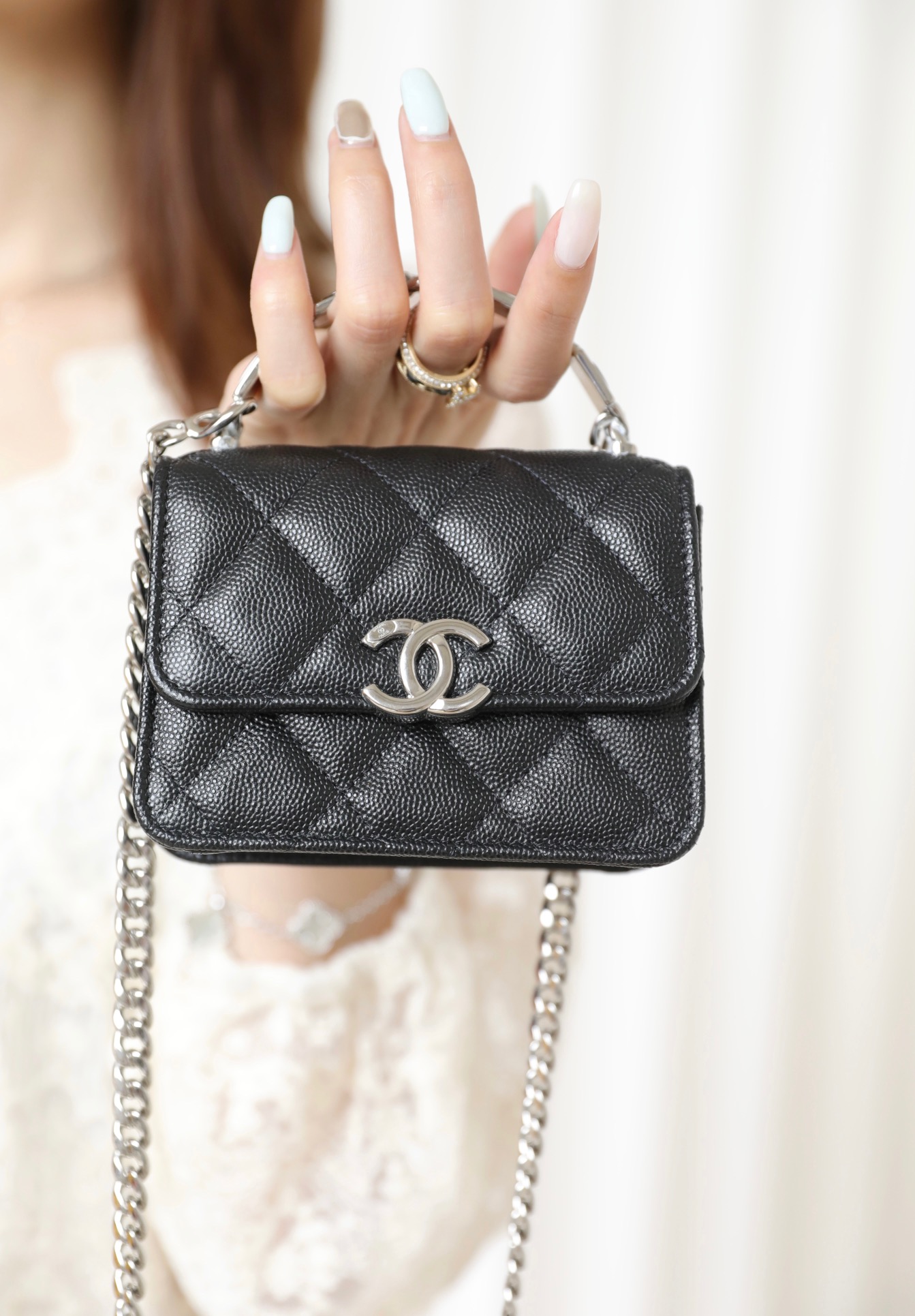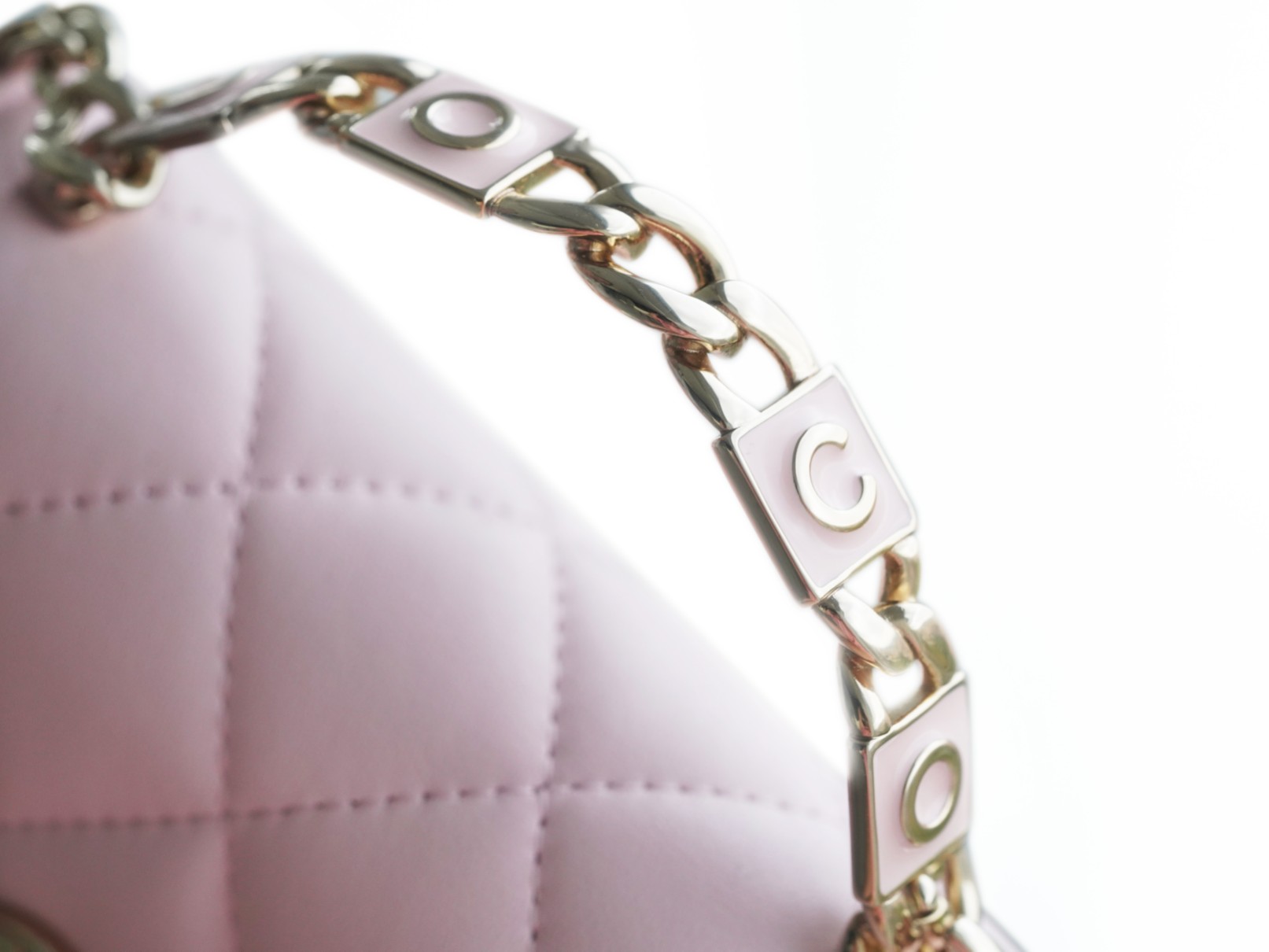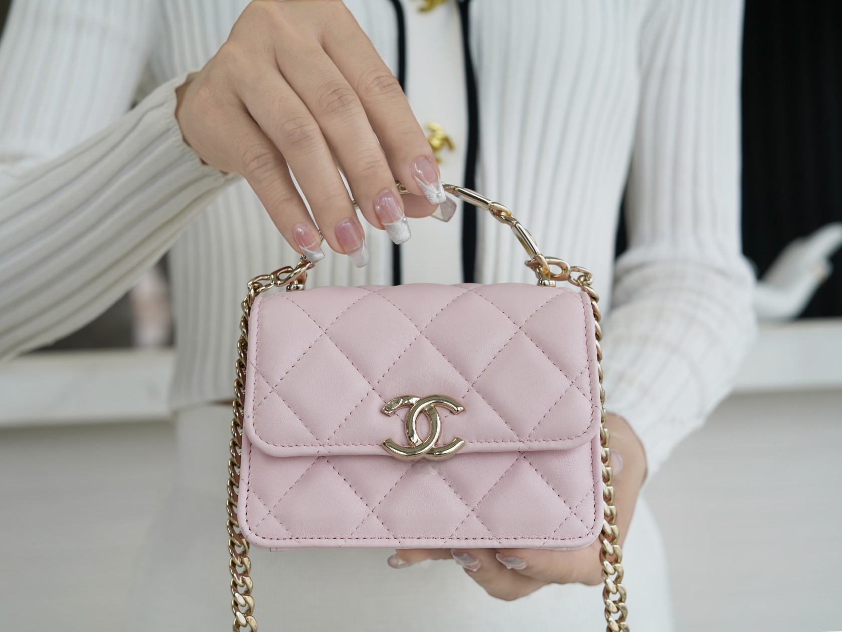 经典菱格纹+标志性双𝐂 𝐥𝐨𝐠𝐨设计,迷你包型搭配粗链条呈现出一种反差萌感,包里自带卡槽,链条⛓可拆卸,斜挎手拎都🉑,清新甜美的配色,完美俘获少女心,迷你包的快乐必须拥有!!