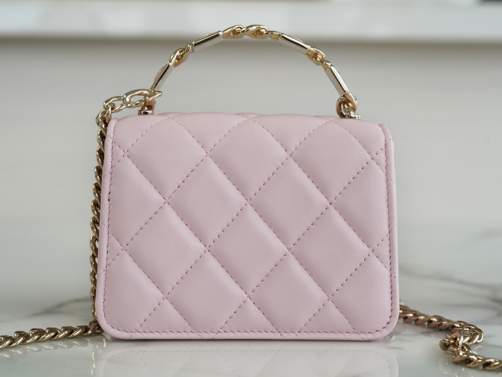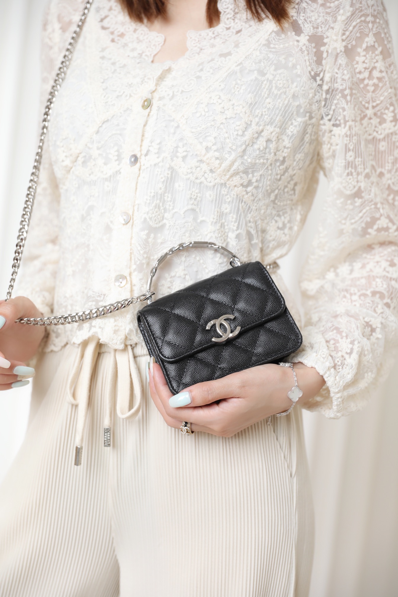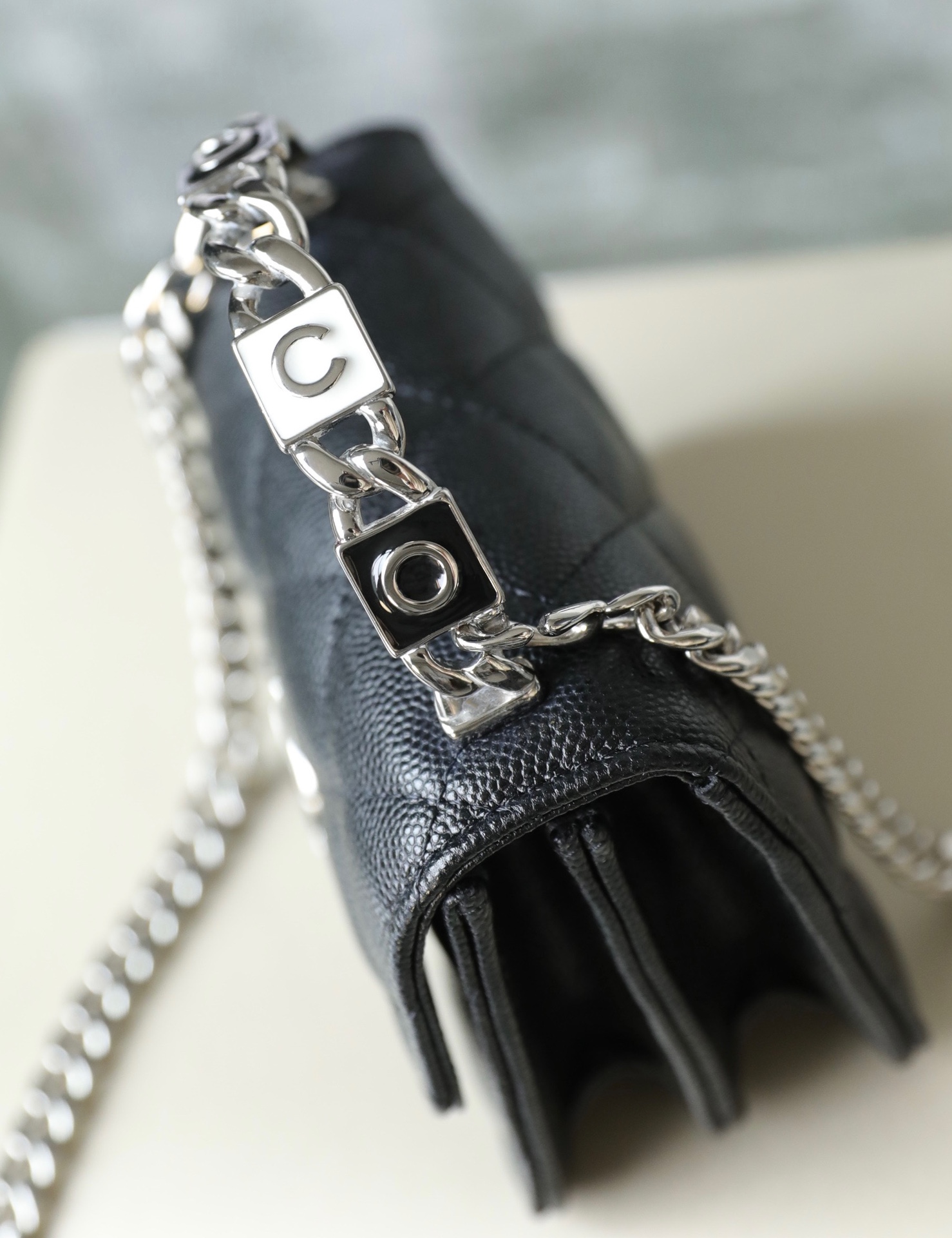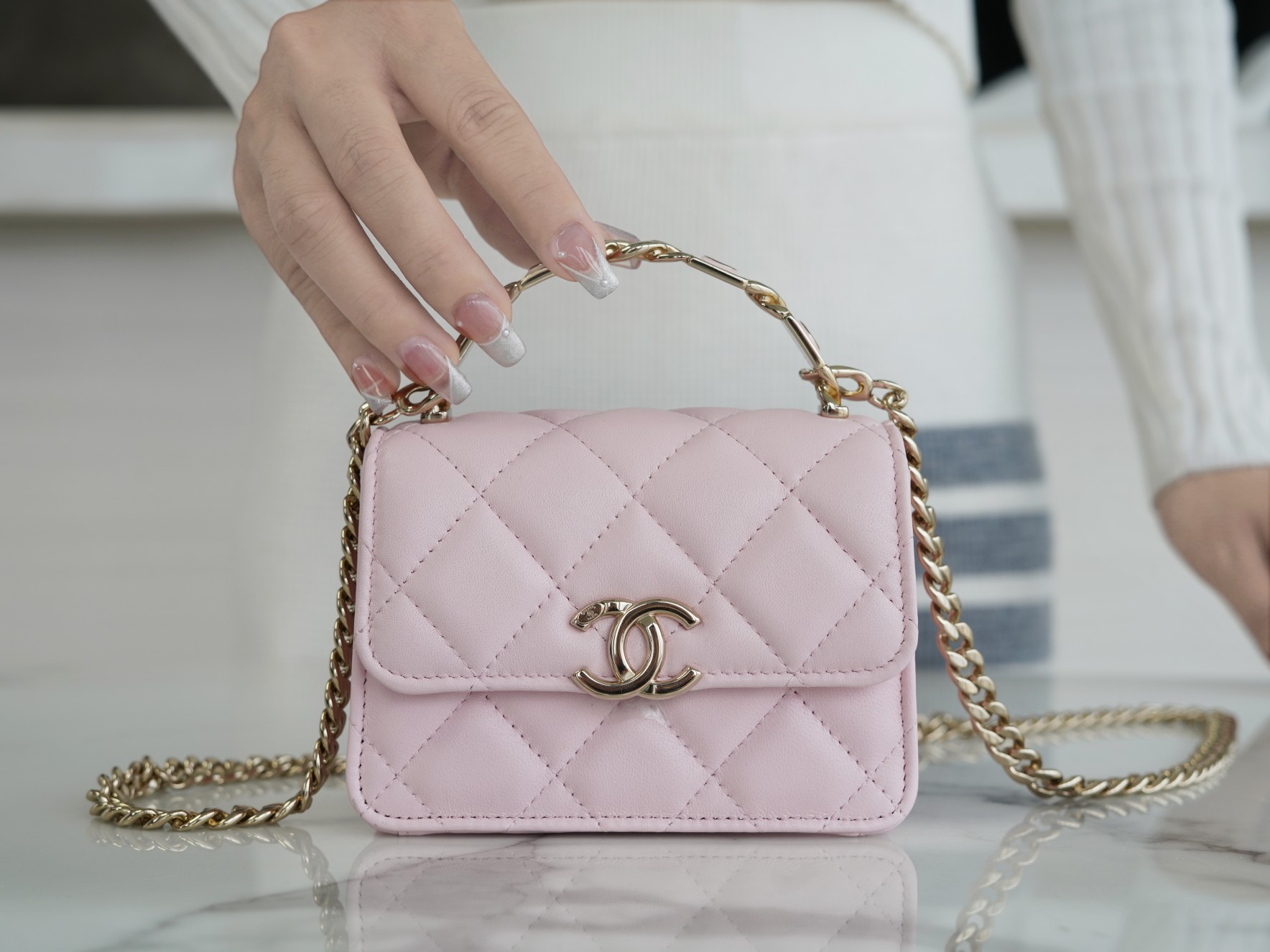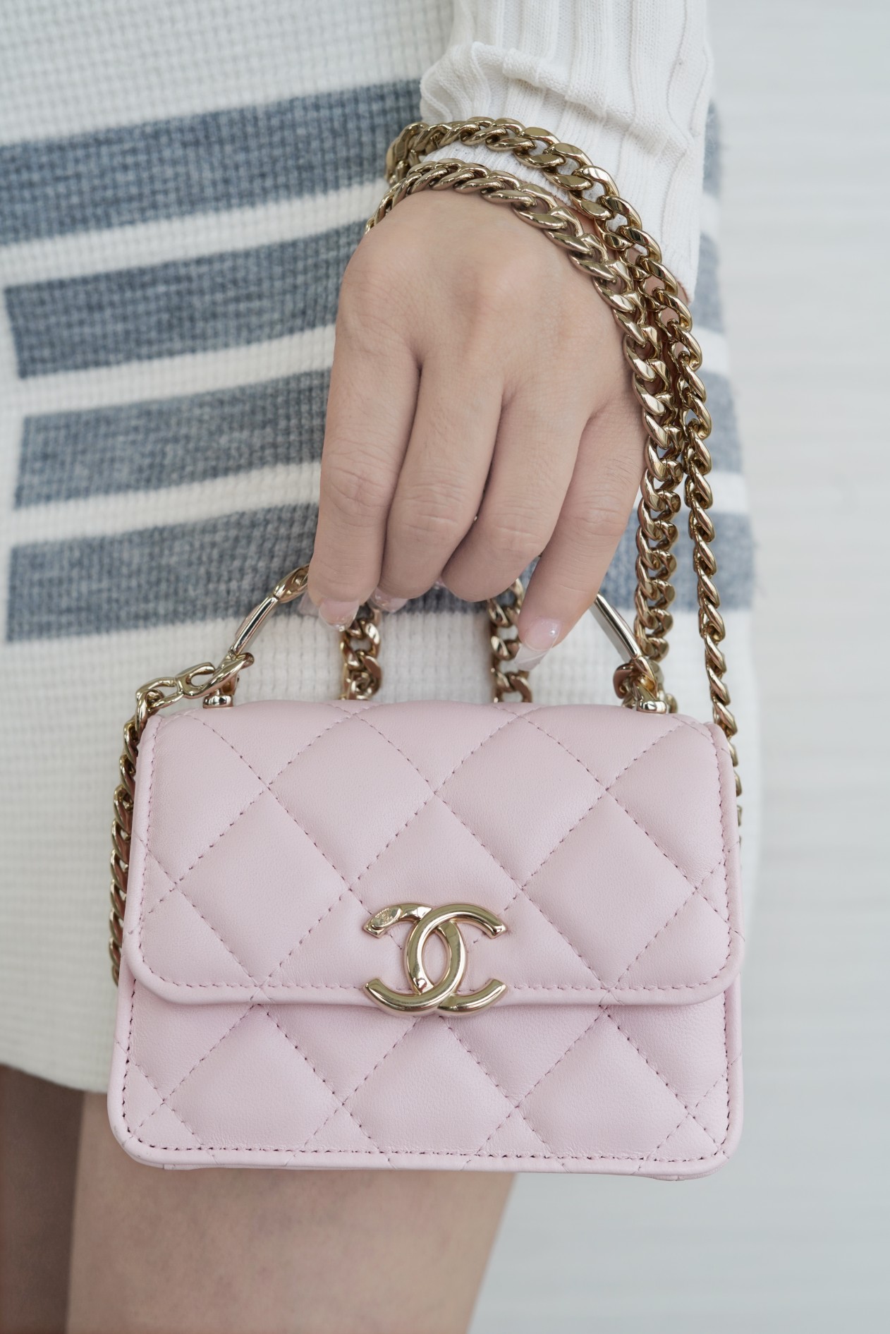 经典菱格纹+标志性双𝐂 𝐥𝐨𝐠𝐨设计,迷你包型搭配粗链条呈现出一种反差萌感,包里自带卡槽,链条⛓可拆卸,斜挎手拎都🉑,清新甜美的配色,完美俘获少女心,迷你包的快乐必须拥有!!