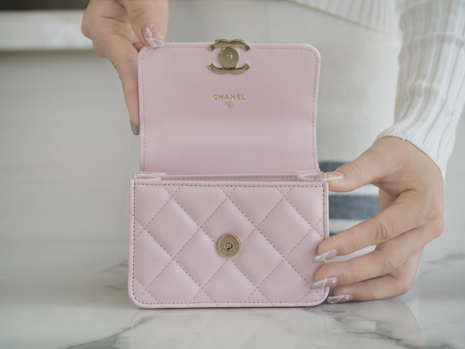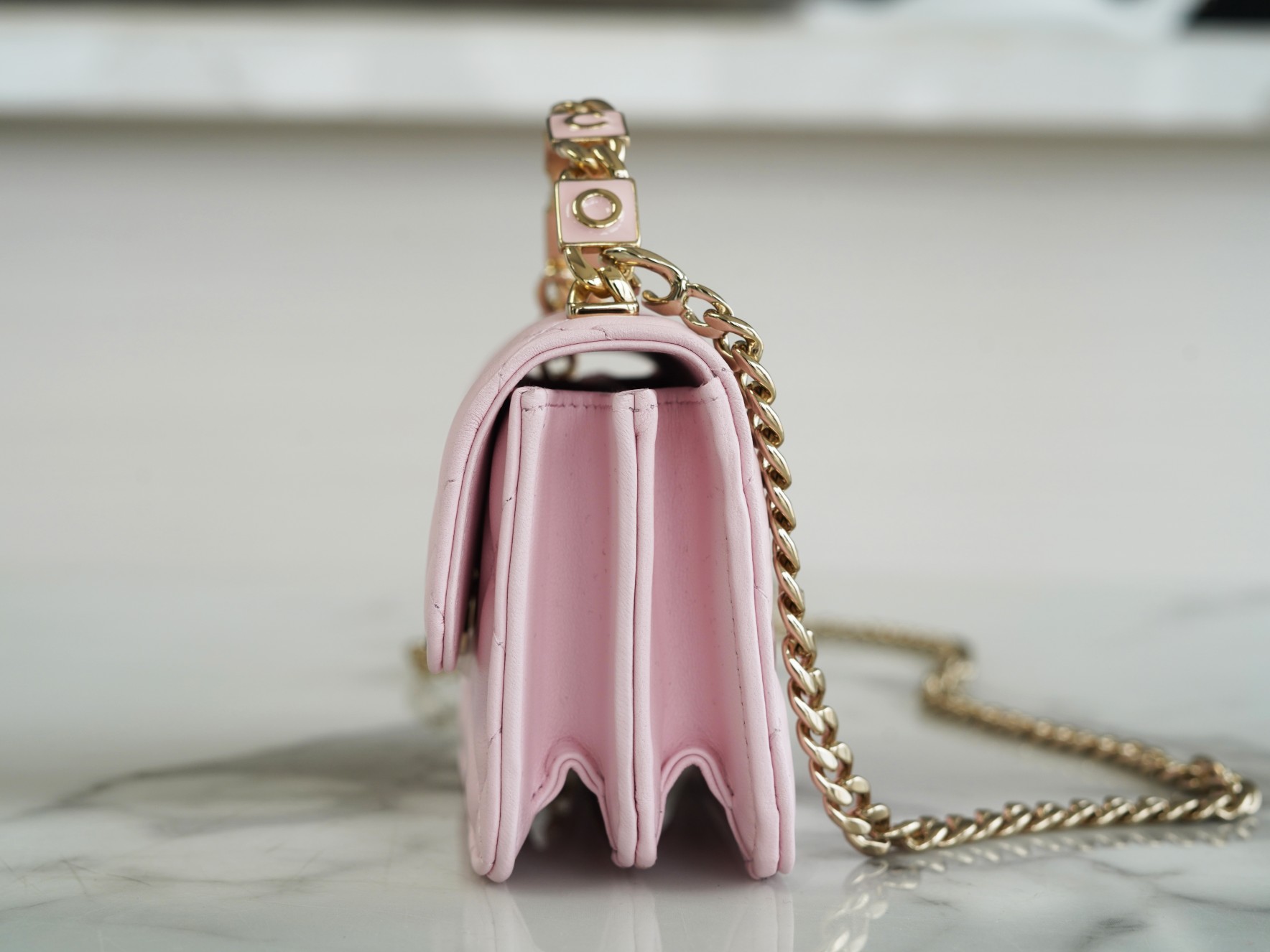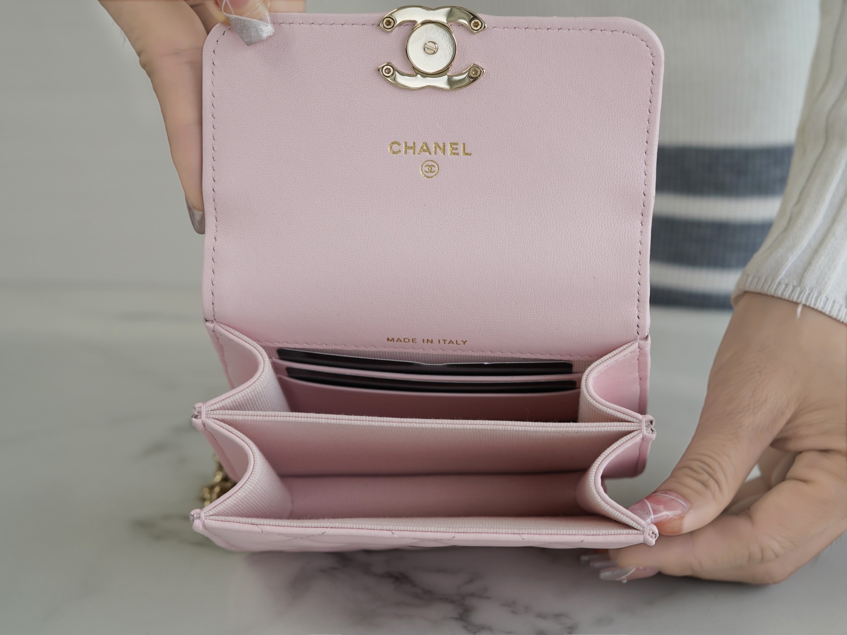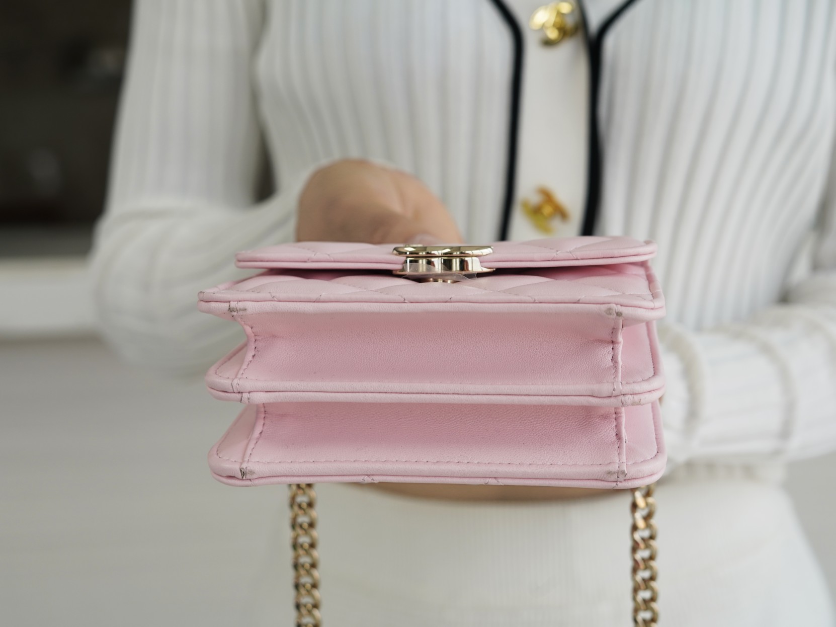 经典菱格纹+标志性双𝐂 𝐥𝐨𝐠𝐨设计,迷你包型搭配粗链条呈现出一种反差萌感,包里自带卡槽,链条⛓可拆卸,斜挎手拎都🉑,清新甜美的配色,完美俘获少女心,迷你包的快乐必须拥有!!