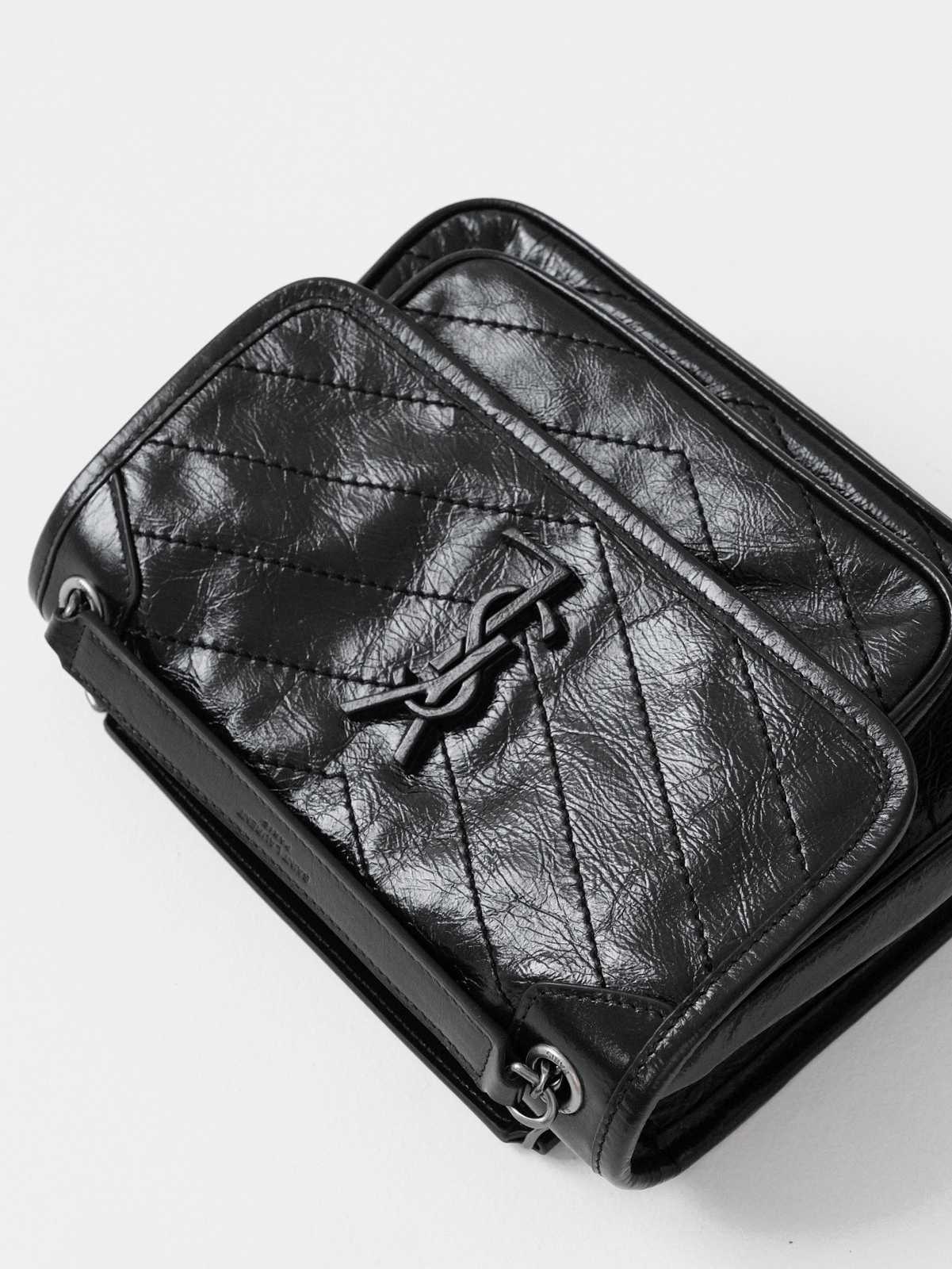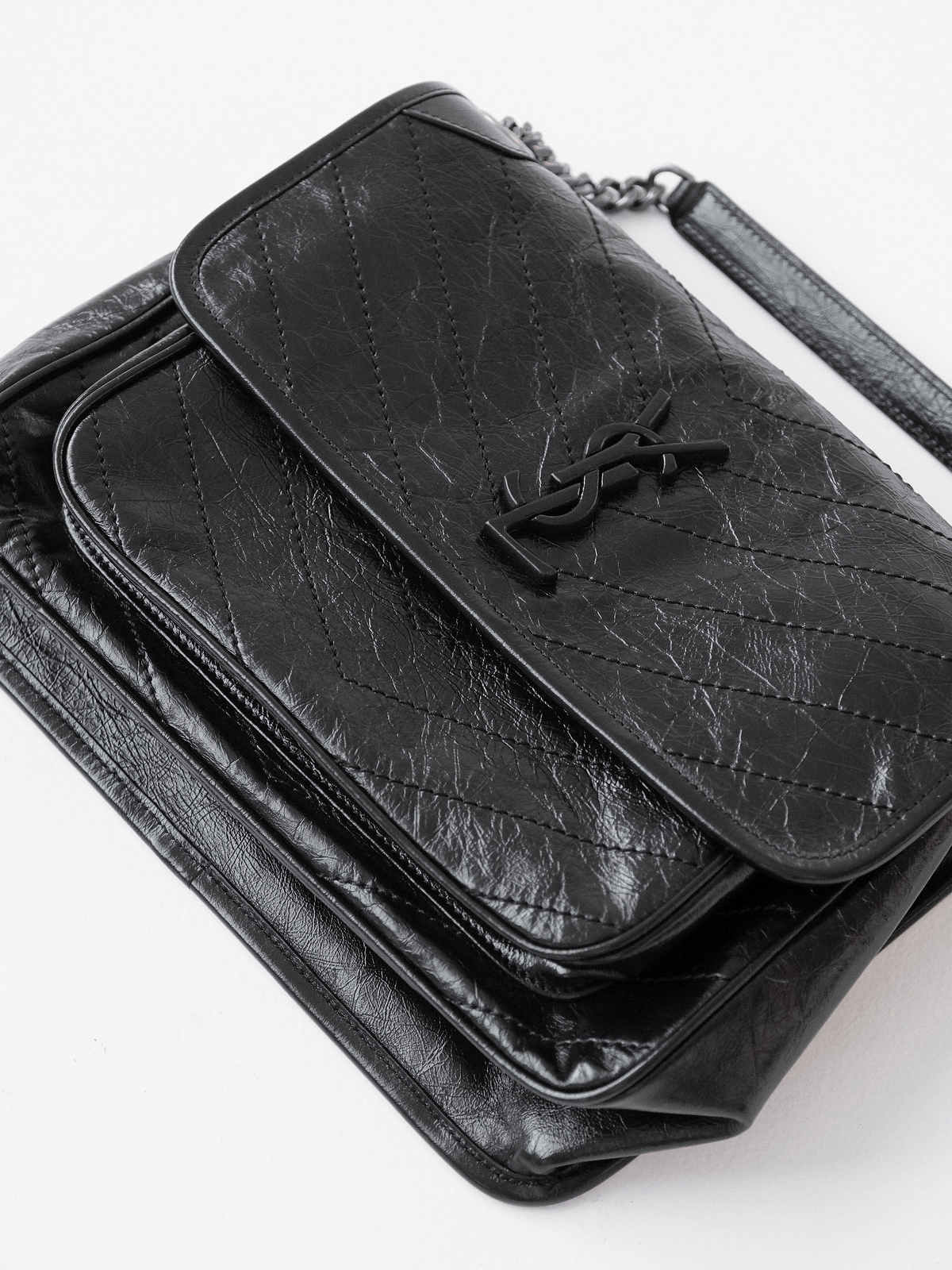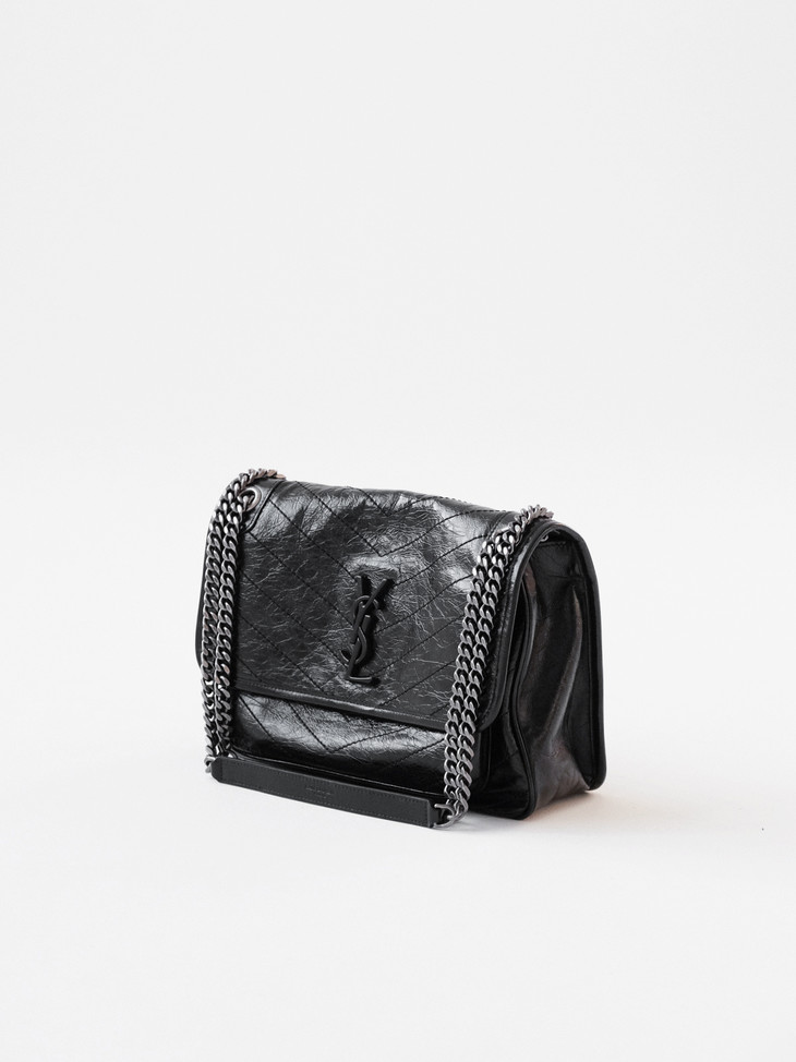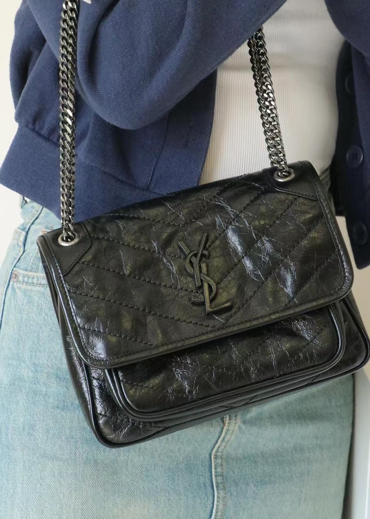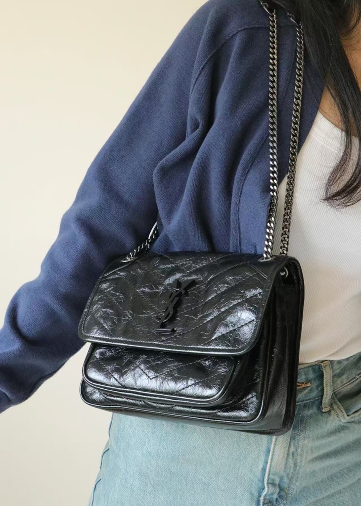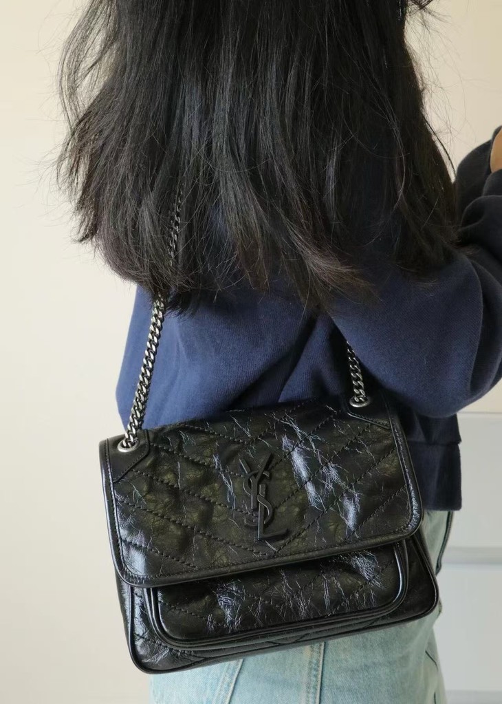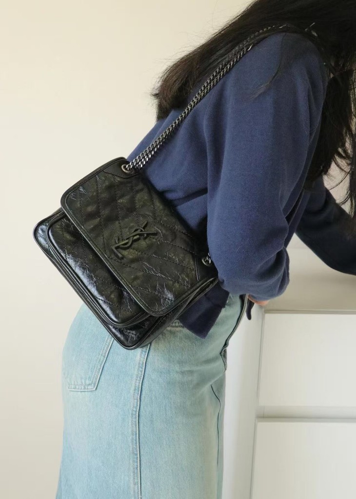 圣罗兰niki 黑链黑标LOGO复古褶皱 牛皮革 流浪包斜挎单肩包 22/28CM小中号双尺寸(ZJ)