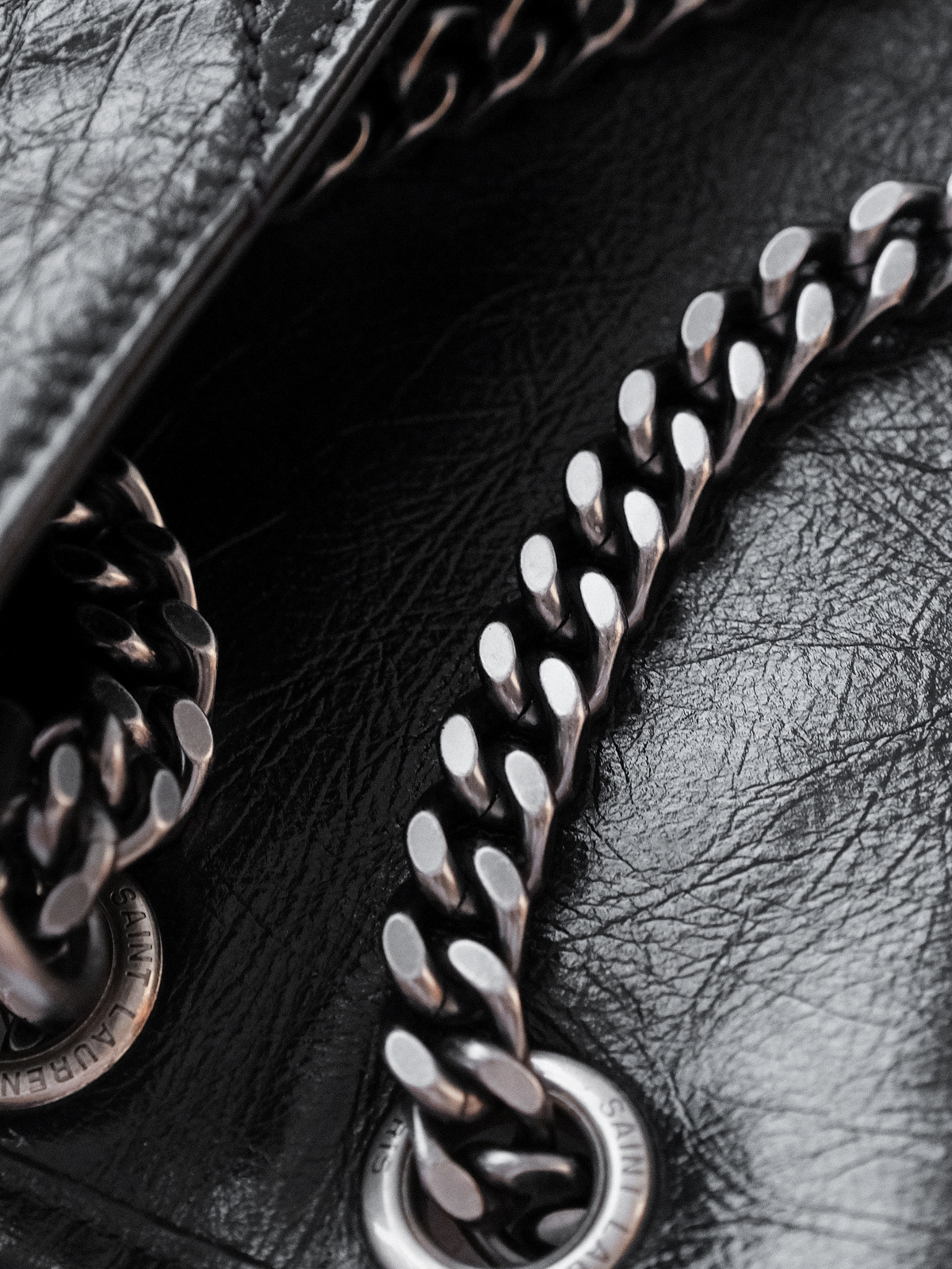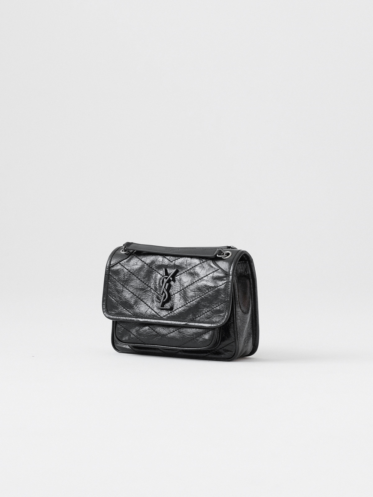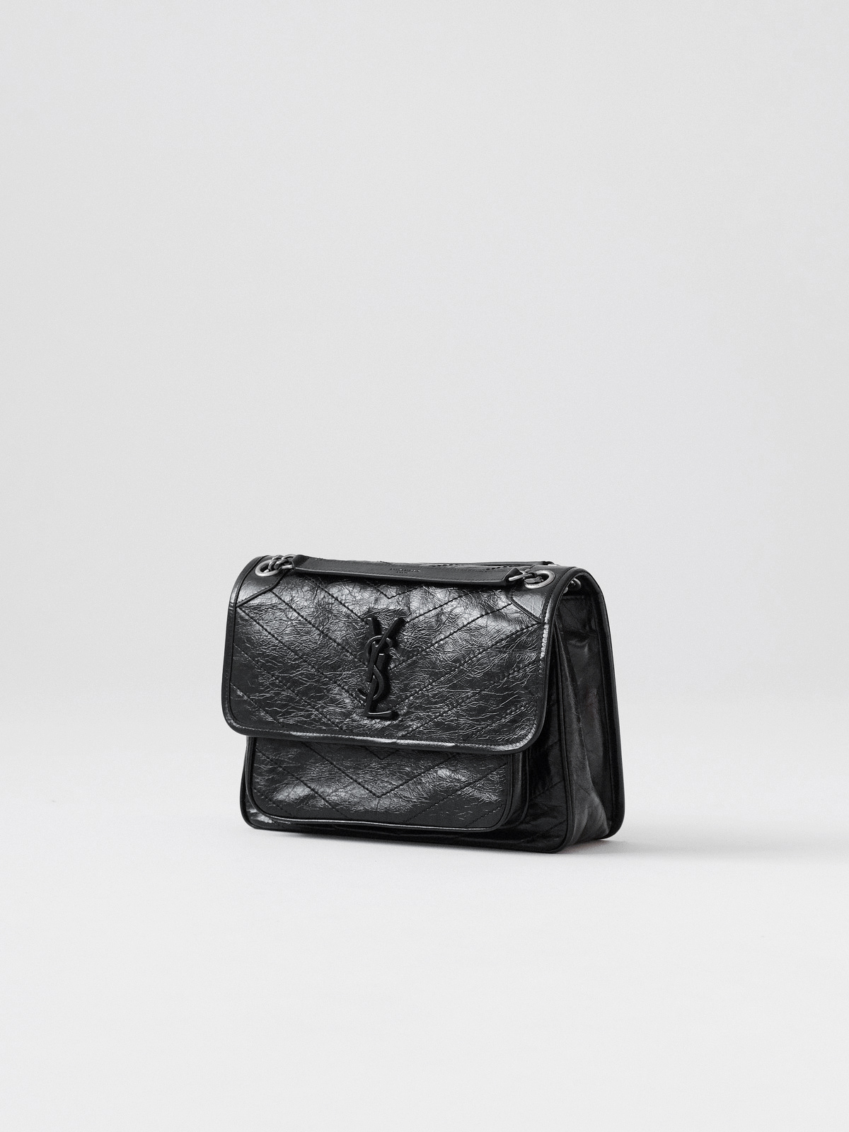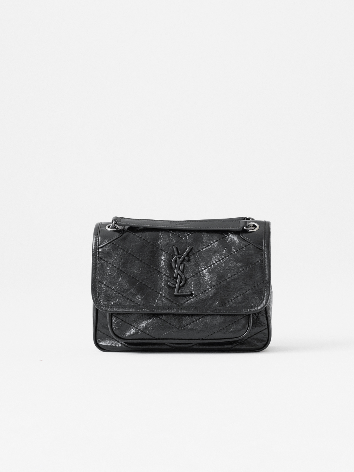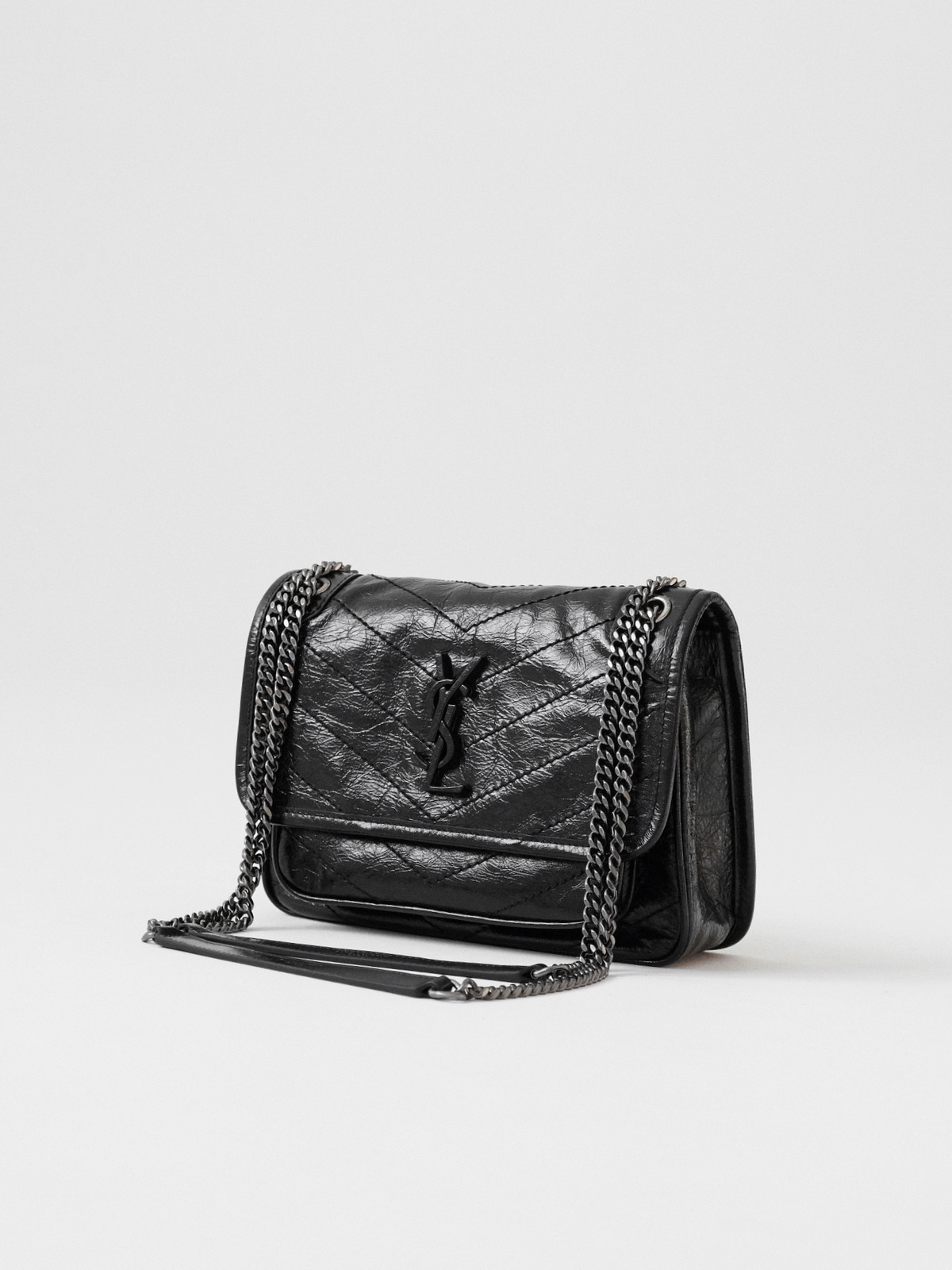 圣罗兰niki 黑链黑标LOGO复古褶皱 牛皮革 流浪包斜挎单肩包 22/28CM小中号双尺寸(ZJ)