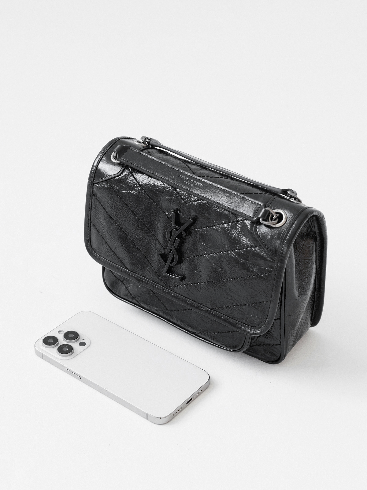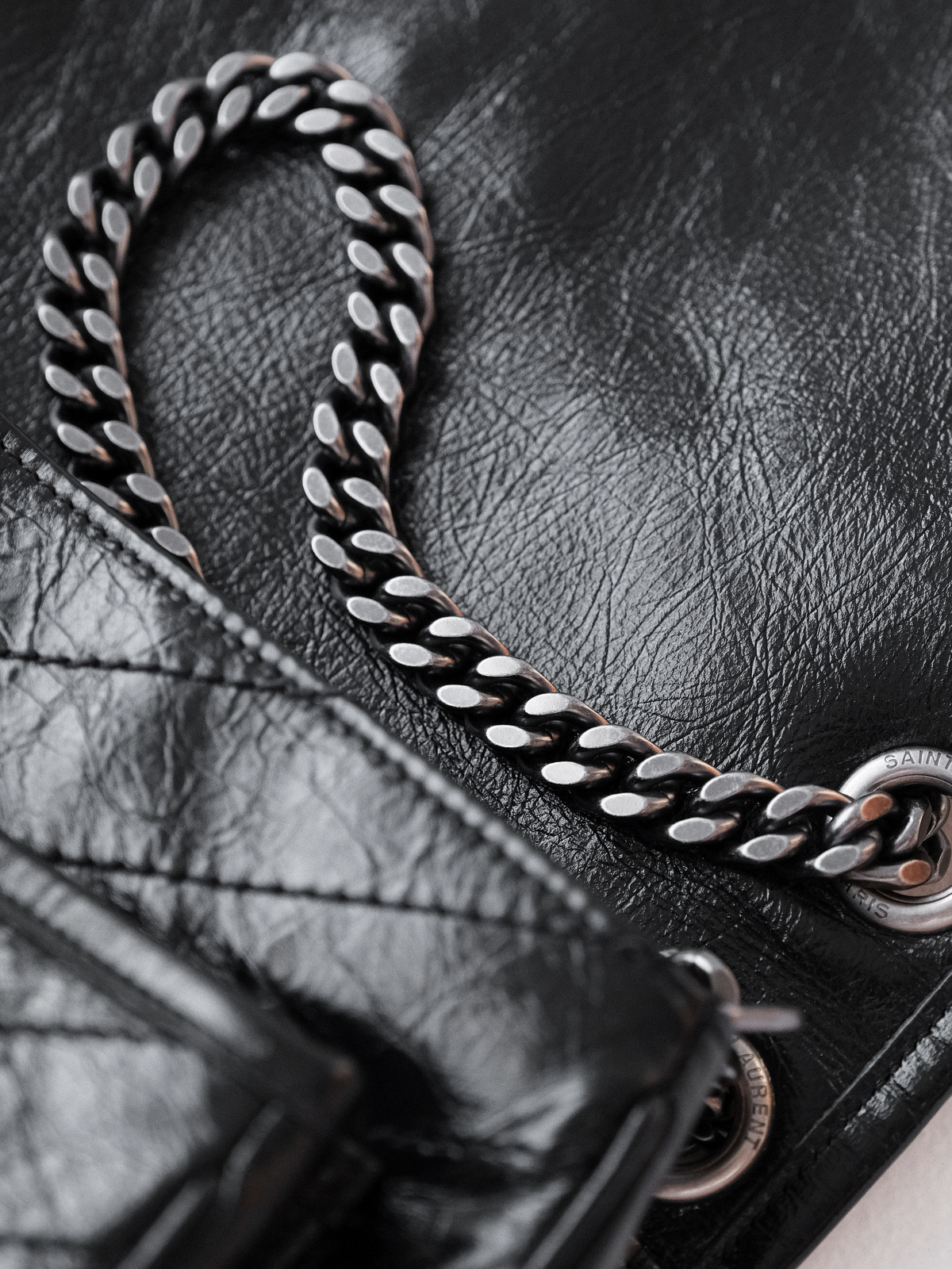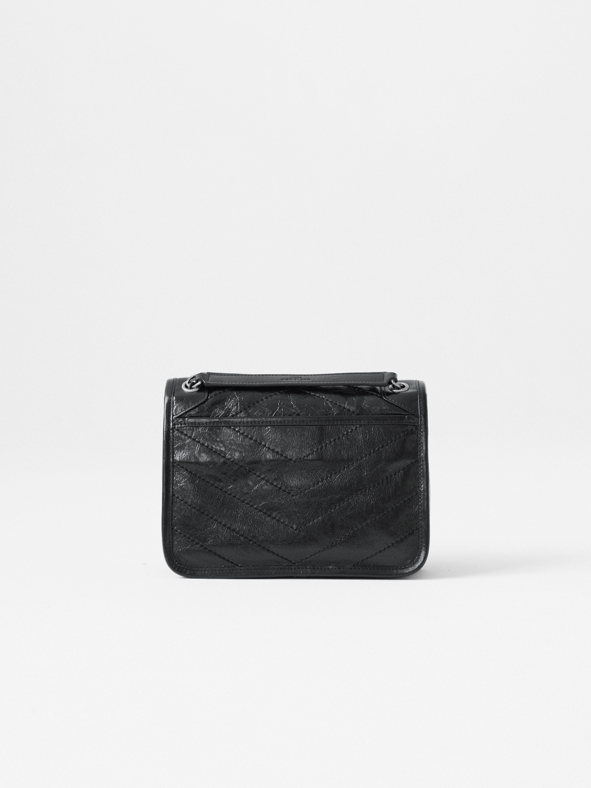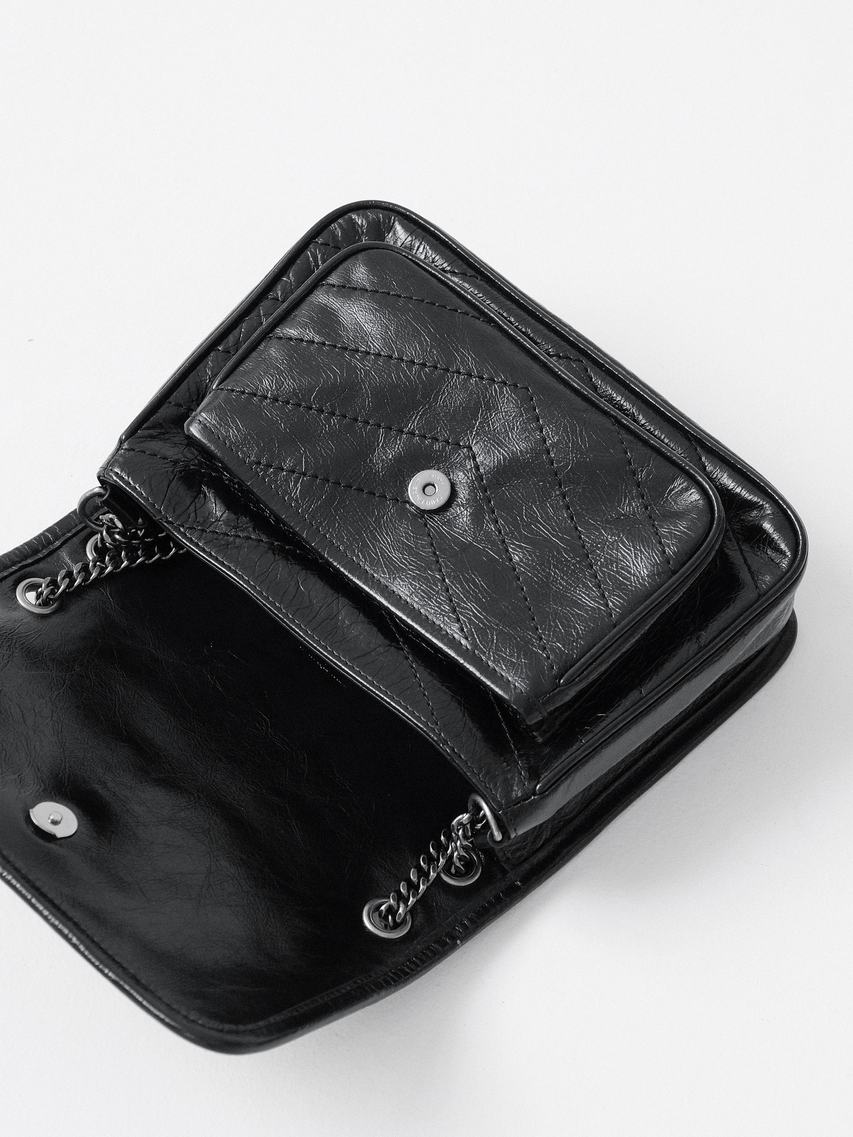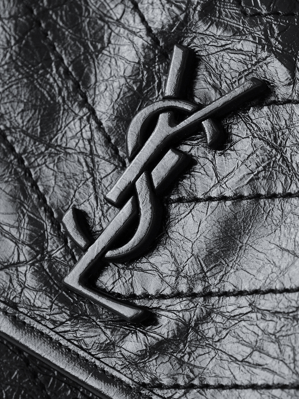圣罗兰niki 黑链黑标LOGO复古褶皱 牛皮革 流浪包斜挎单肩包 22/28CM小中号双尺寸(ZJ)