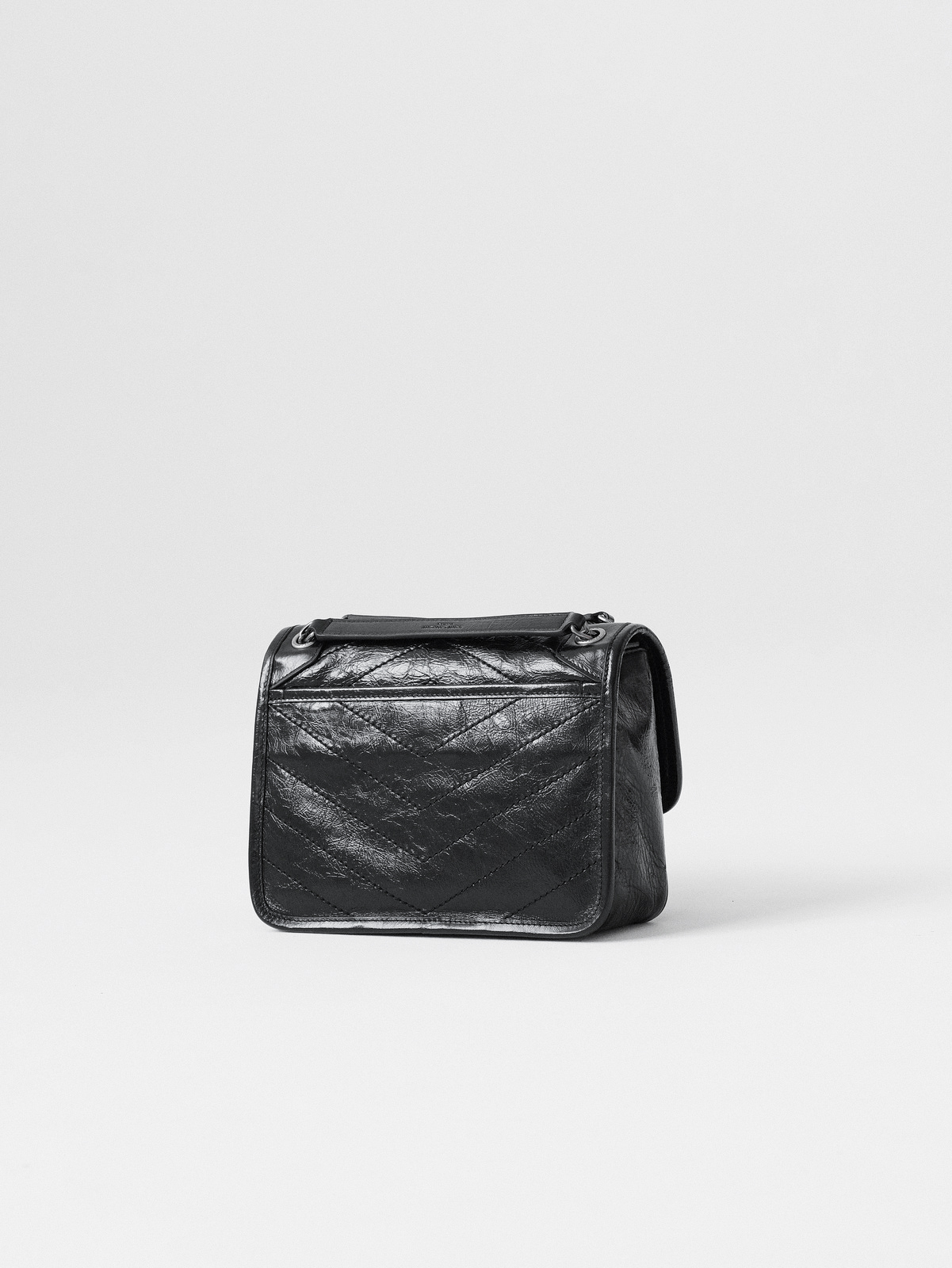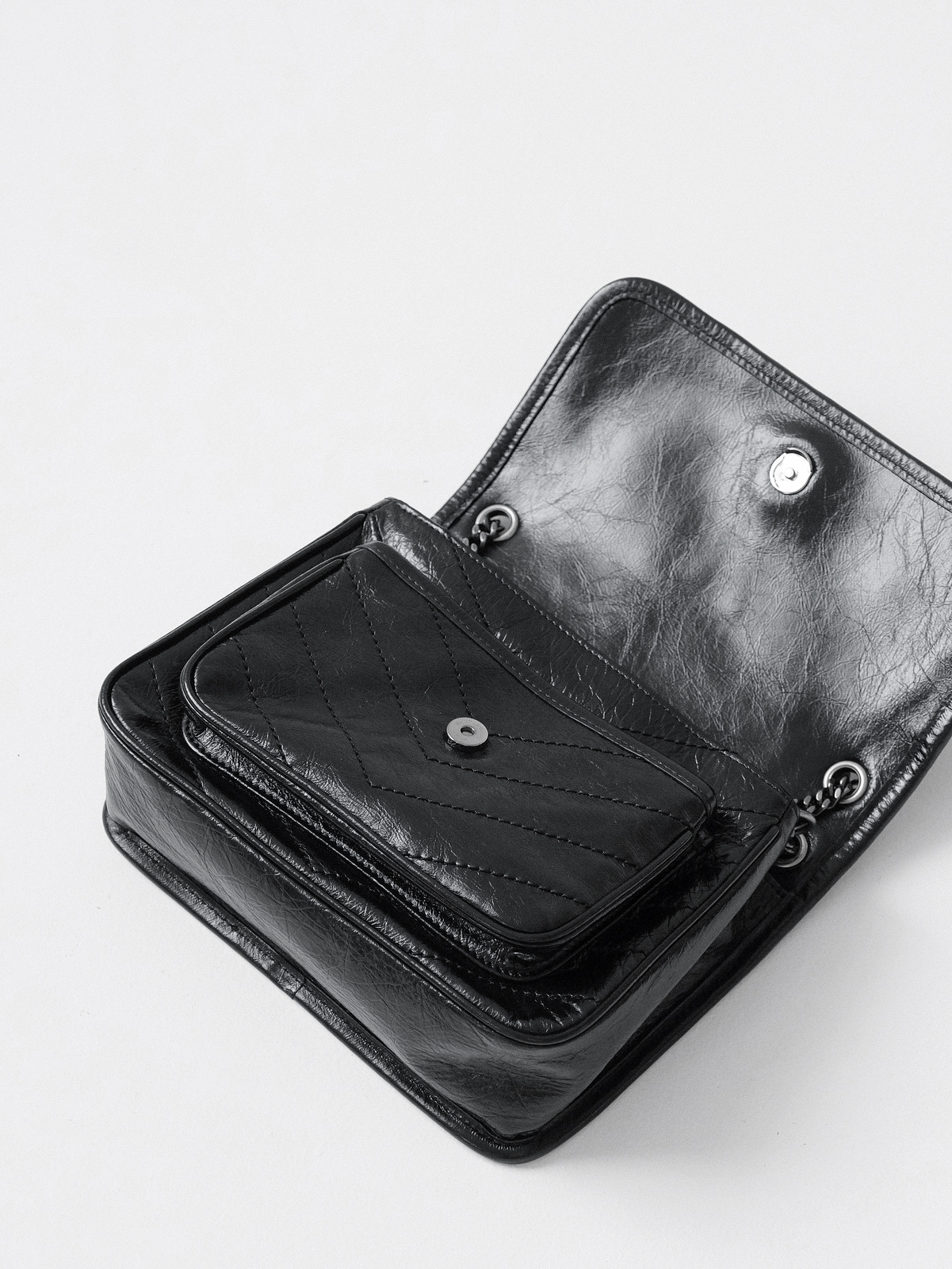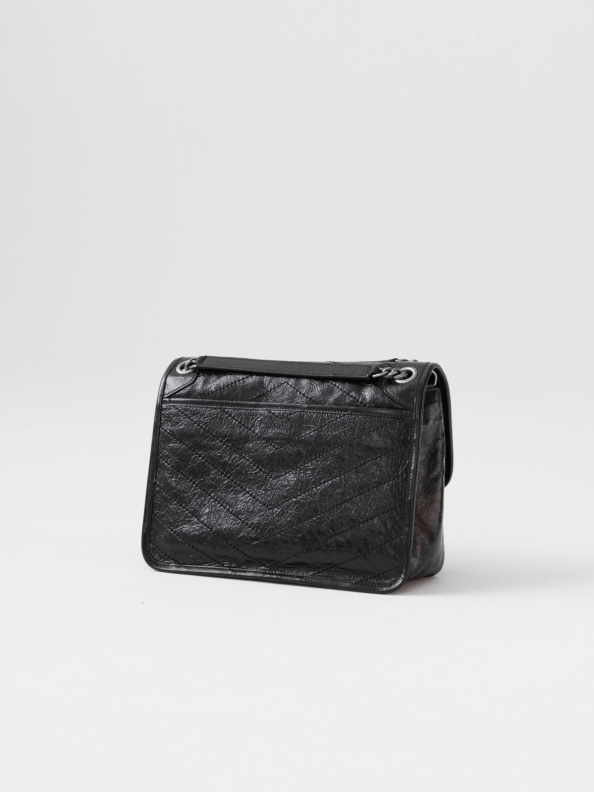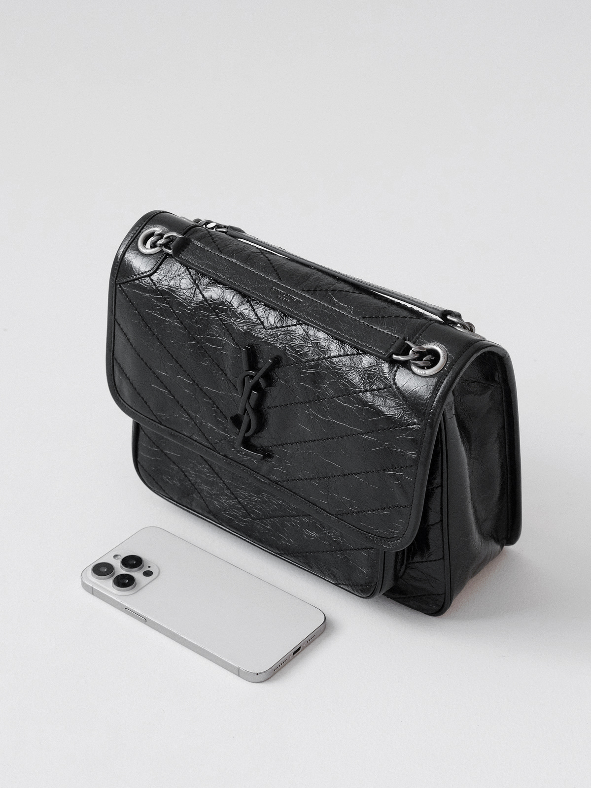 圣罗兰niki 黑链黑标LOGO复古褶皱 牛皮革 流浪包斜挎单肩包 22/28CM小中号双尺寸(ZJ)