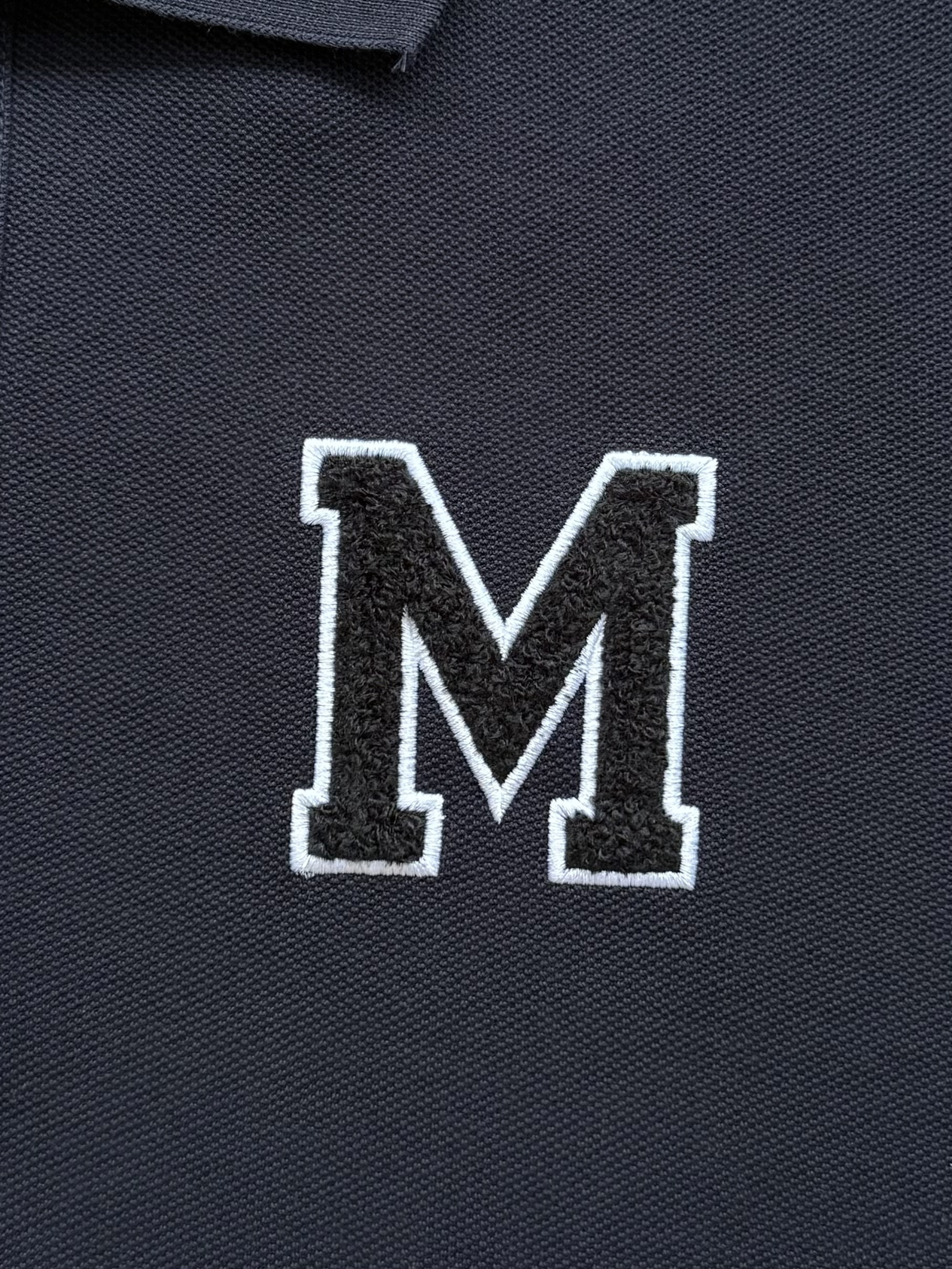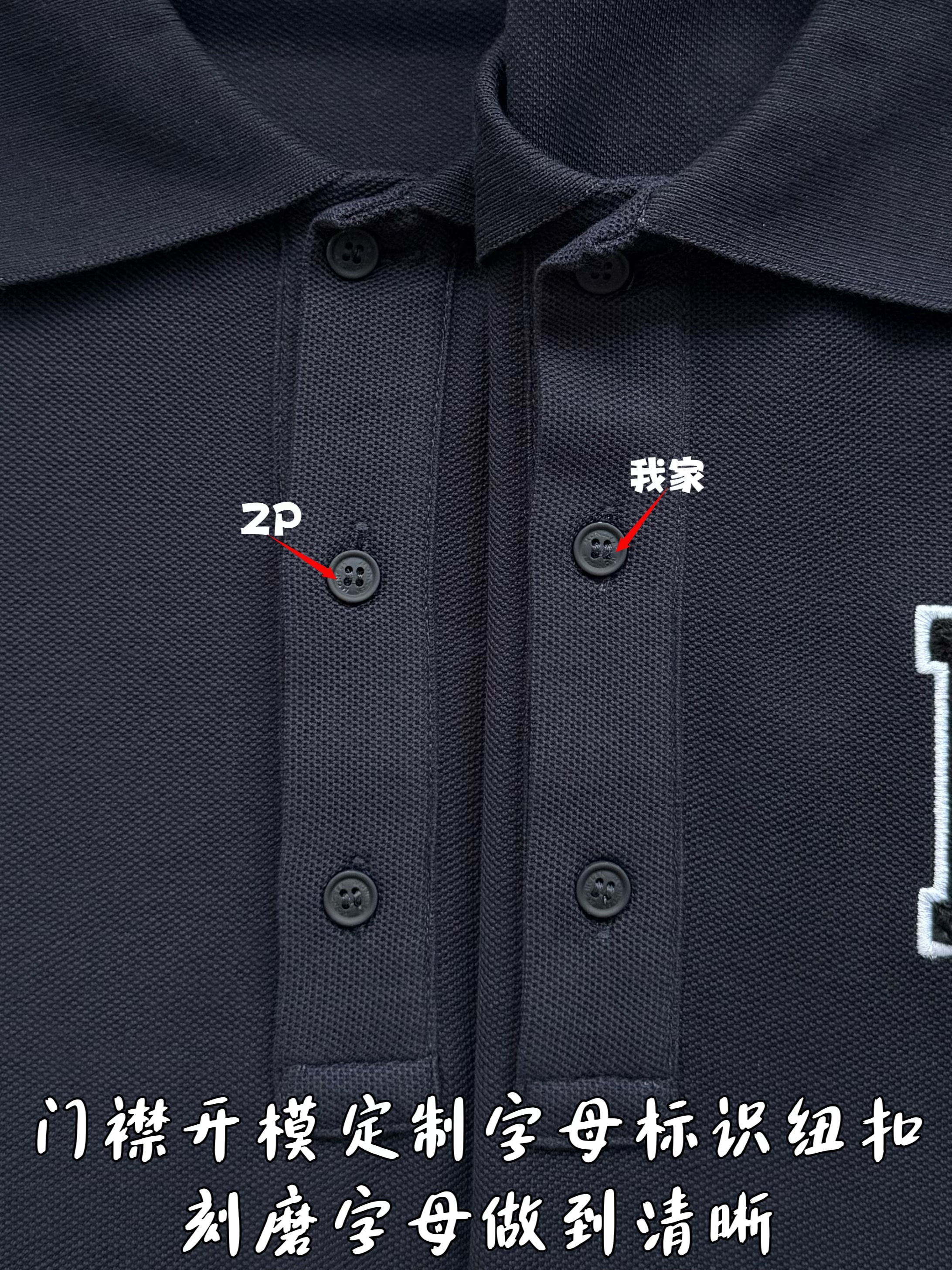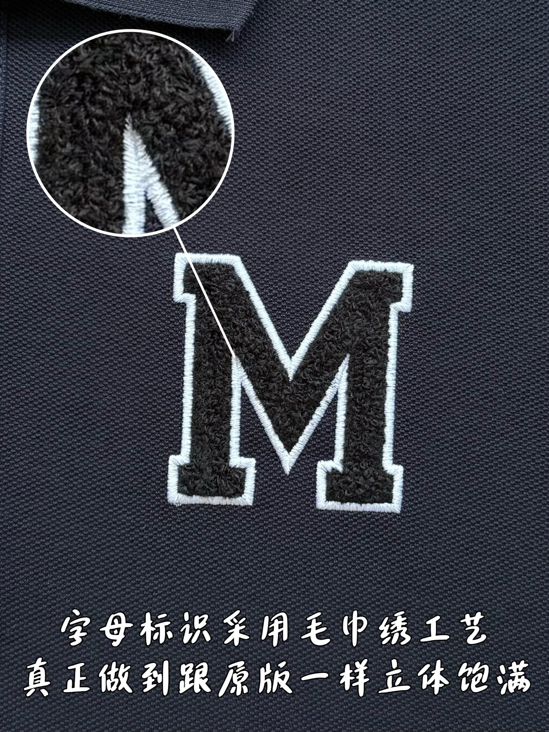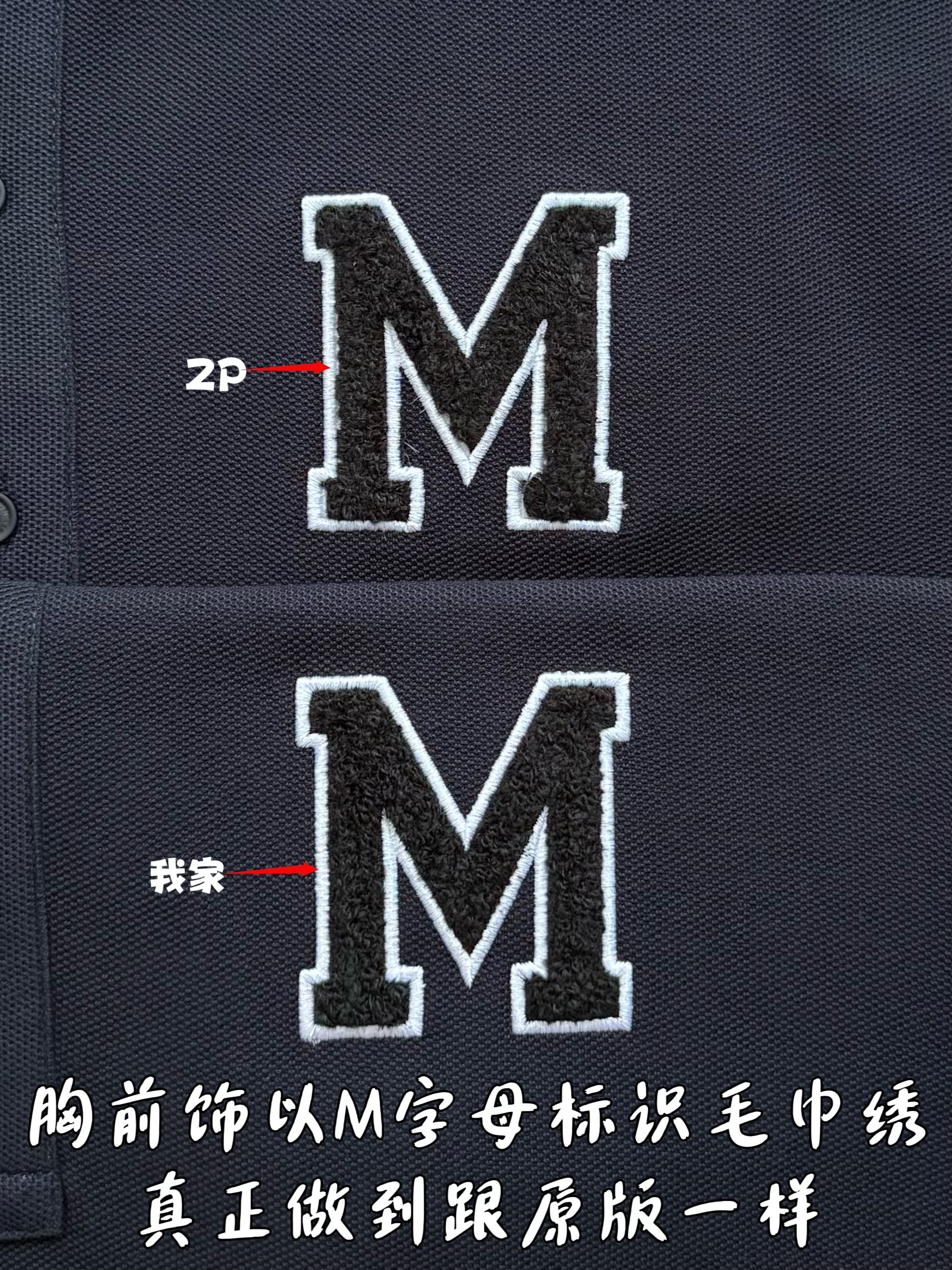 整件衣服3700购买ZP拆解打造,定制藏蓝色珠地棉面料,做到100%全棉进口纱线,定制标志性罗纹polo领,袖口,门襟开模定制字母标识纽扣,胸前饰以M字母毛巾绣贴饰,袖口饰以字母标识logo毛毡刺绣贴饰,真正做到1:1copy 闭眼入